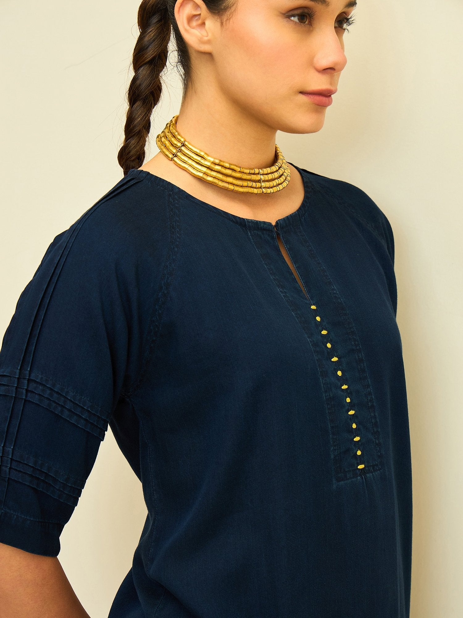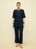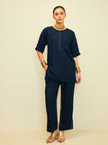 A bold take on everyday denim, this co-ord blends clean tailoring with subtle metallic detailing. The relaxed half-sleeve top features a structured round neckline and minimal front placket accented with delicate stud work — adding just the right amount of edge.