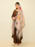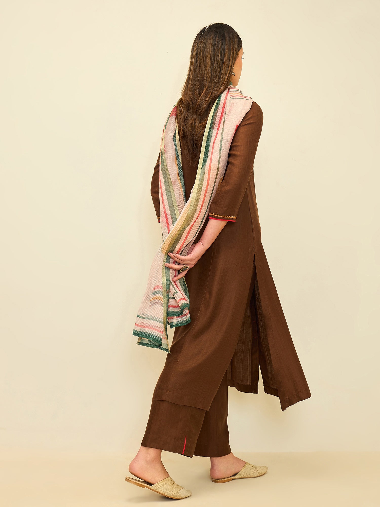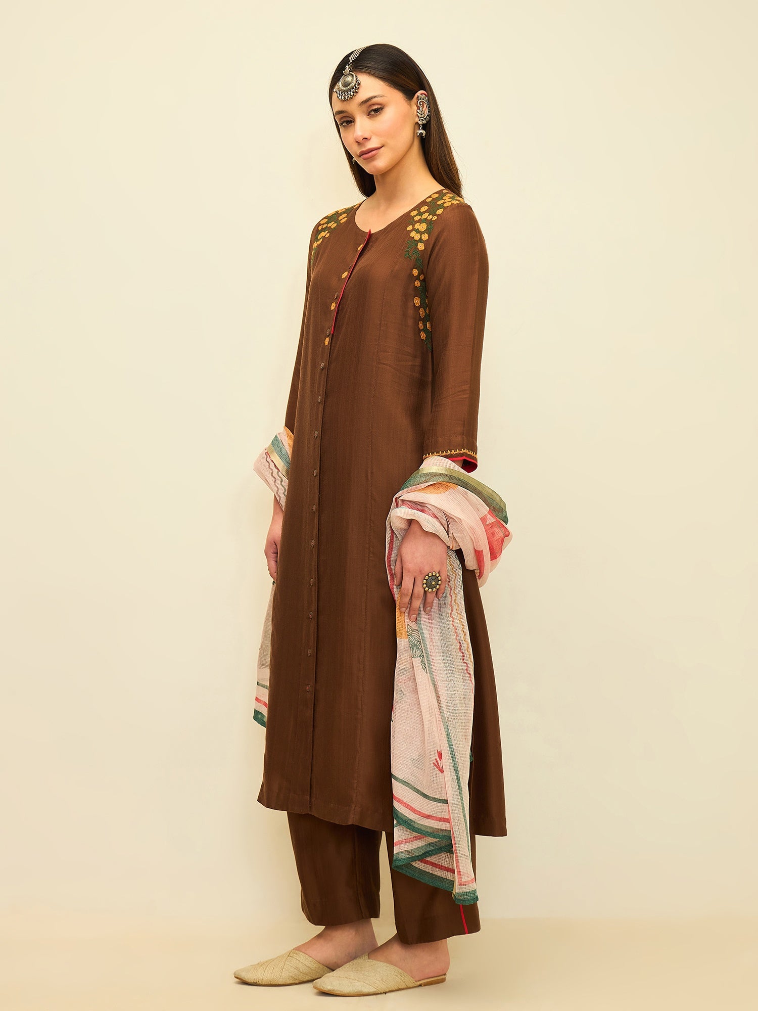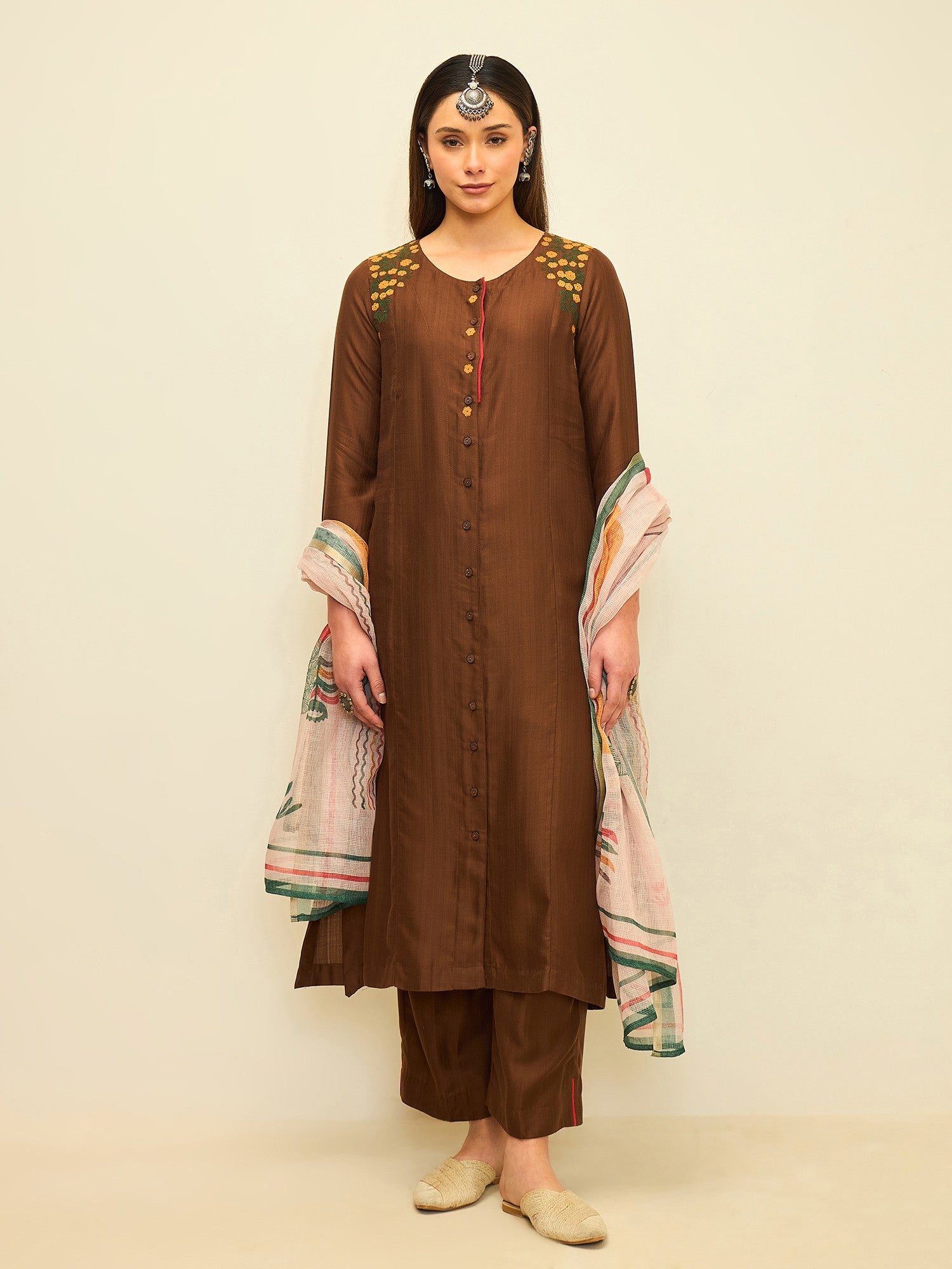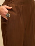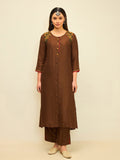 Rooted in earthy elegance, this kurta set blends rich tones with delicate handcrafted accents. The warm rustic hue is complemented by subtle embroidery along the neckline and shoulder, adding character while maintaining a clean and graceful silhouette.