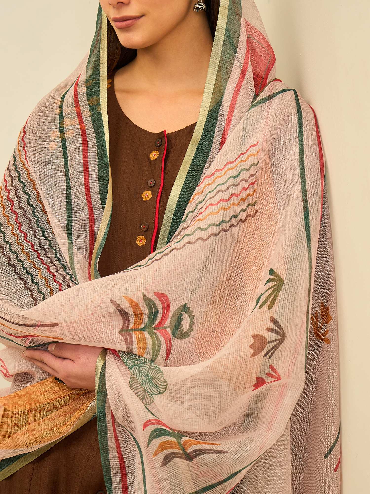 Crafted in breathable cotton, the kurta offers all-day comfort with a natural, relaxed fall. Paired with straight pants and a beautifully printed dupatta featuring traditional motifs and borders, the ensemble creates a look that feels timeless, grounded, and effortlessly refined.
