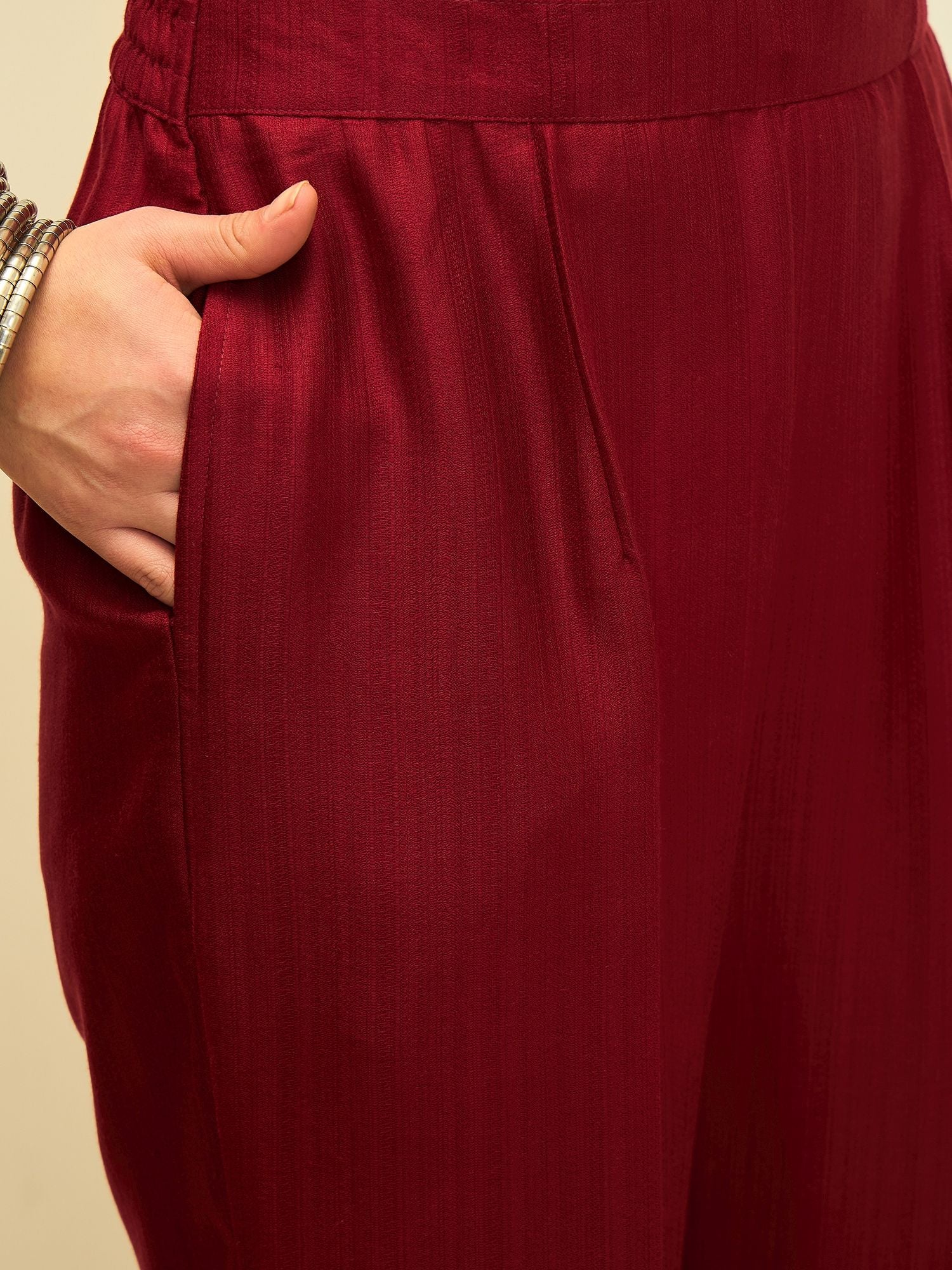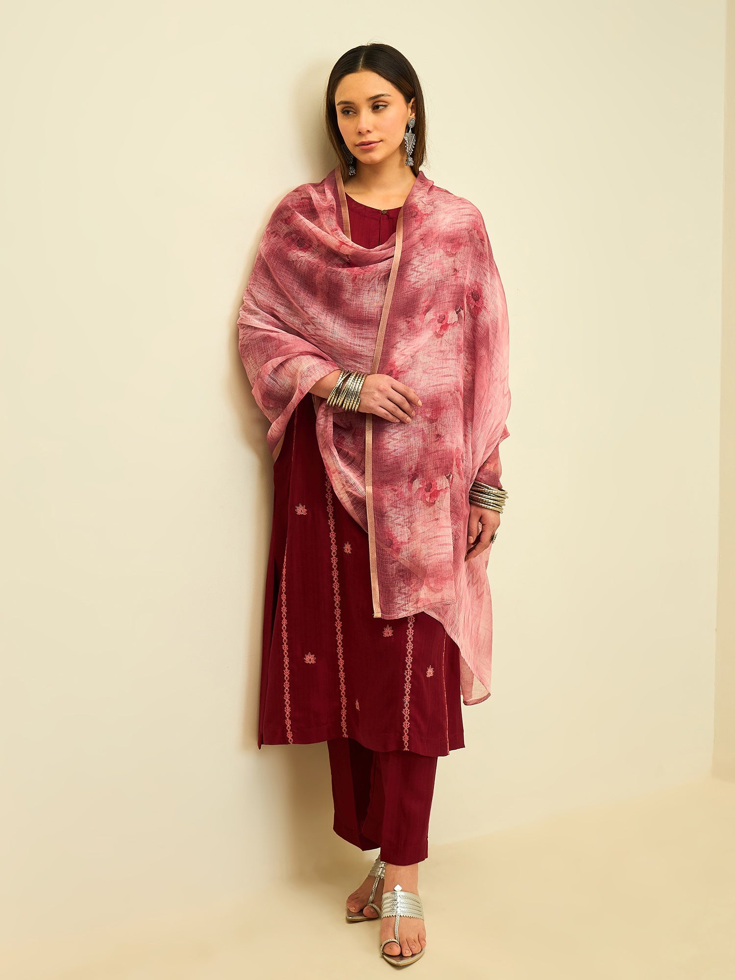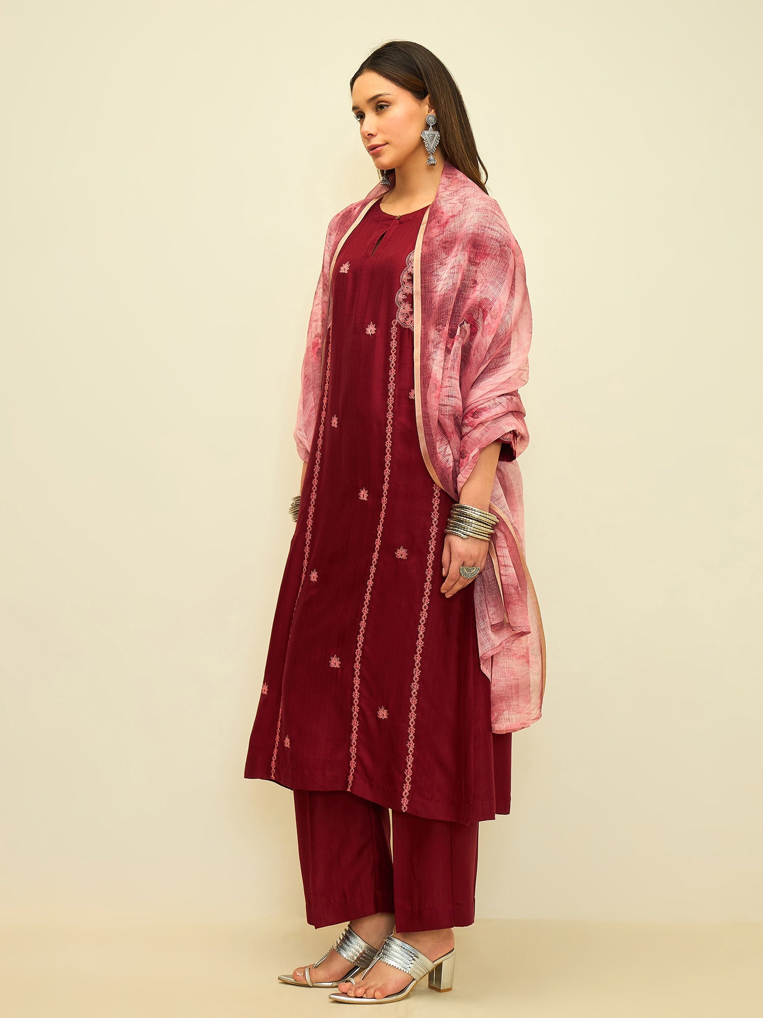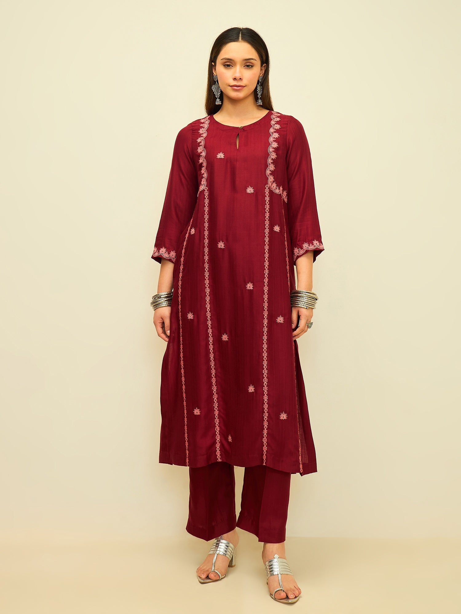 Elegant and quietly striking, this kurta set captures the beauty of refined craftsmanship in a rich crimson hue. Delicate embroidered motifs run gracefully along the length of the kurta, adding texture and subtle charm to its clean silhouette.