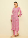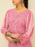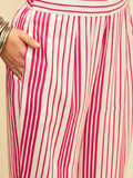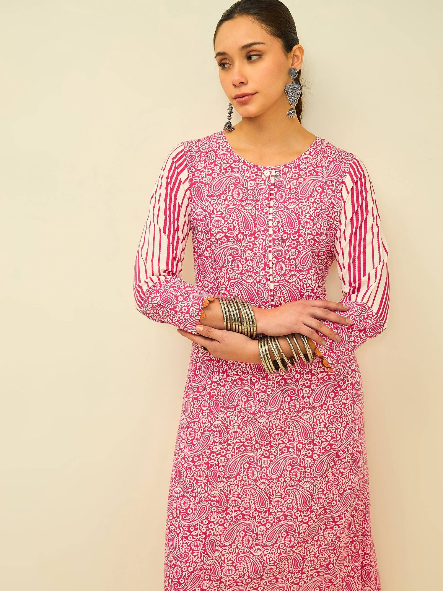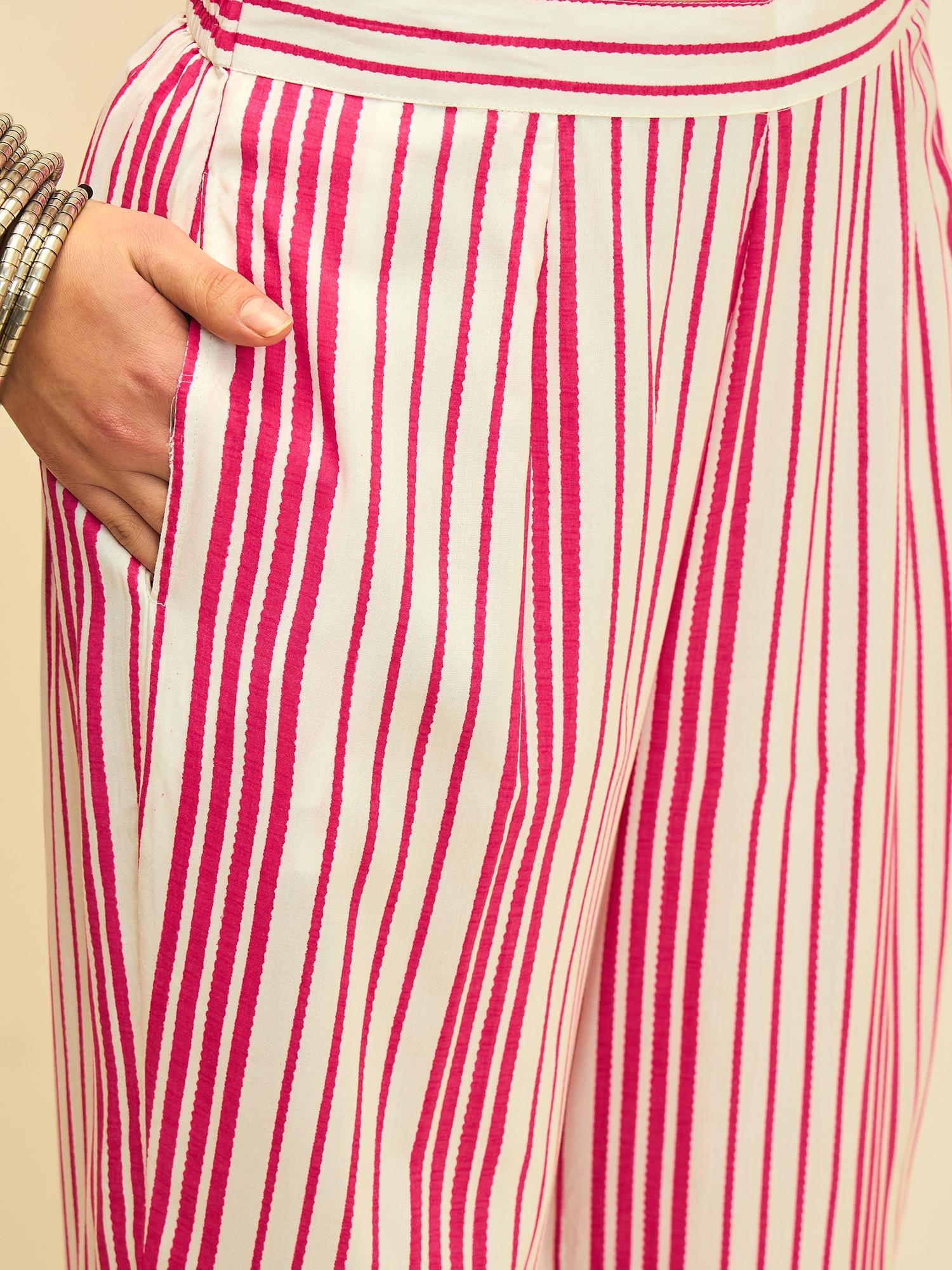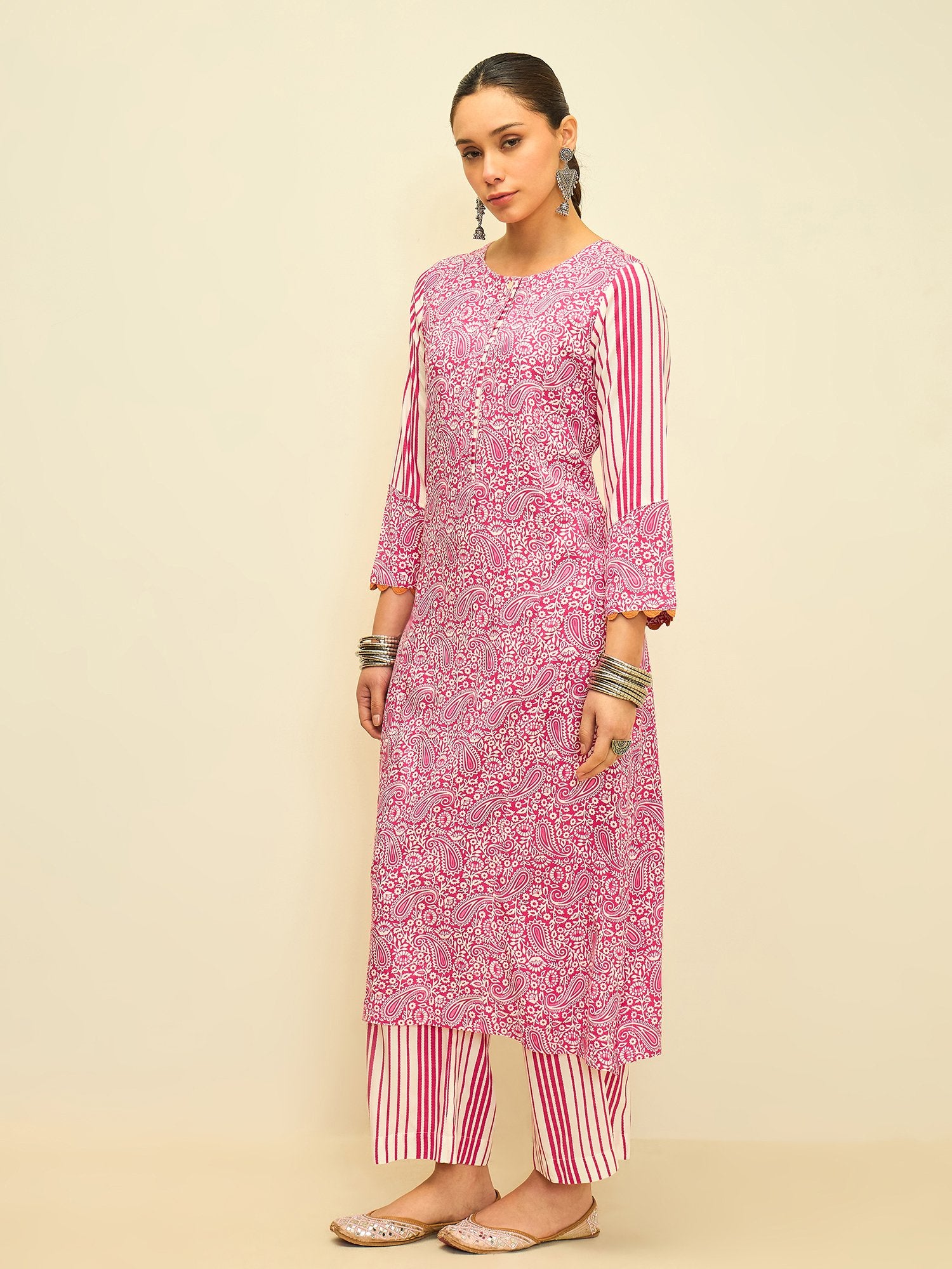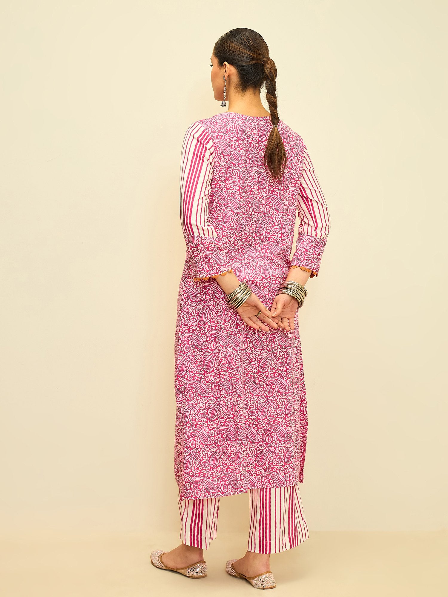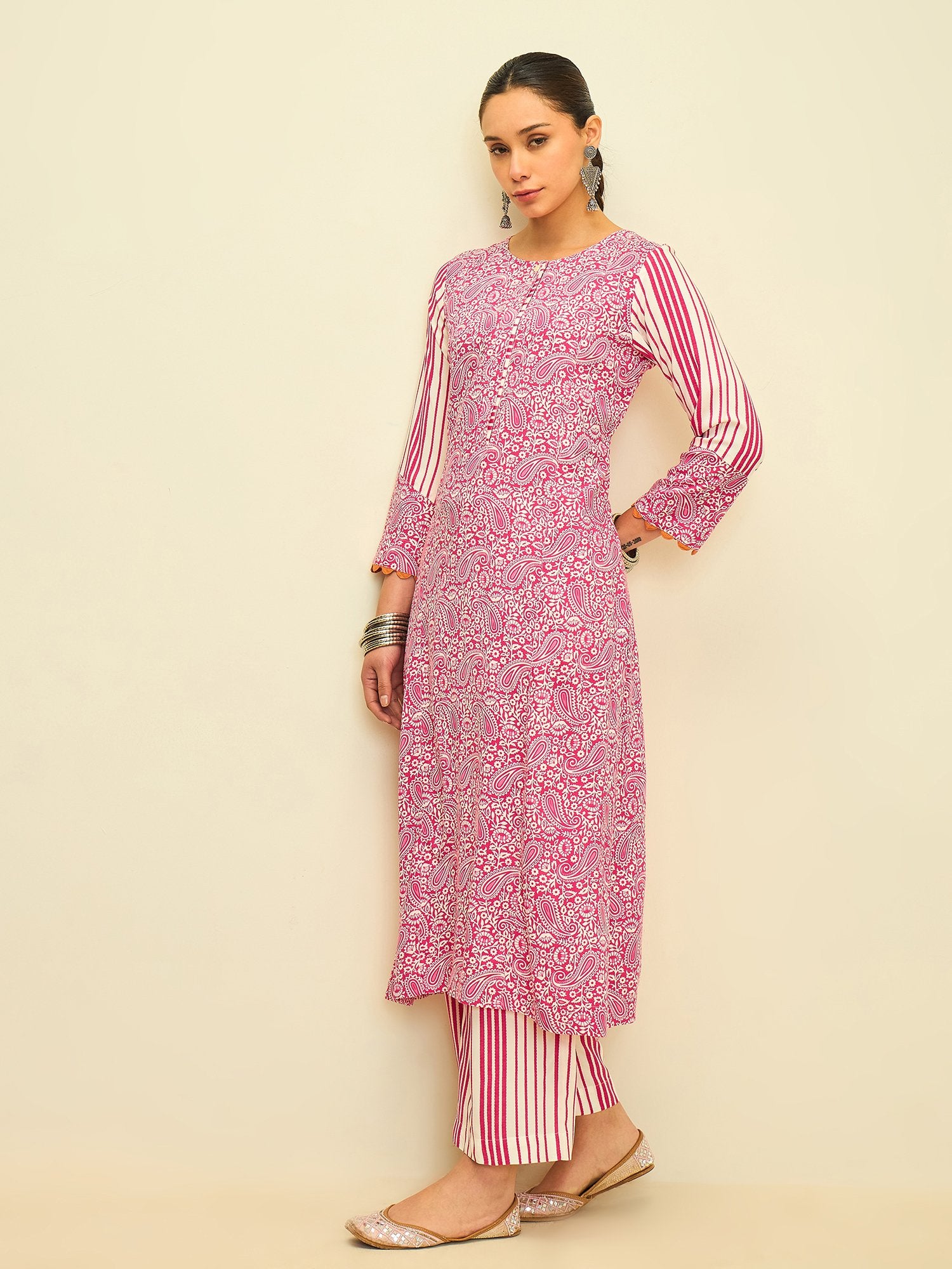 Playful yet refined, this kurta set brings together vibrant color and timeless patterns. The lively rose hue is adorned with intricate paisley prints, while the contrasting striped sleeves and pants add a modern touch to the classic silhouette.