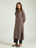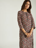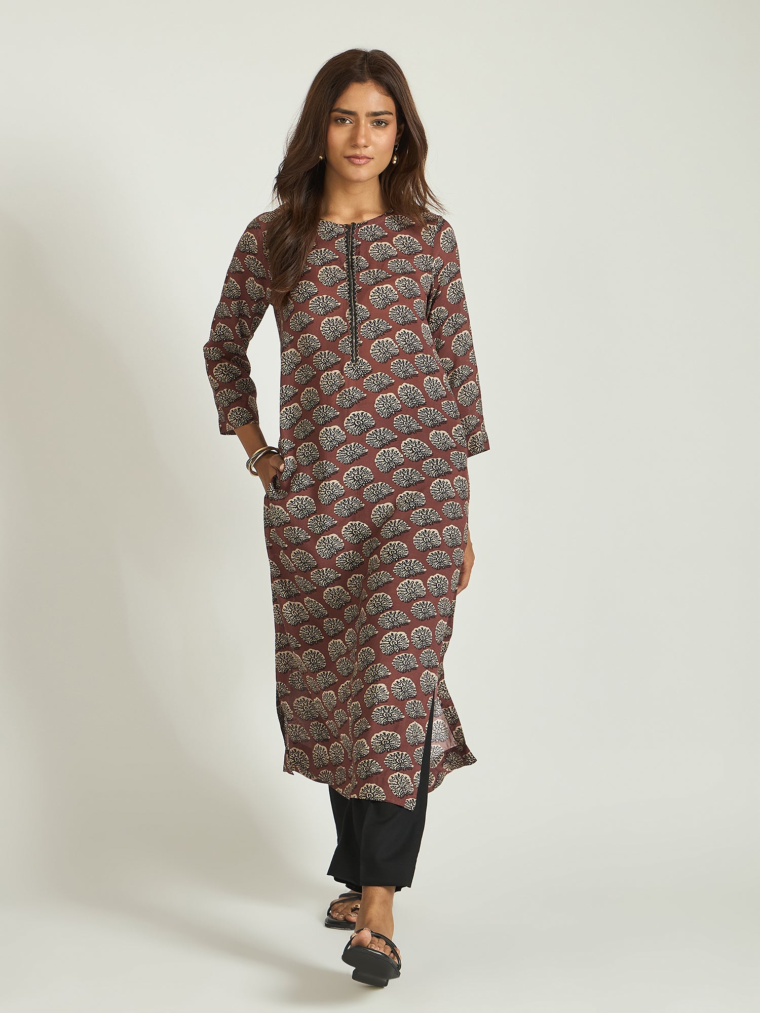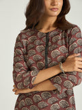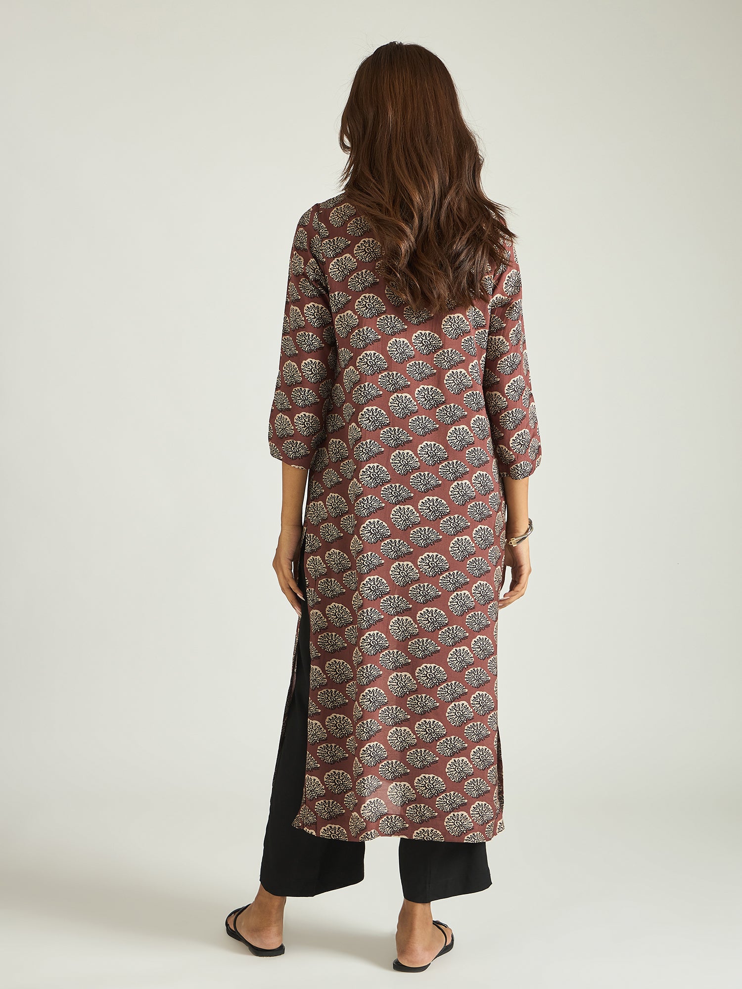 Rooted in earthy elegance, this muslin kurta set features a rich rust base adorned with intricate leaf motifs that bring a subtle handcrafted charm. The clean silhouette, paired with contrast black trousers, creates a balanced look that is both grounded and contemporary.
