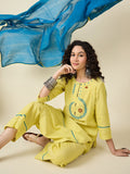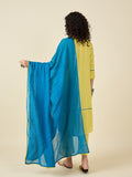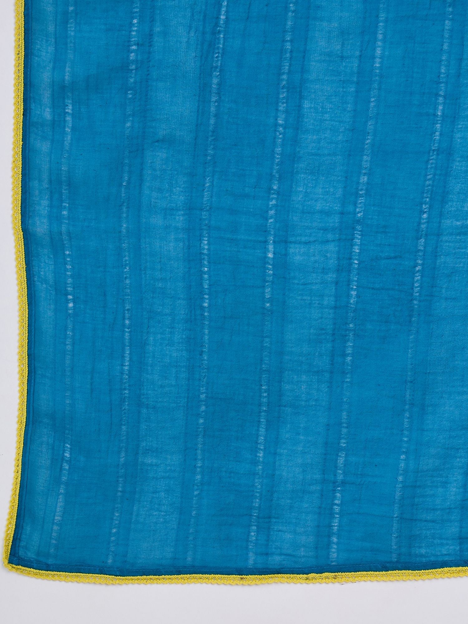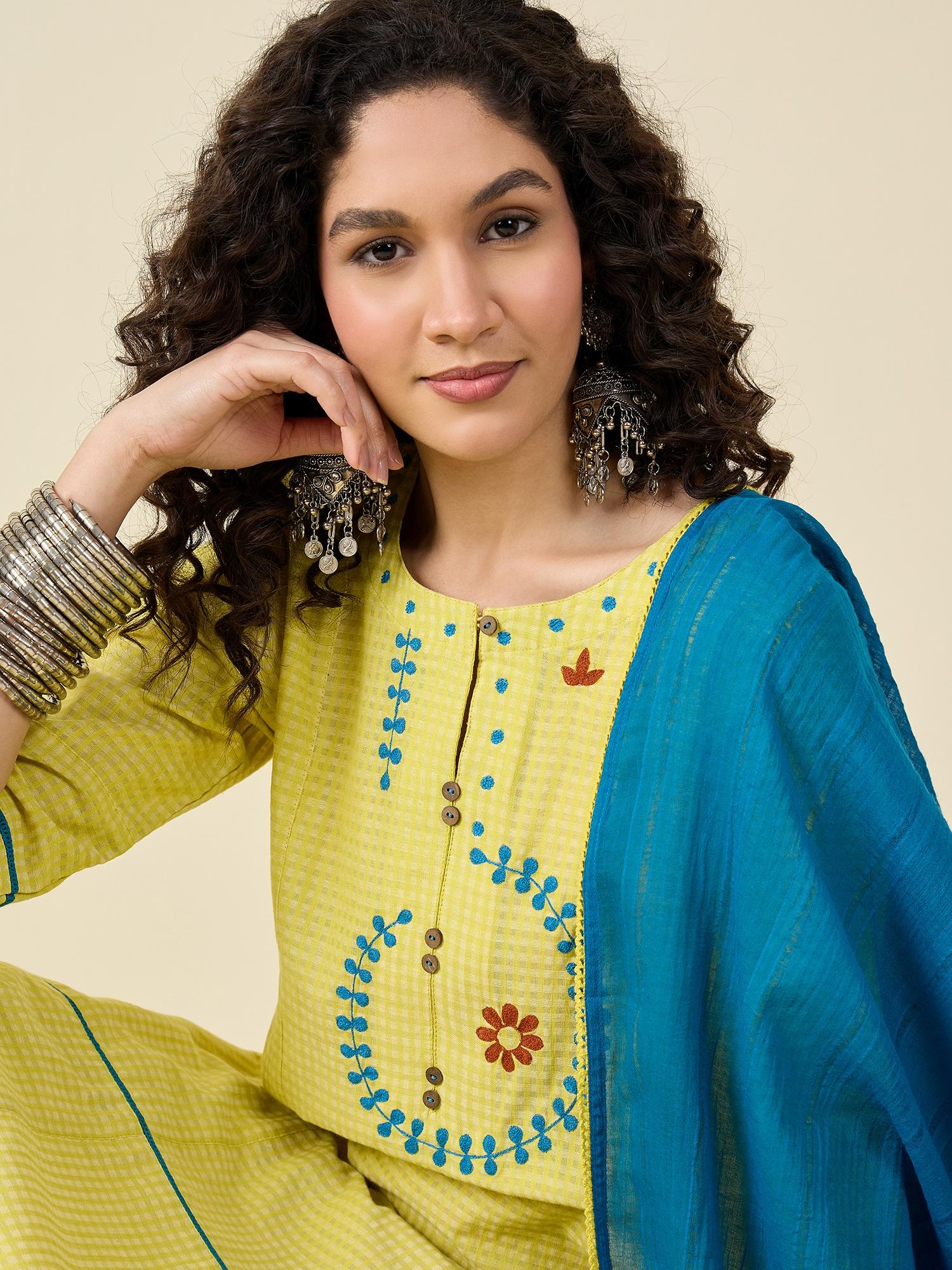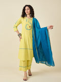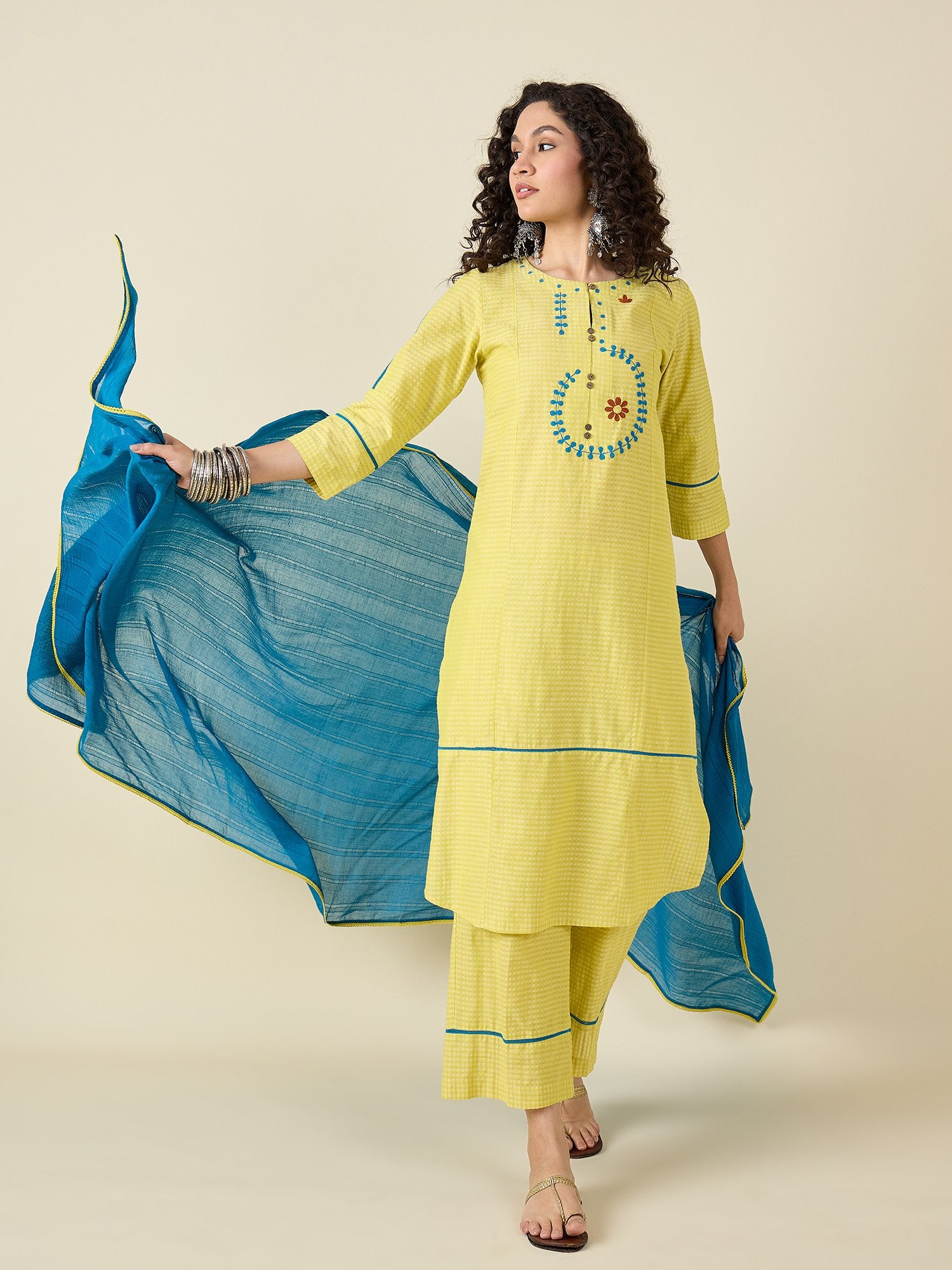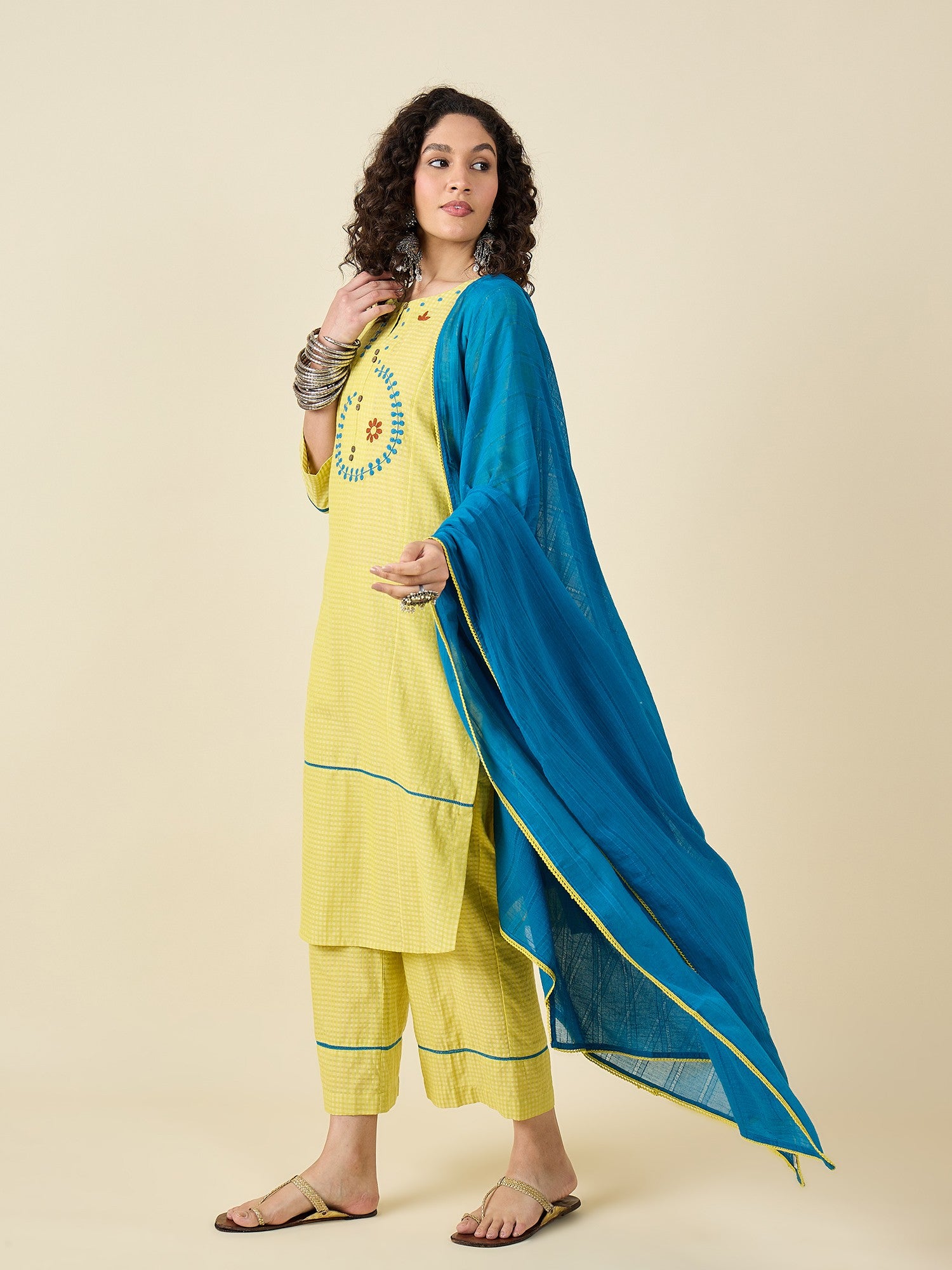 Step into elegance with this sunshine yellow kurta set, crafted in soft textured fabric and beautifully highlighted with hand embroidery in blue and maroon accents. The kurta features a round neckline with button detailing, 3/4th sleeves, and a straight silhouette, paired with matching straight pants. The set is complemented with a contrasting blue dupatta, adding a refreshing pop of color. Perfect for festive gatherings and casual ethnic outings.
