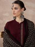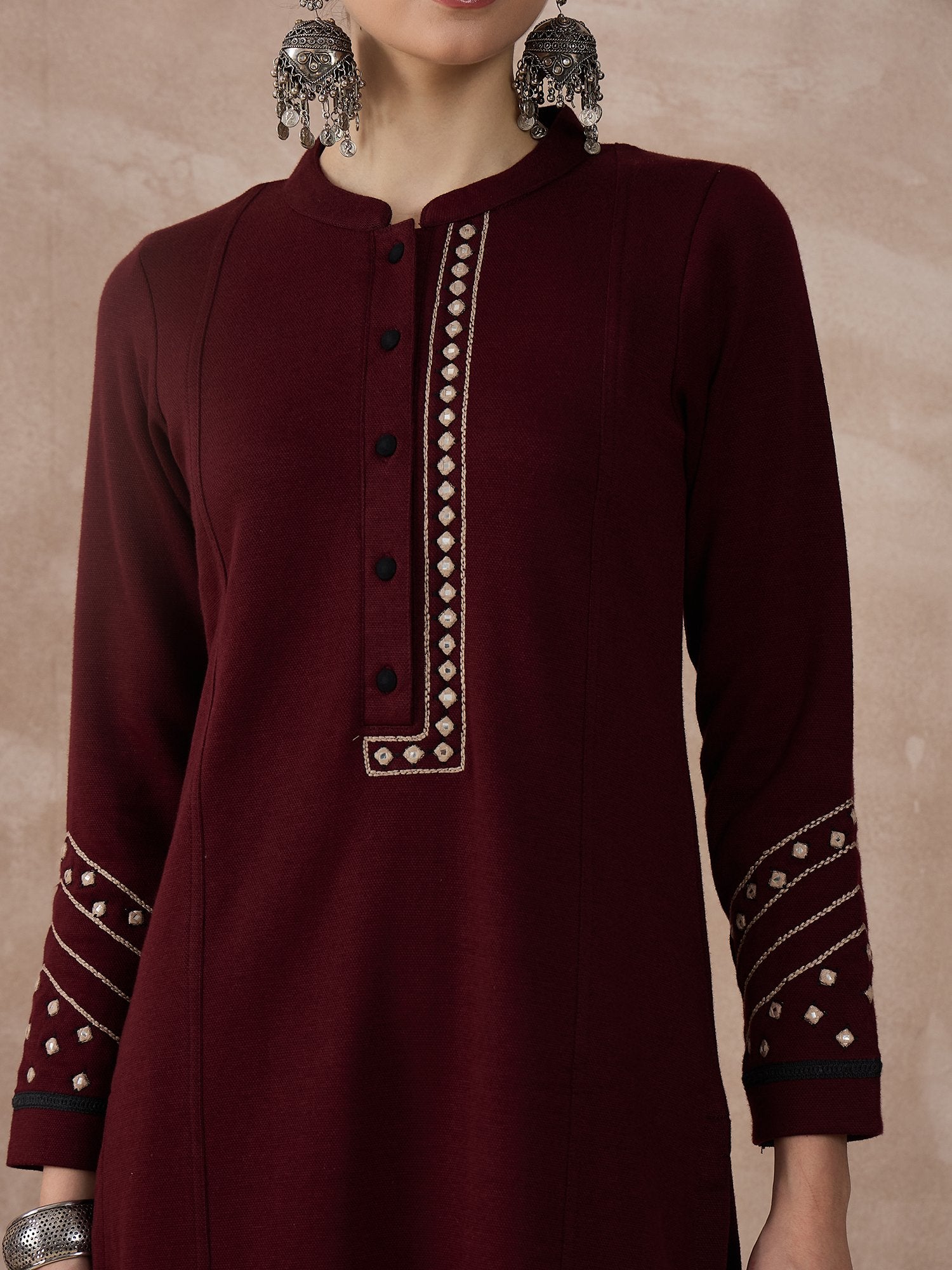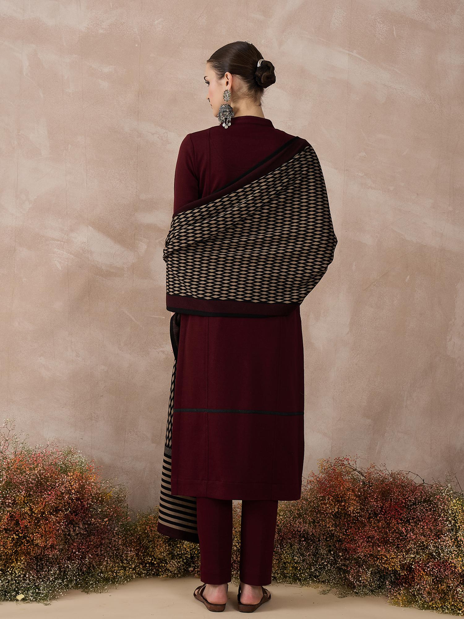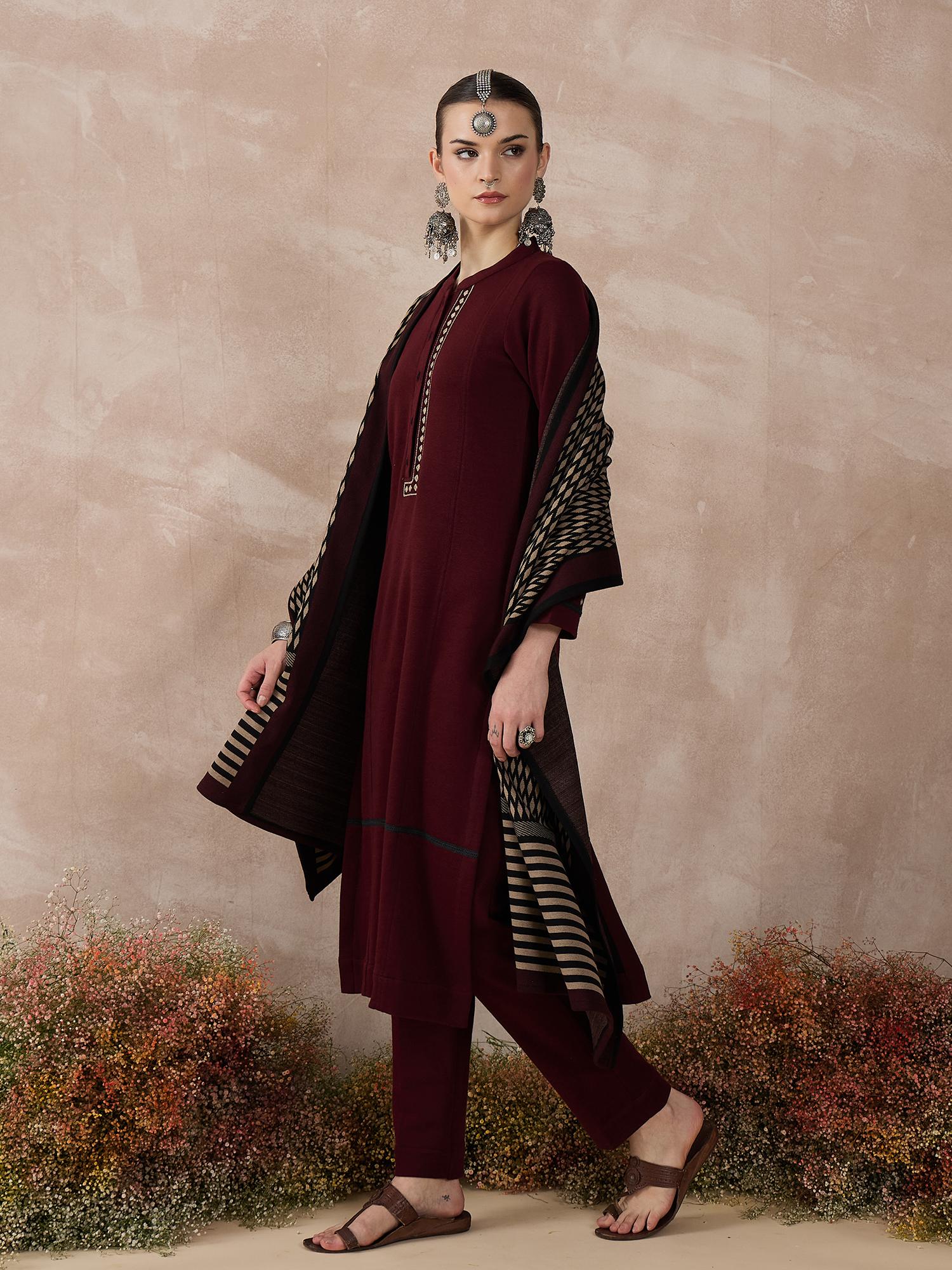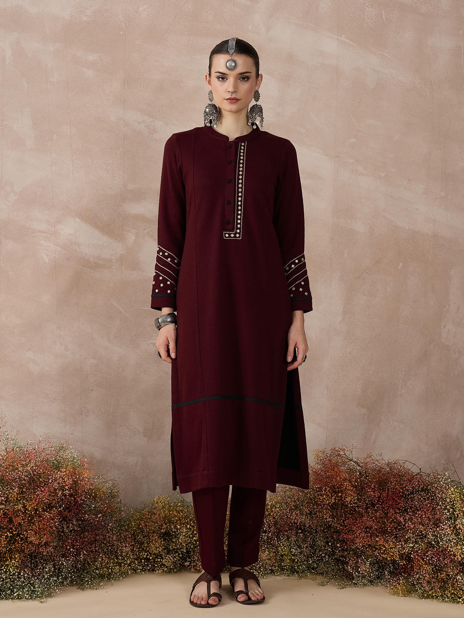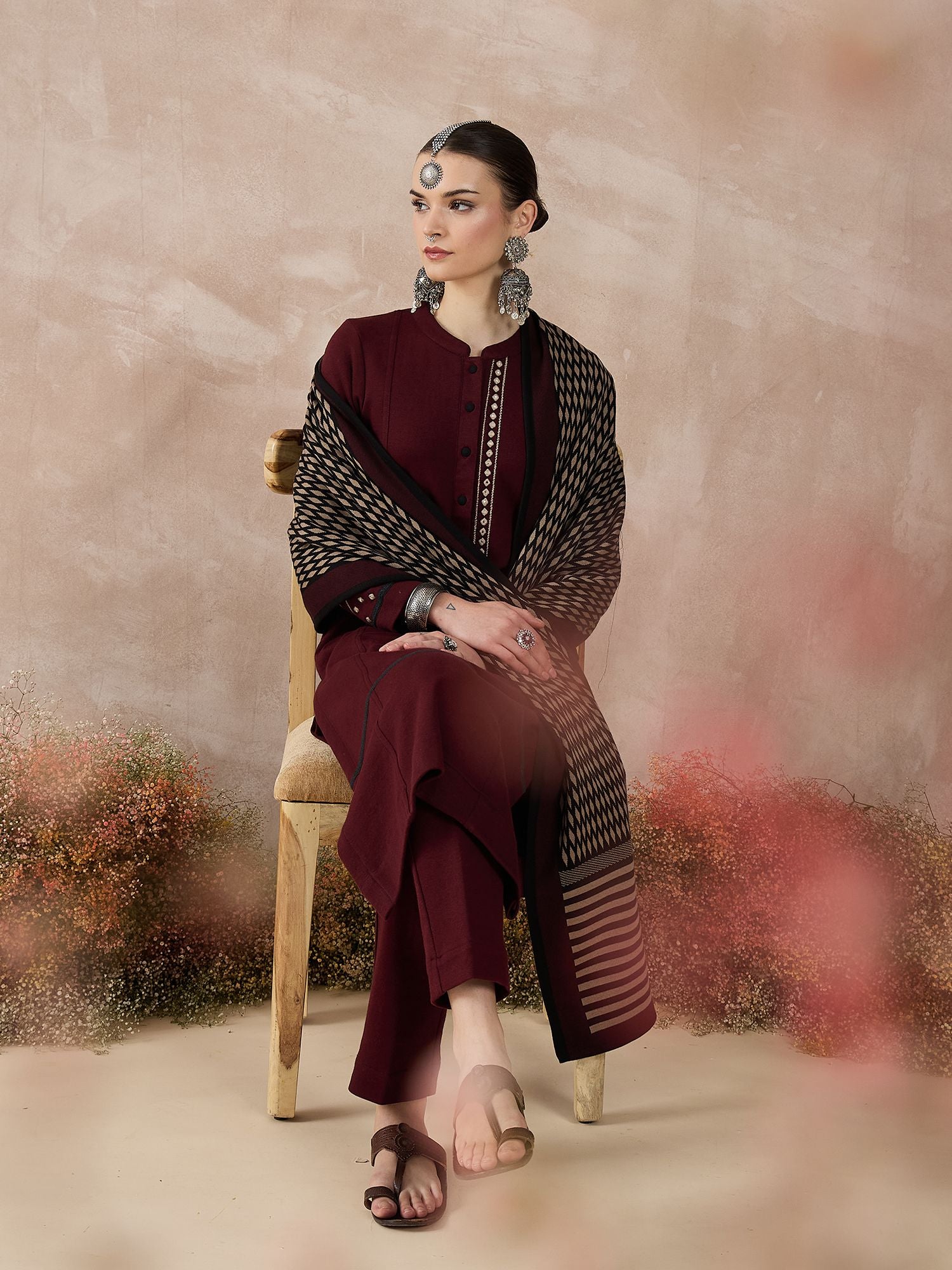 Celebrate elegance in its most effortless form with this Maroon Embroidered Kurta Set. Tailored in soft knitted cotton for unmatched comfort, it features a classic Mandarin neckline and full sleeves for a refined, structured silhouette.