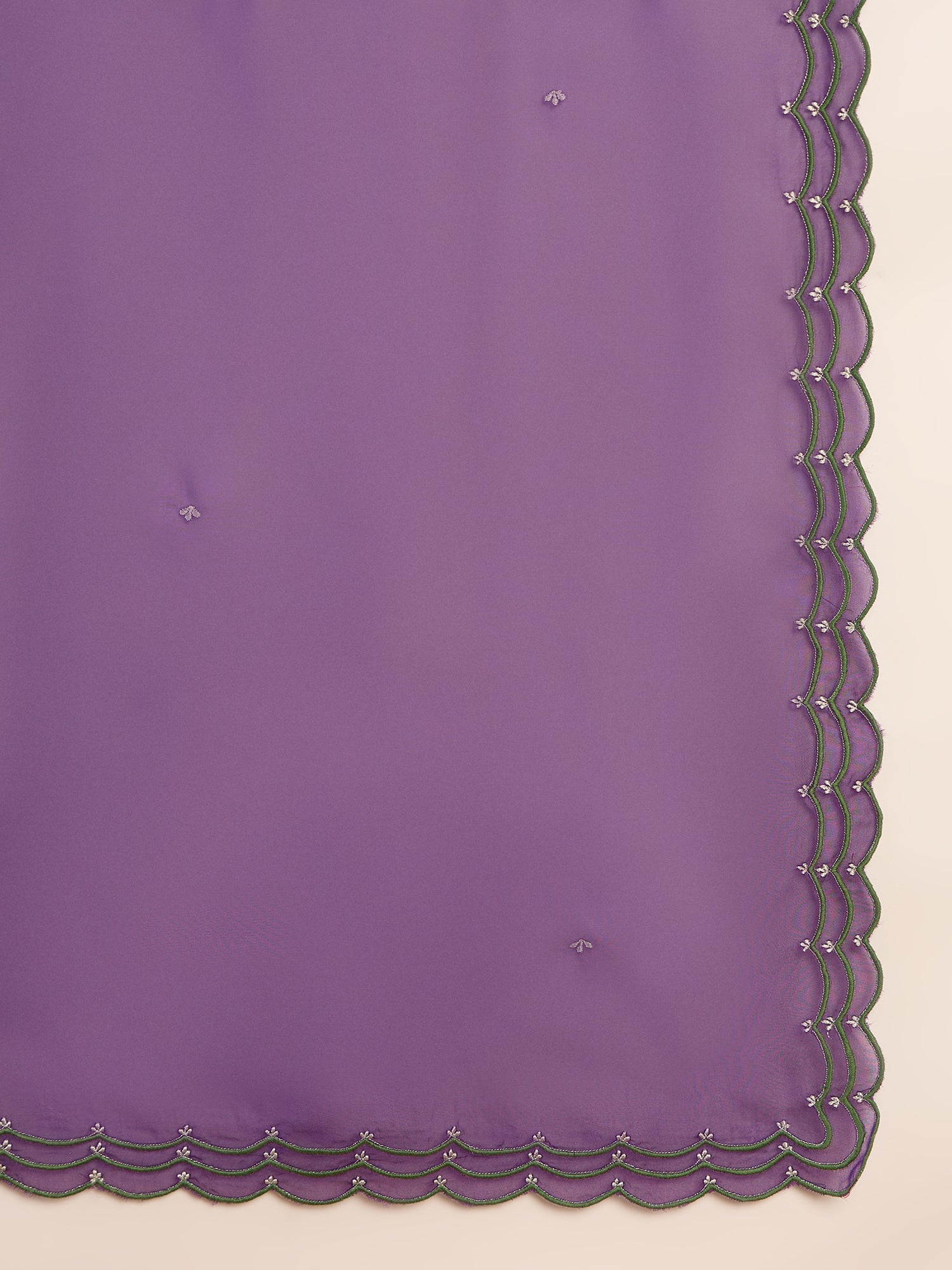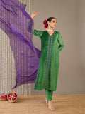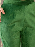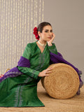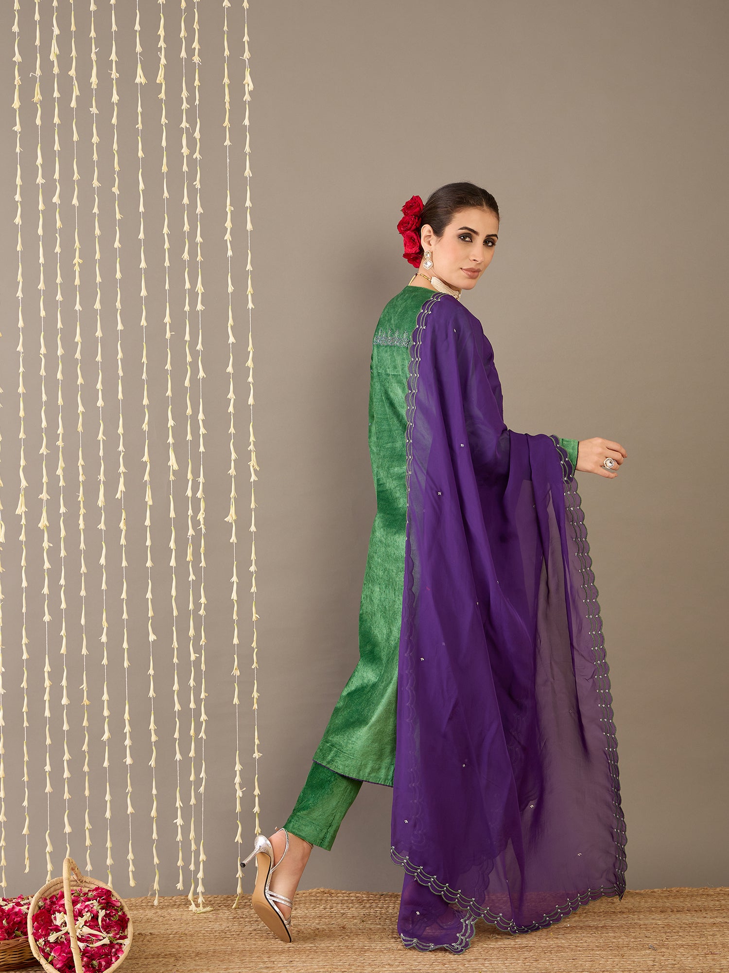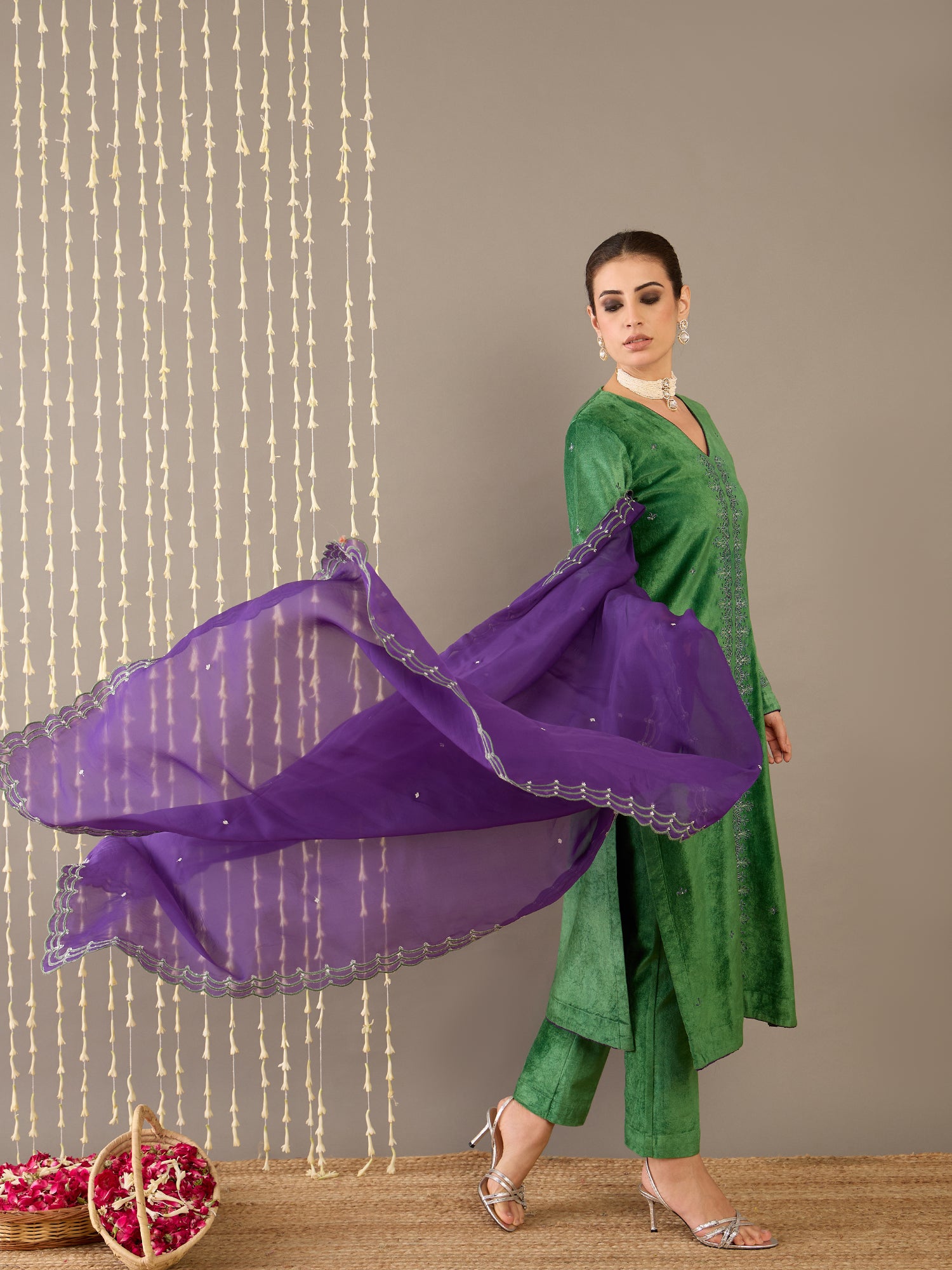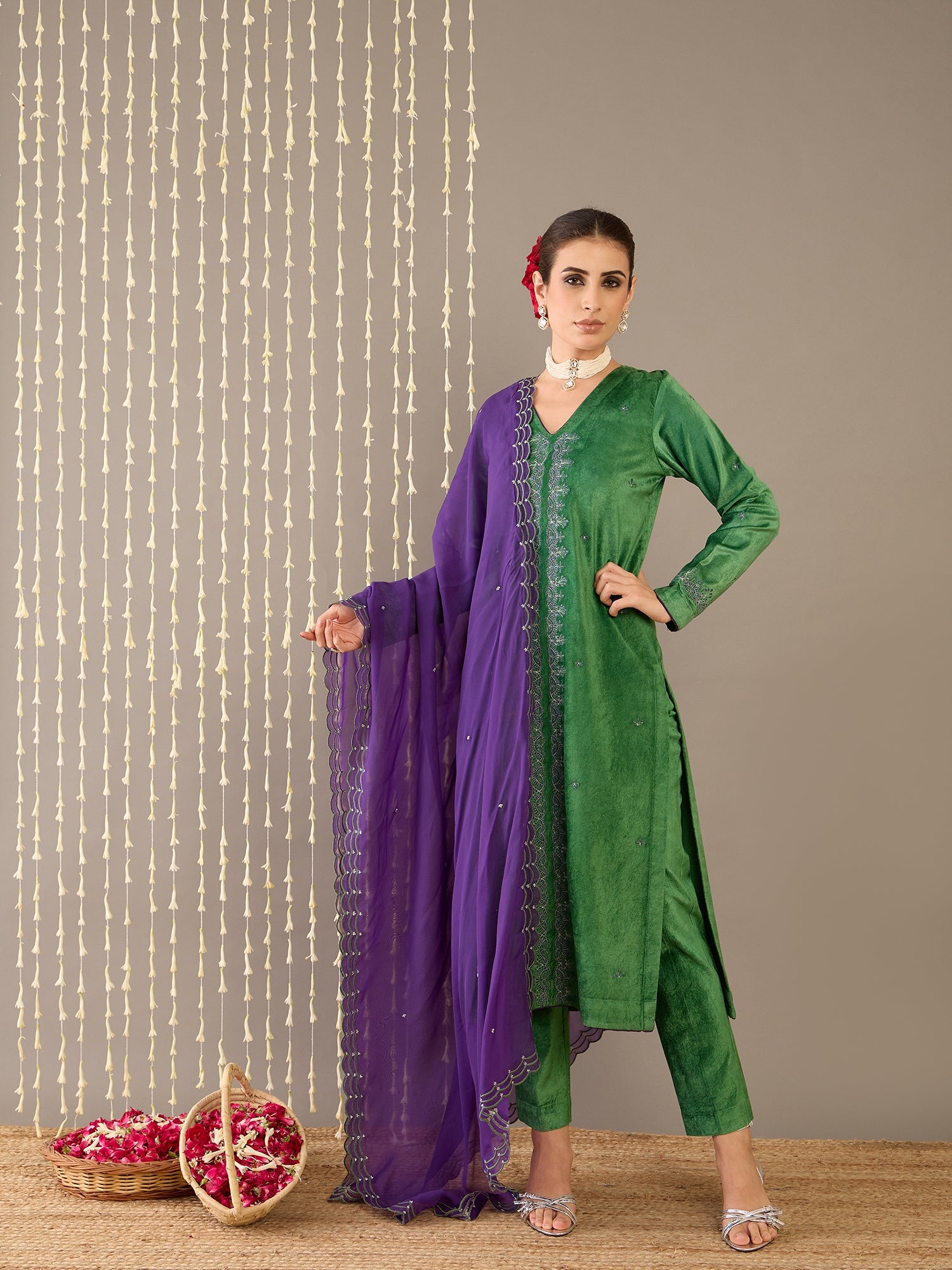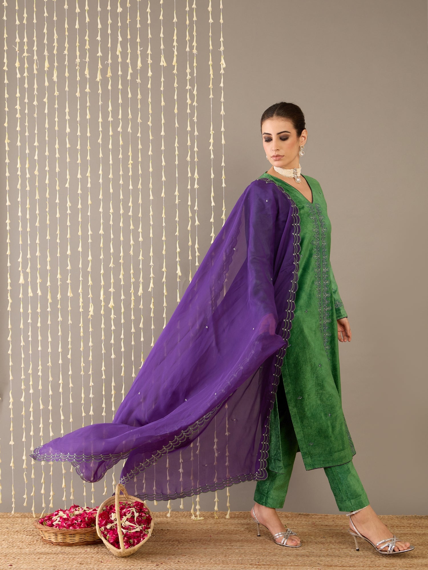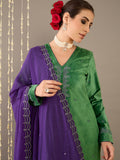 Radiate regal charm in Gulbahaar, a luxurious moss green velvet kurta set that seamlessly blends traditional elegance with modern sophistication. The kurta features a flattering V-neckline delicately embroidered to elevate its rich texture, full sleeves, and a comfortable regular fit. It’s paired with minimalist pants for a clean silhouette and a striking purple organza dupatta, beautifully embroidered to add a bold yet graceful contrast. The plush velvet and airy organza together create a play of texture and color, making this ensemble a timeless choice for festive occasions and refined celebrations.