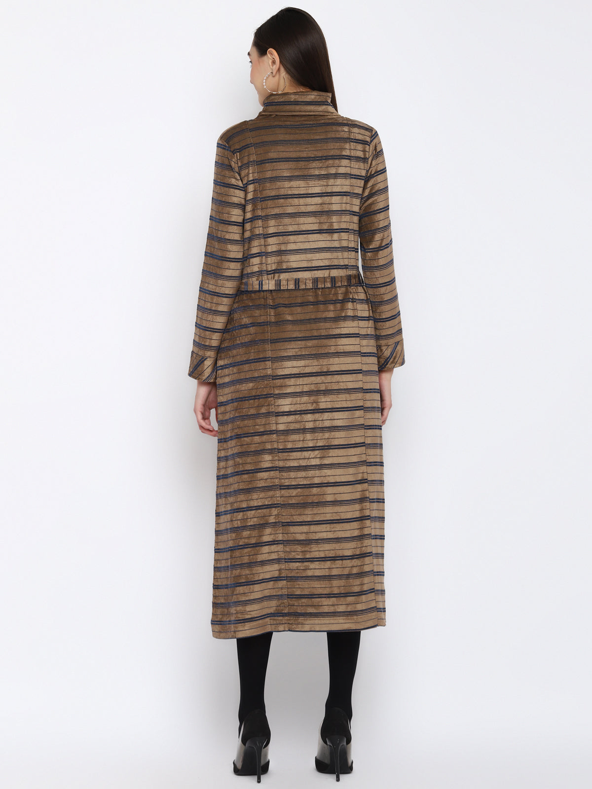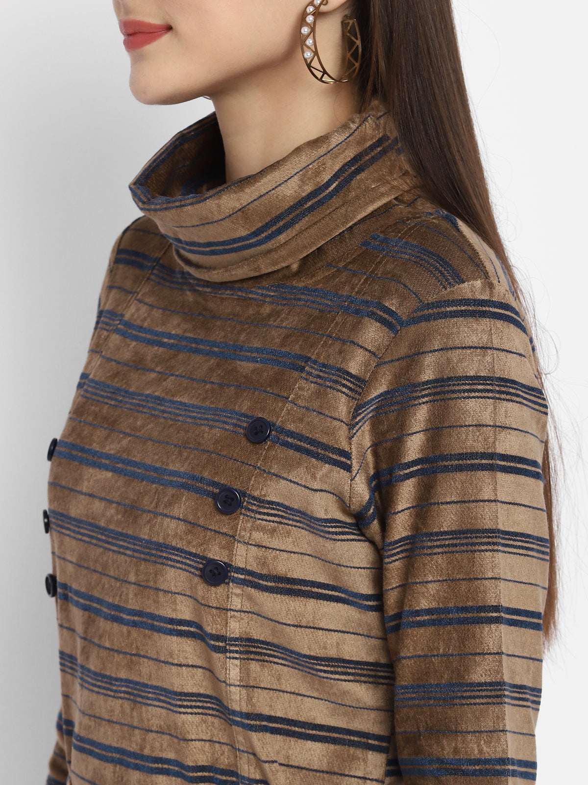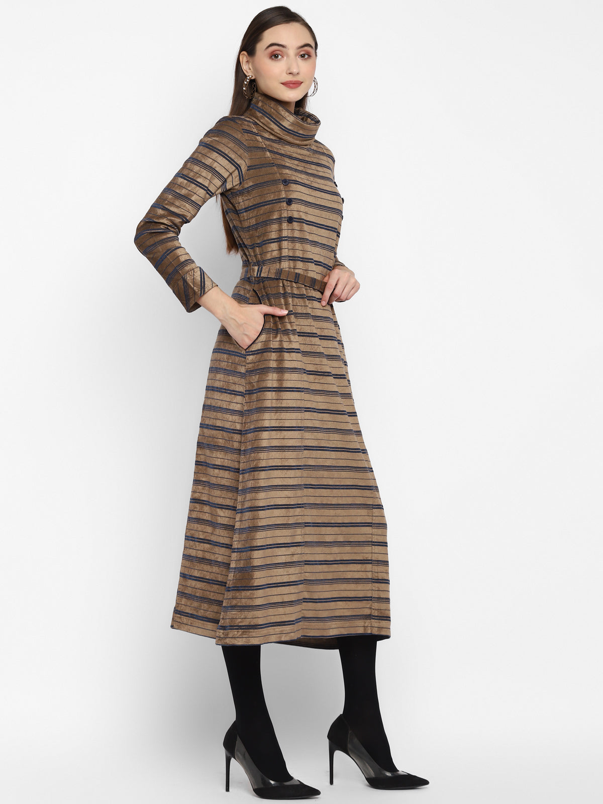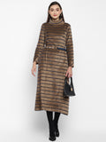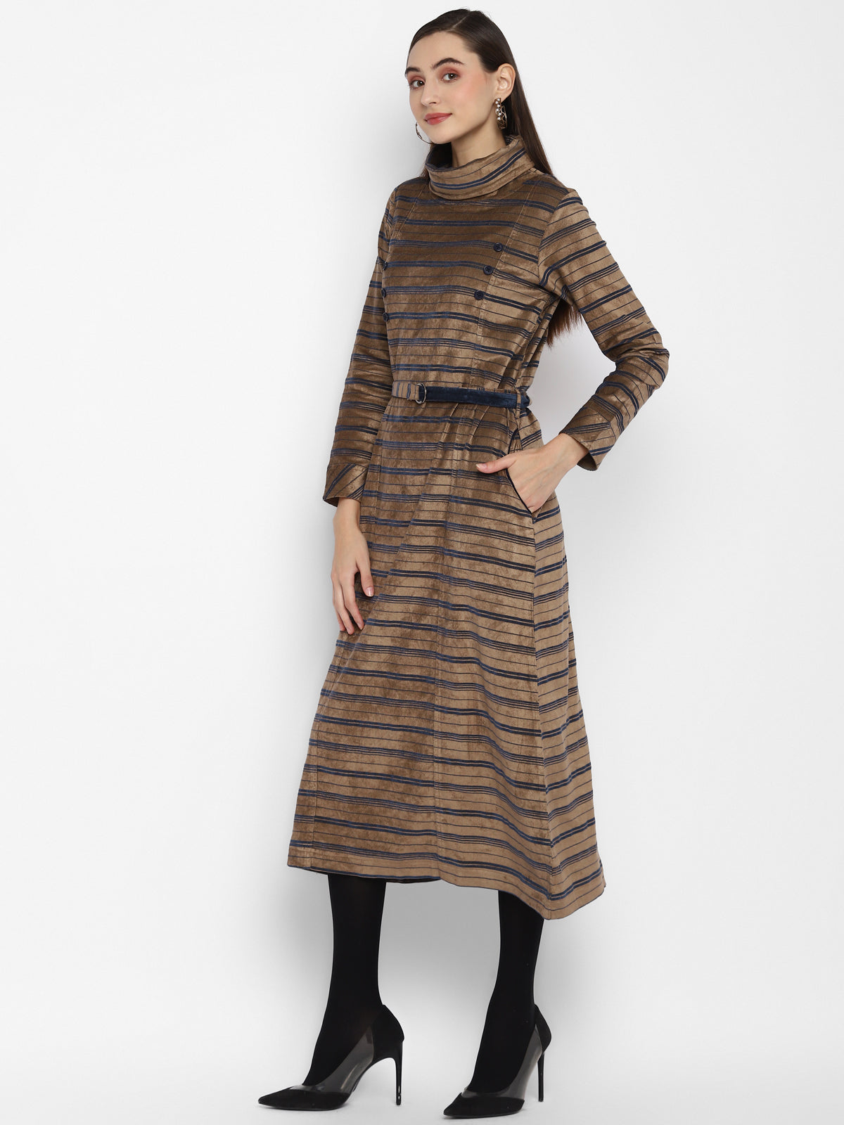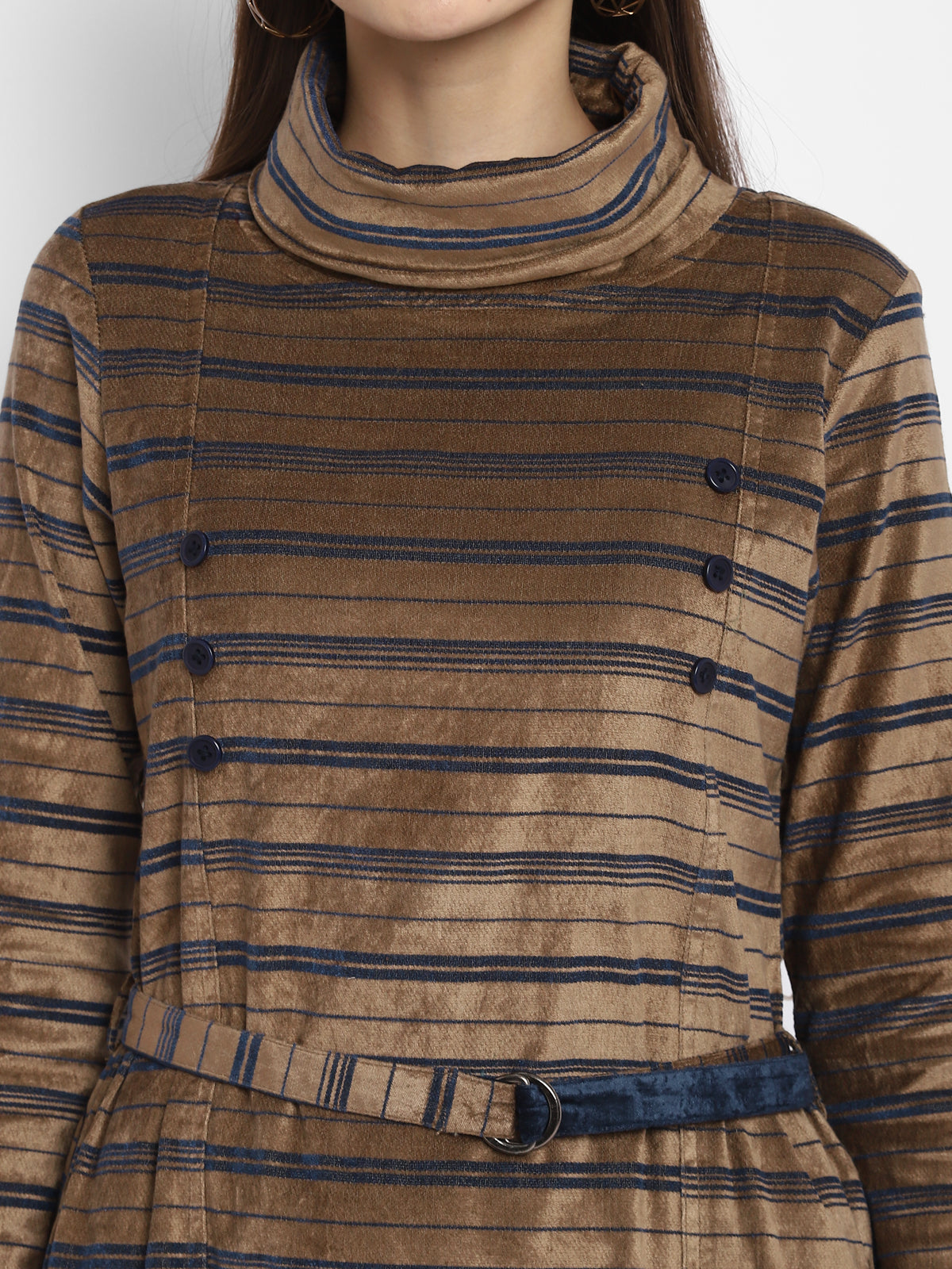 Step out in style with this sophisticated mouse velvet striped A-line middy, designed to make a statement on both casual and semi-formal occasions. Crafted from plush velvet fabric, it features a flattering A-line fit that gently flares for a graceful silhouette. The elegant turtle neck and full sleeves add a refined touch, making it ideal for cooler weather.
