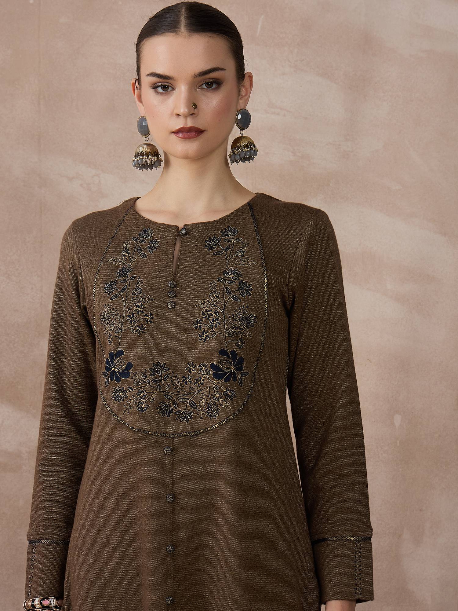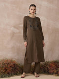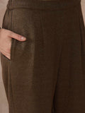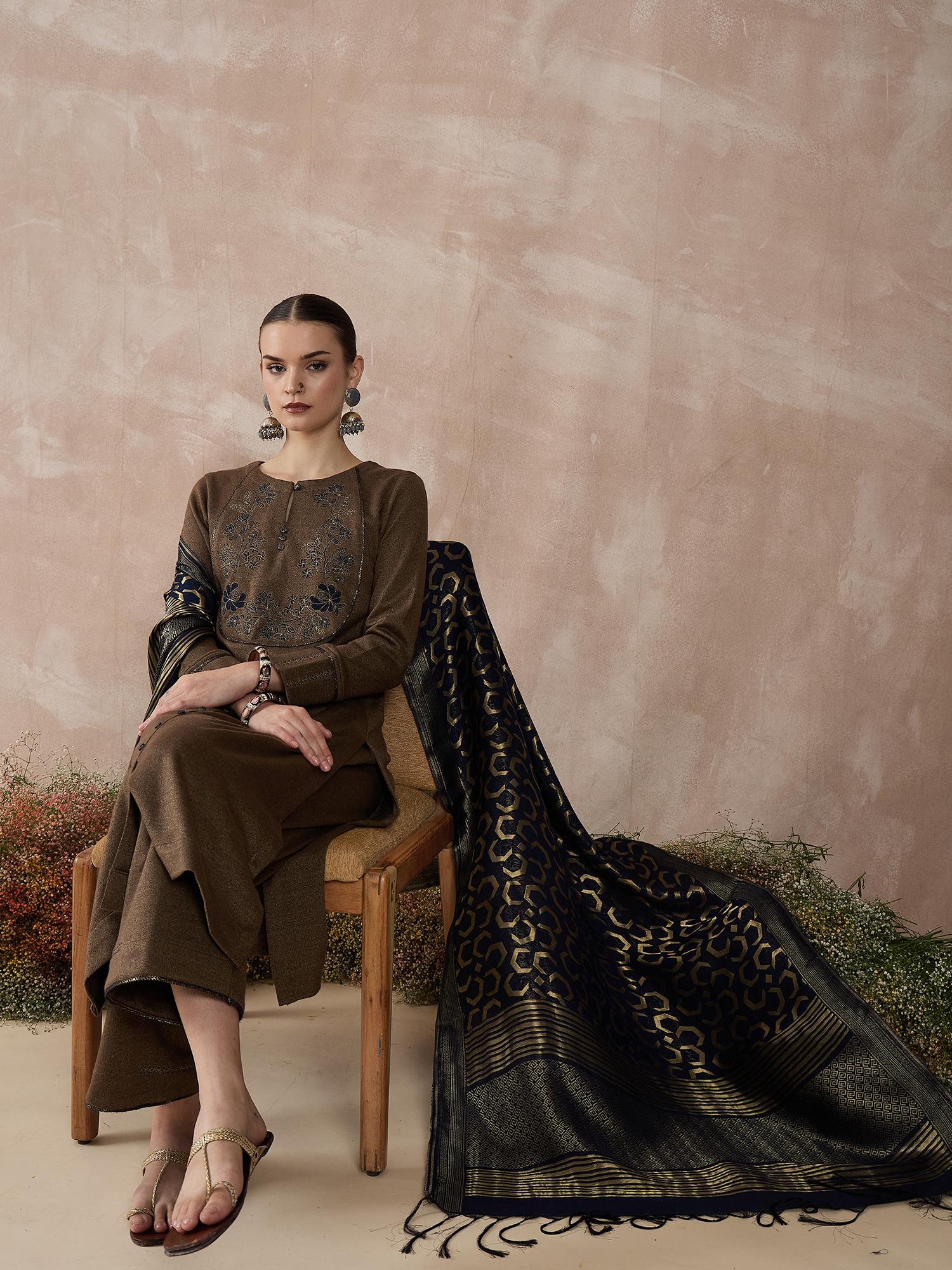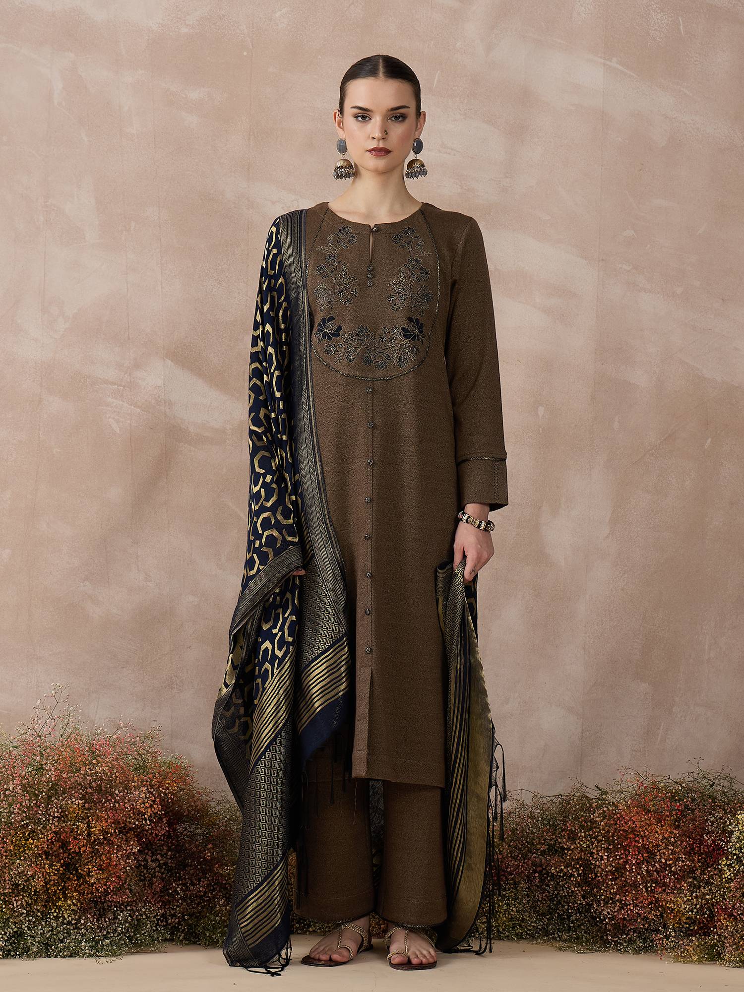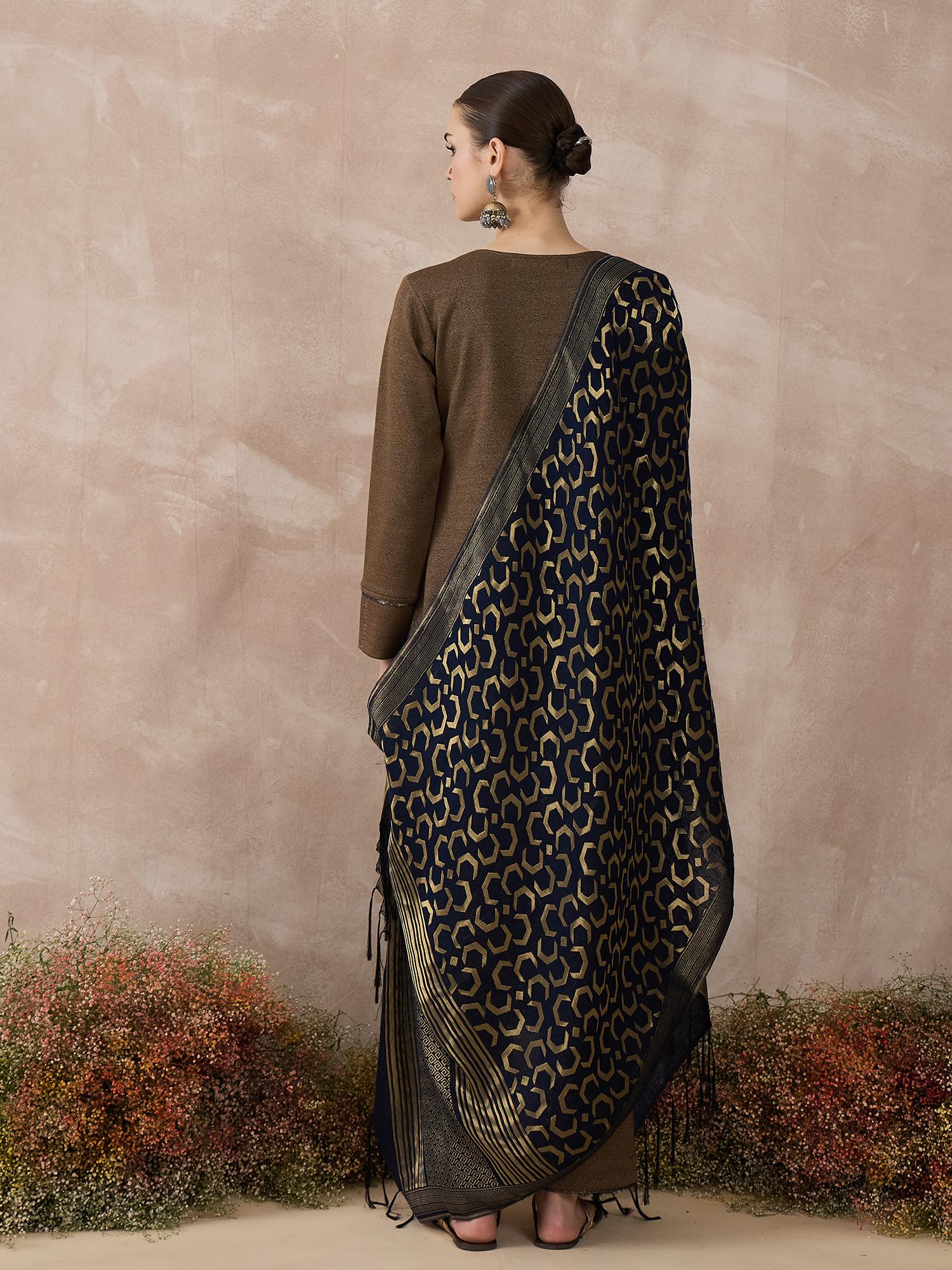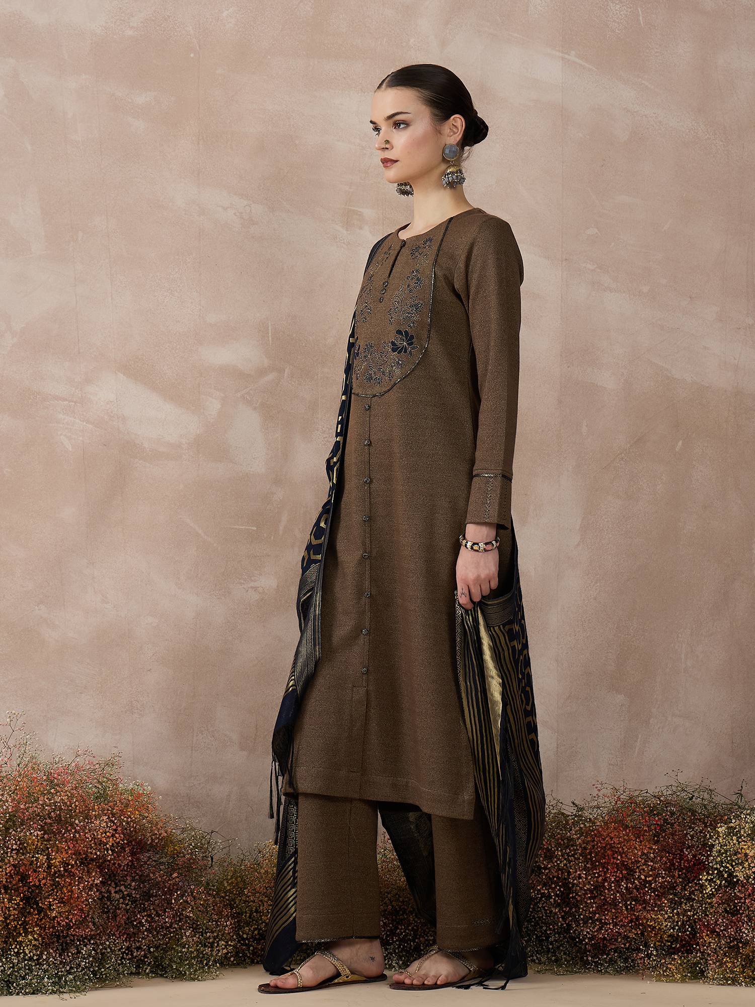 Radiate effortless grace in this brown knitted zari cotton kurta set with dupatta, a perfect blend of comfort and festive charm. The round-neck kurta features subtle zari detailing that adds a hint of shimmer, making it ideal for both day and evening celebrations. Tailored in a regular fit with full sleeves, it offers a timeless silhouette that flatters every body type. The matching pants ensure ease of movement, while the coordinated dupatta completes the look with understated elegance.