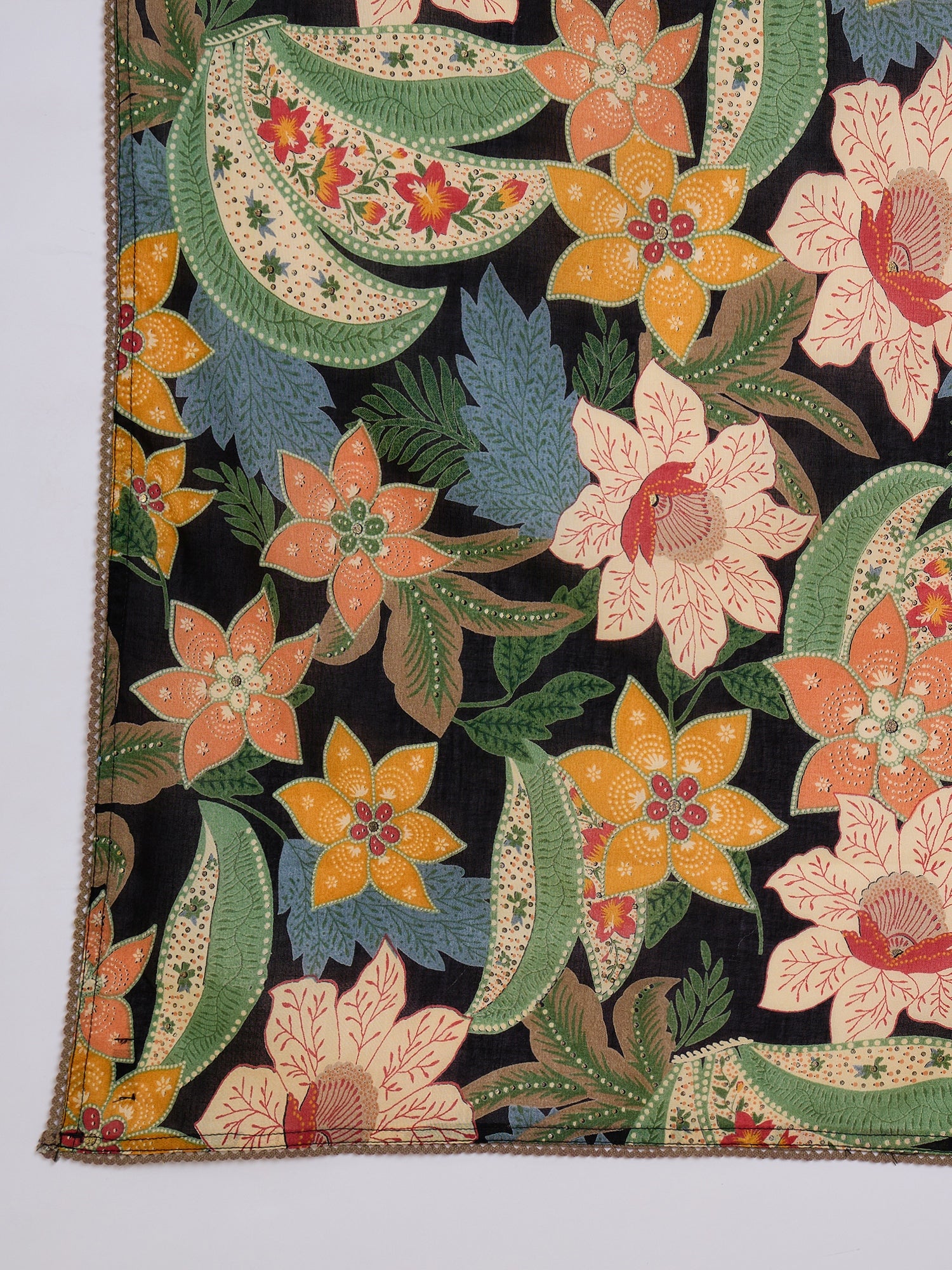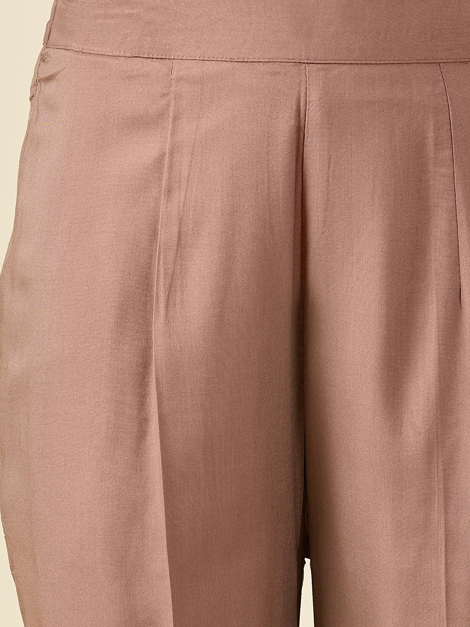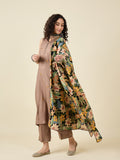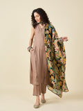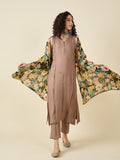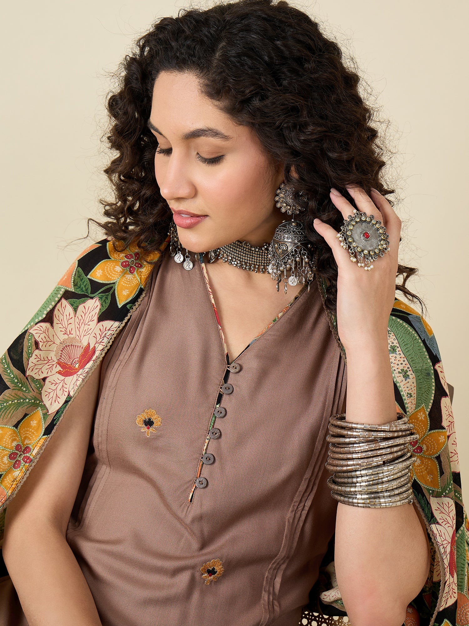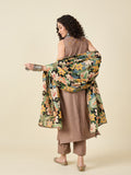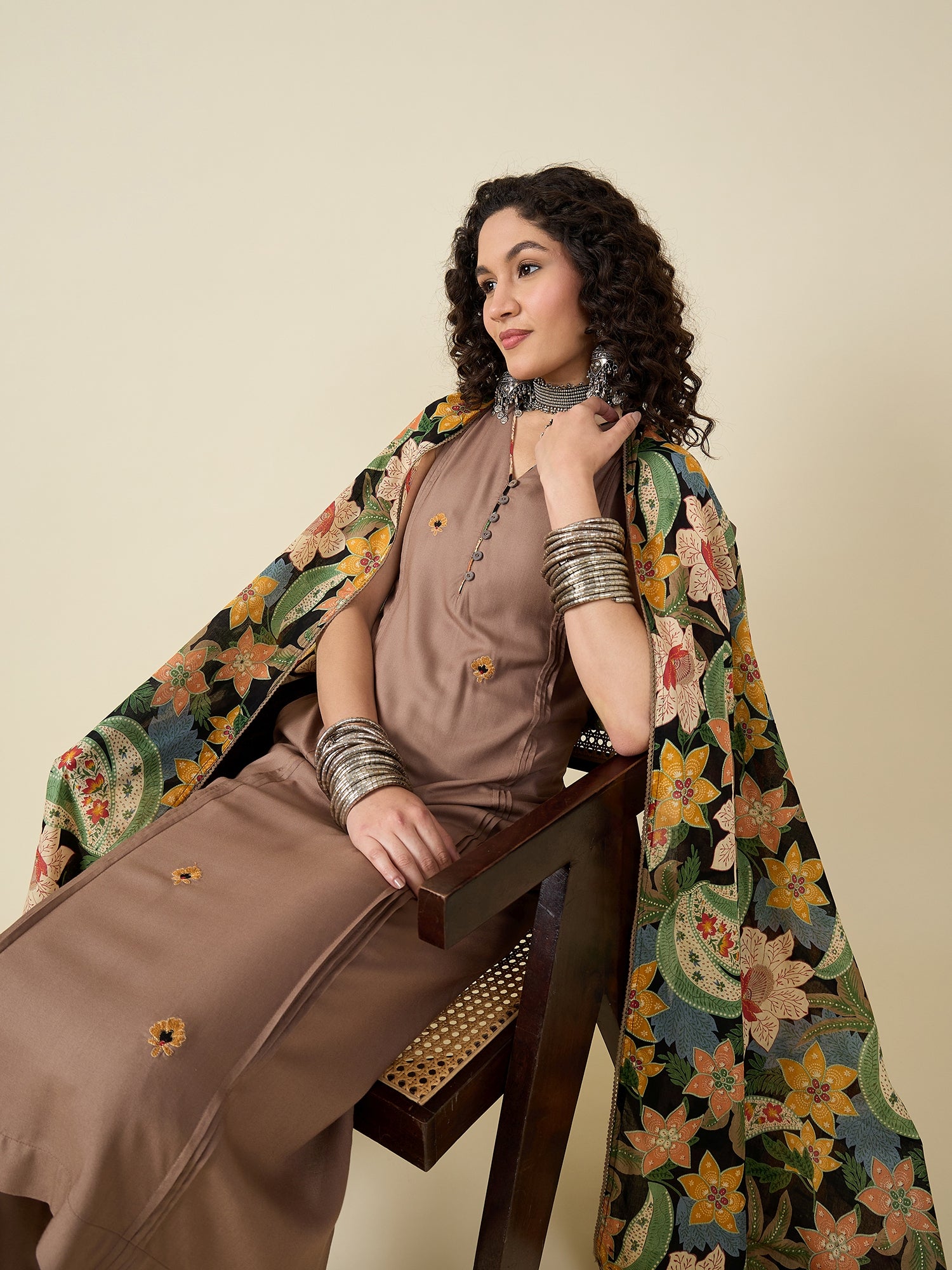 This kurta set boasts refined embroidery on the front and back, with pintuck detailing on both sides for added elegance. The side buttoning style adds a stylish touch, complemented by a smart, graceful mul printed dupatta and straight pants for a chic, polished look.