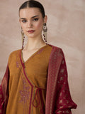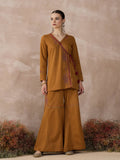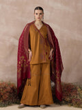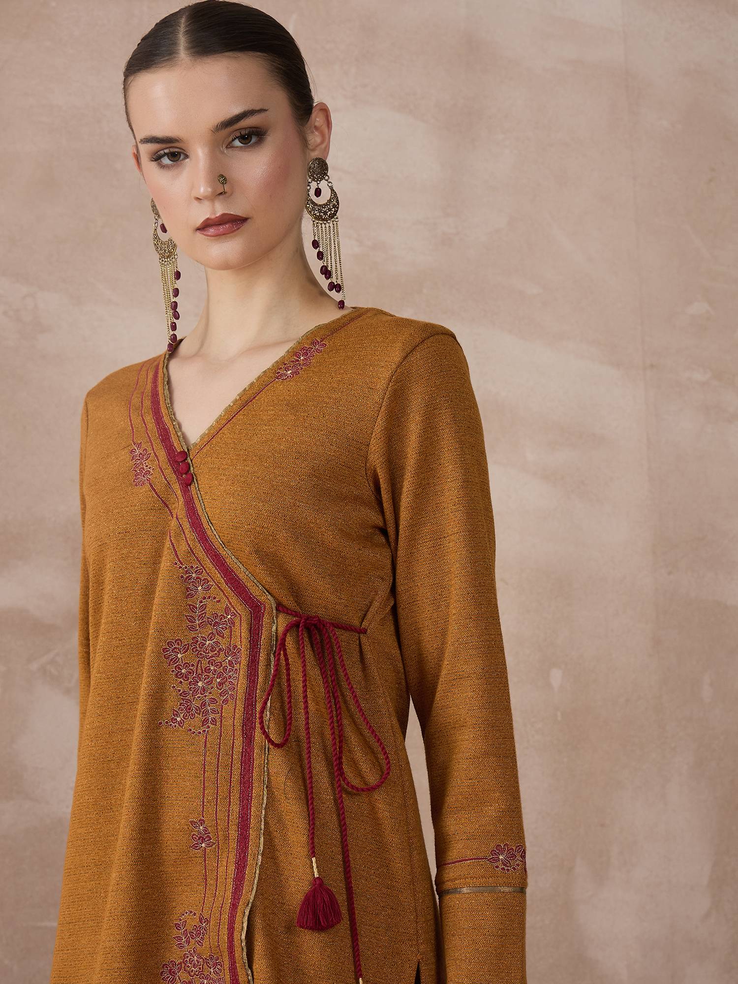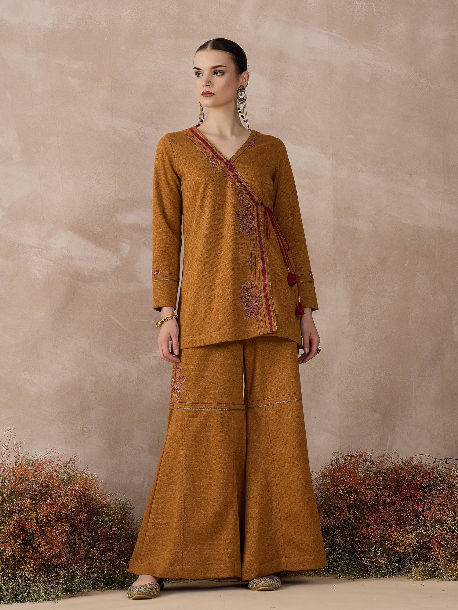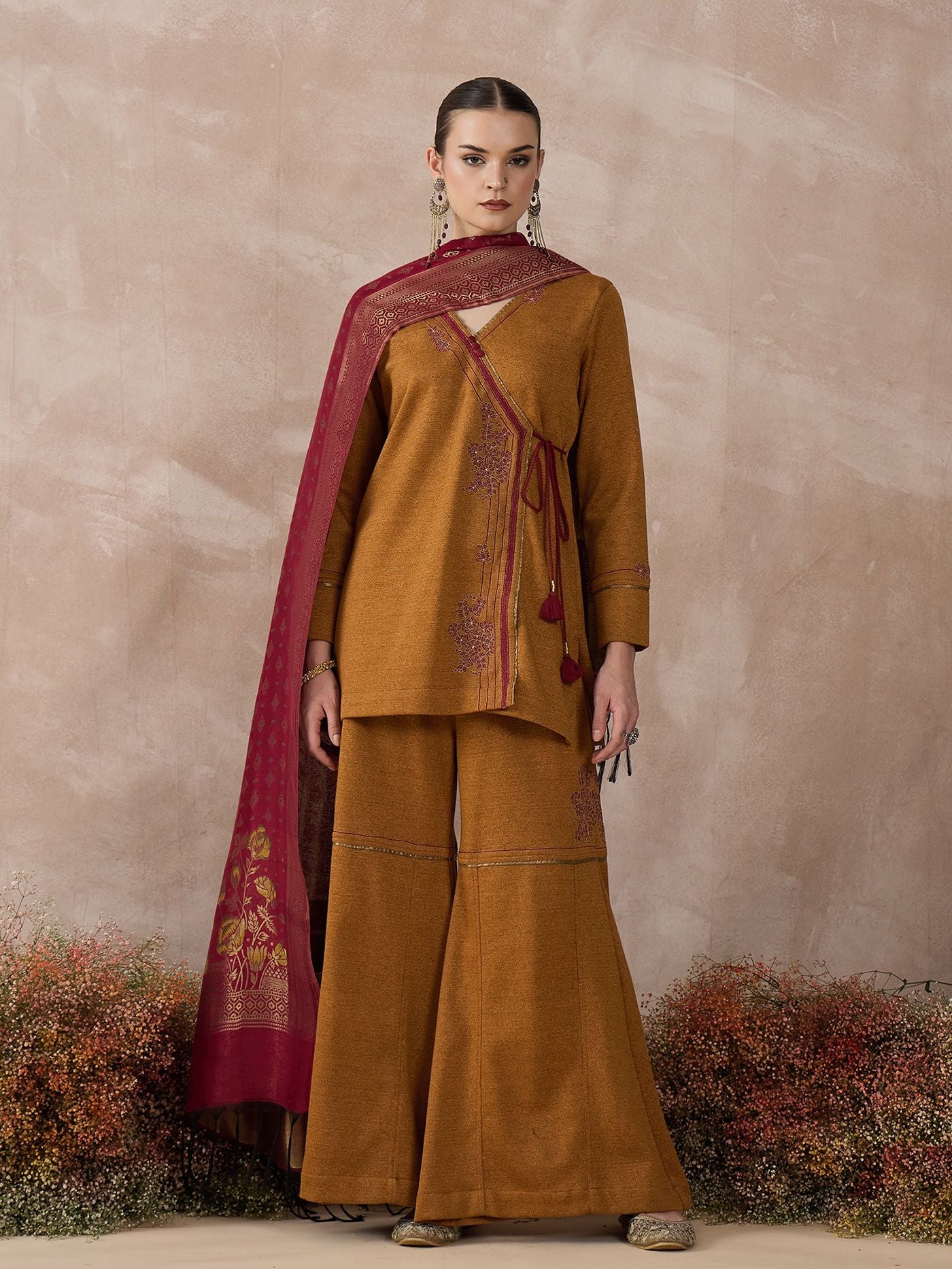 Make a statement this festive season with this stylish mustard sharara set, crafted from luxurious knitted zari fabric for a soft, comfortable feel. The ensemble features a short Angrakha-style kurta with a flattering V-neckline and full sleeves, tailored in a regular fit for effortless grace.