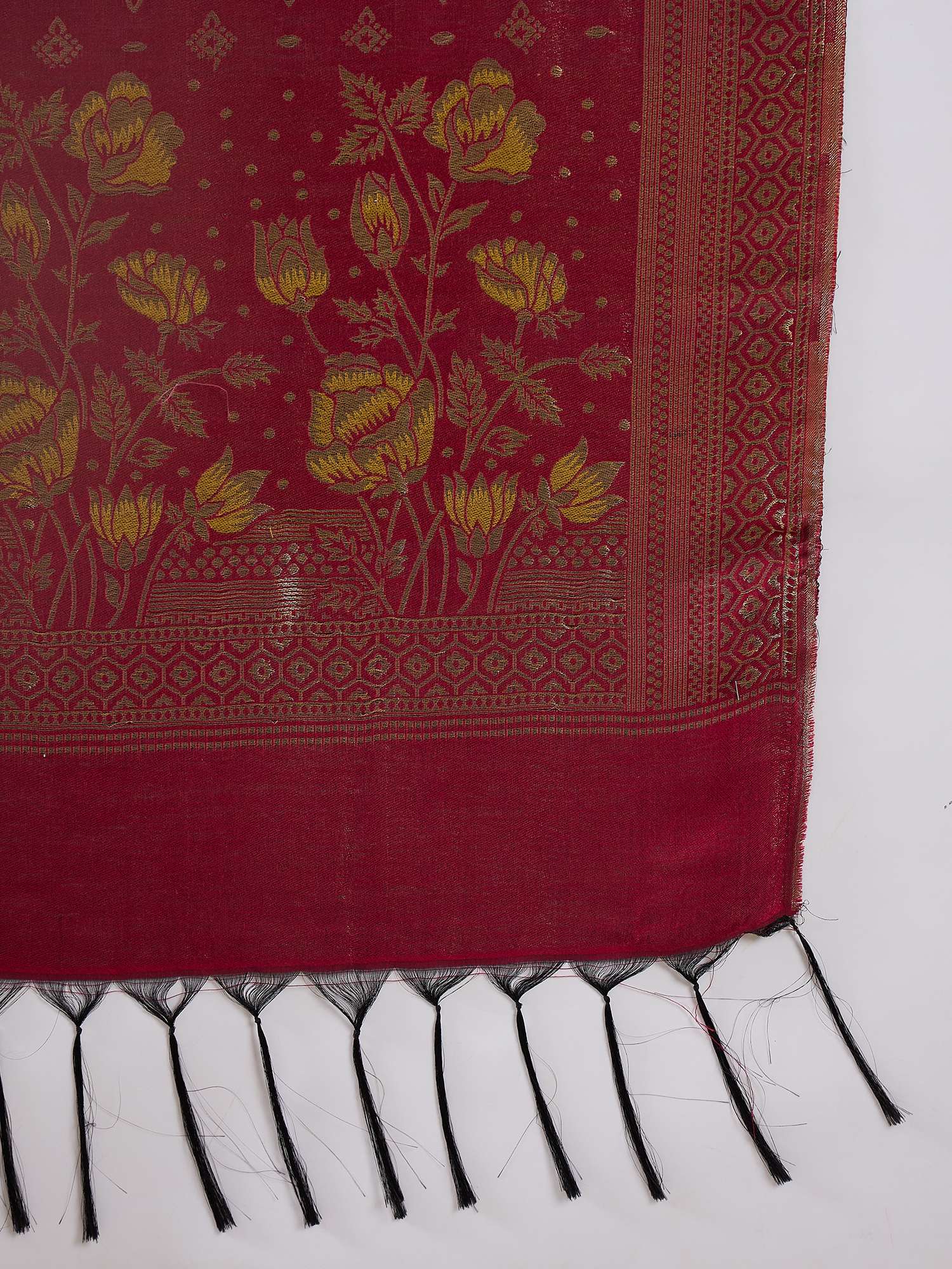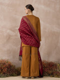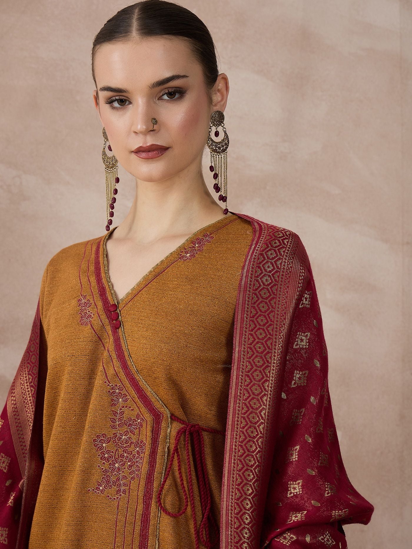 Intricate contrast embroidery adorns the front, sleeves, and hemline, creating a rich, visually striking texture that exudes both elegance and tradition. The look is completed with a silk zari dupatta in vibrant red and mustard tones, adding a festive flourish to this modern silhouette—perfect for celebrations, special occasions, or festive gatherings.
