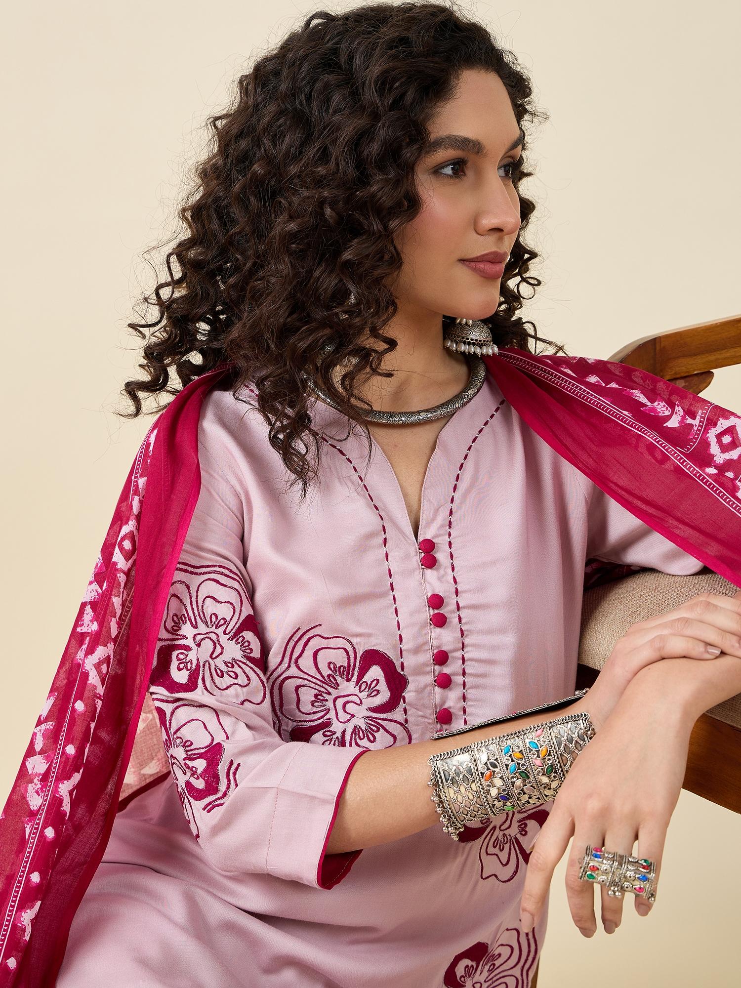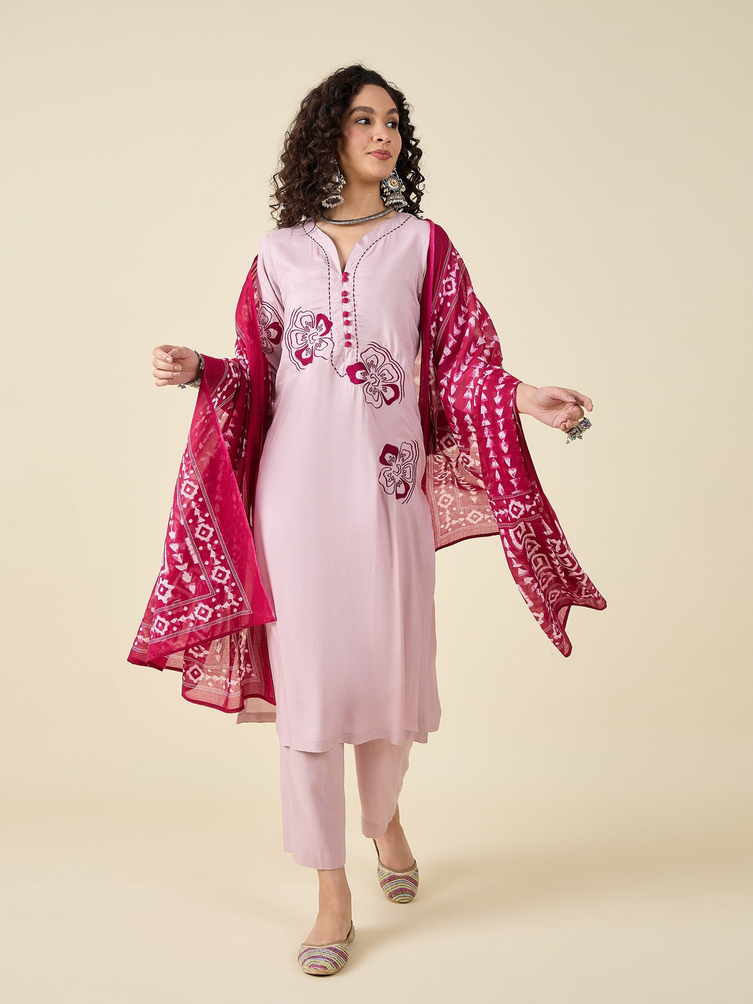 This elegant kurta set features heavy yet delicate embroidery on the arms, exuding timeless charm. Paired with a soothing and airy Kota Doria tie & dye dupatta, it offers a perfect blend of comfort and effortless style for a breezy, graceful look.