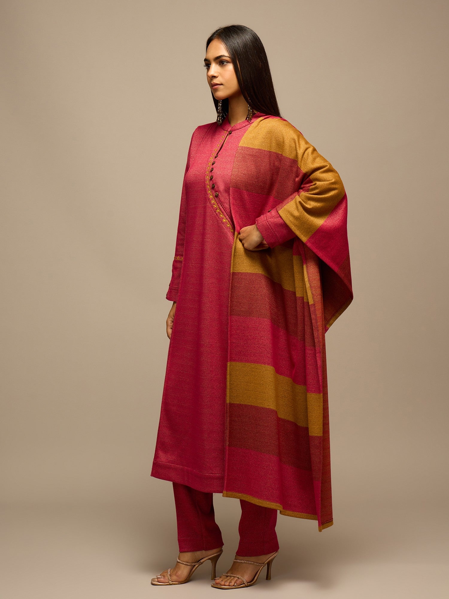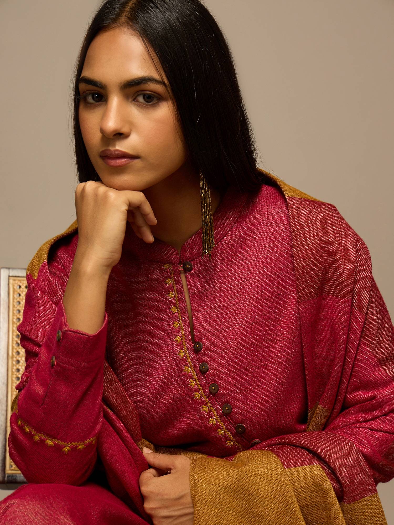 Step into festive sophistication with The Blush Elegance Kurta Set with Dupatta, crafted from soft knitted cotton with delicate zari accents. The mandarin-neck kurta, tailored in a regular fit with full sleeves, exudes understated elegance, perfect for festive or formal occasions.