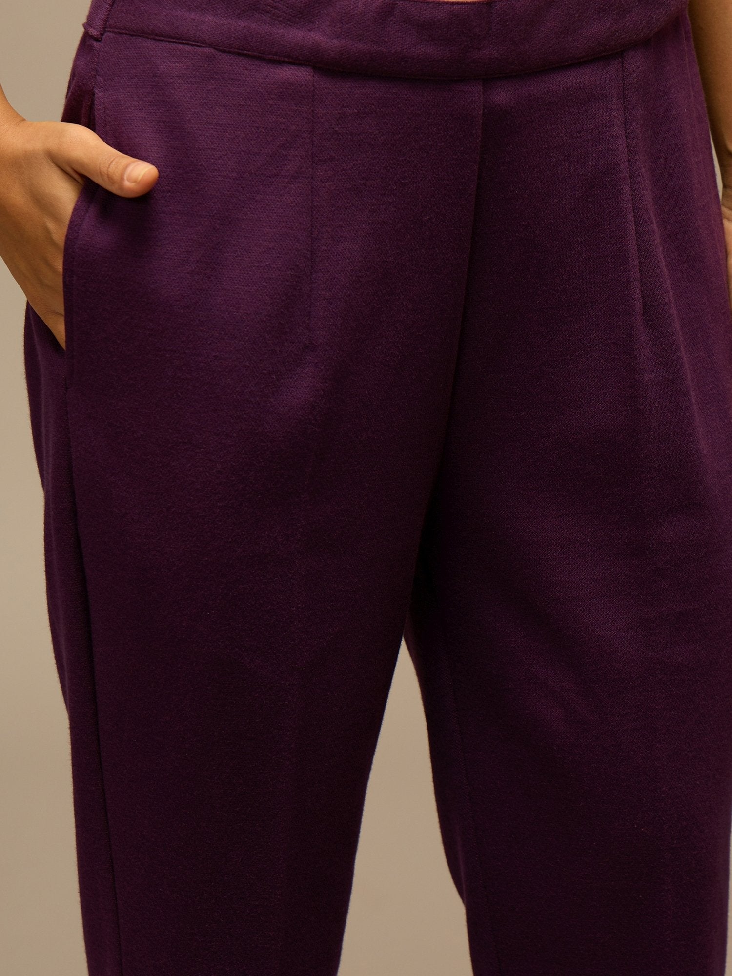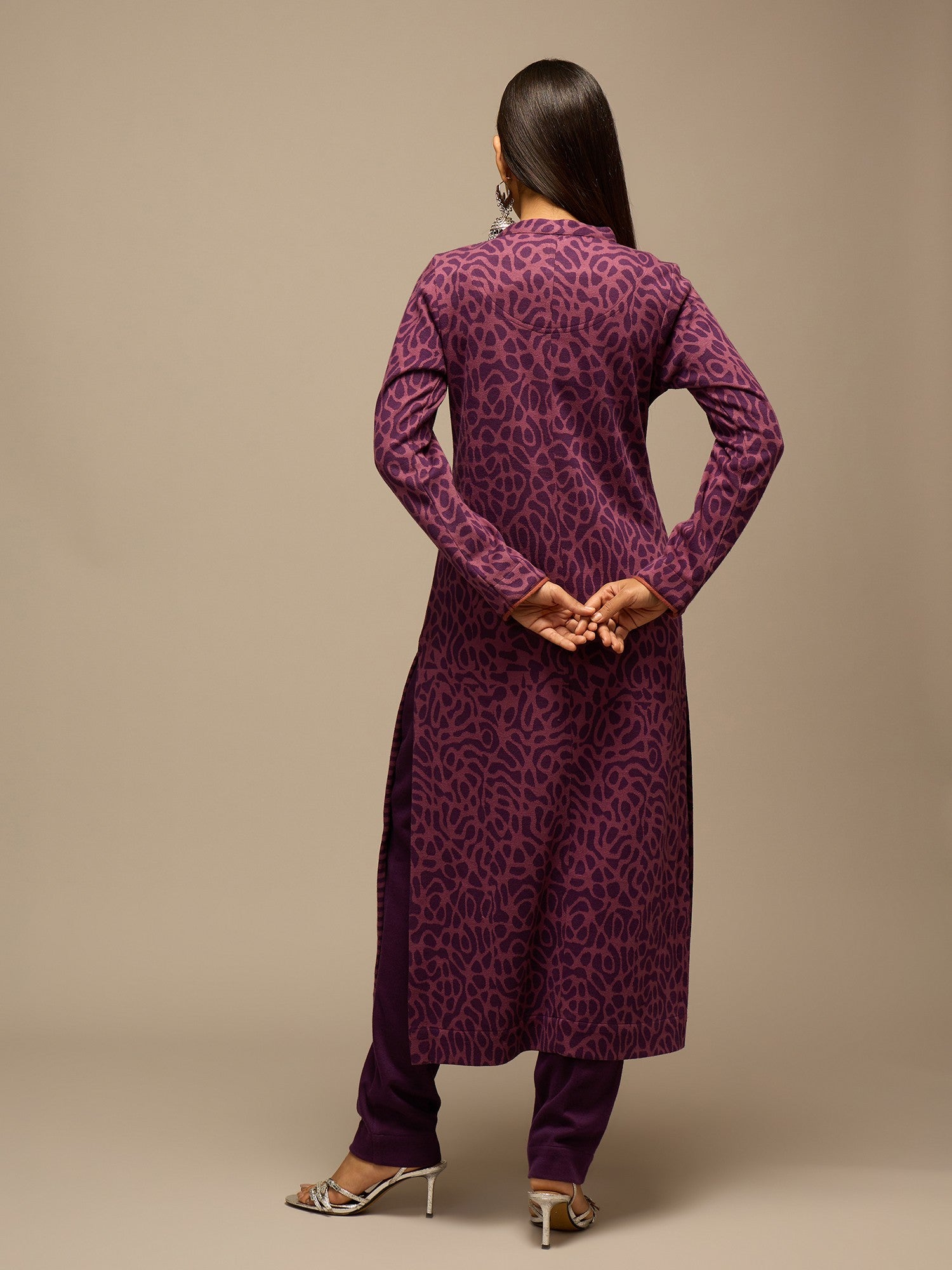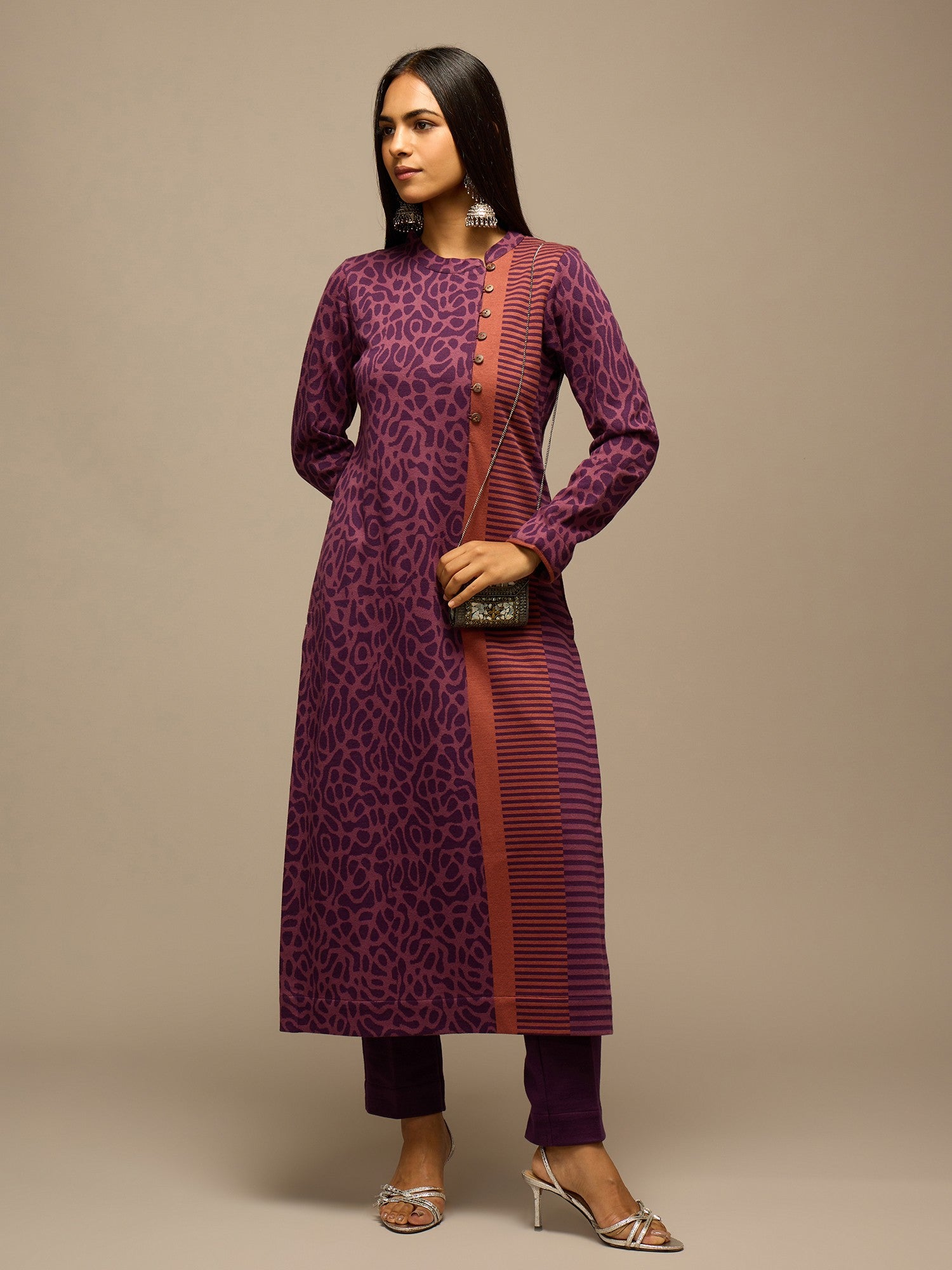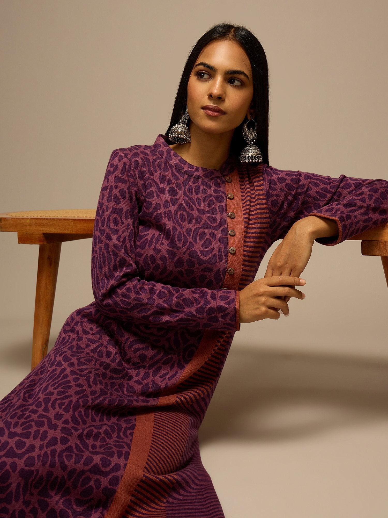Step into effortless style with this plum knitted kurta set, designed to perfectly balance sophistication and comfort. The kurta features a smart patterned knit with a classic side ban neck and full sleeves, radiating subtle charm. Paired with regular-fit pants, it offers ease of movement without compromising on a polished, put-together look. Ideal for work, casual outings, or everyday wear, this versatile kurta set is a wardrobe essential for modern, stylish women.