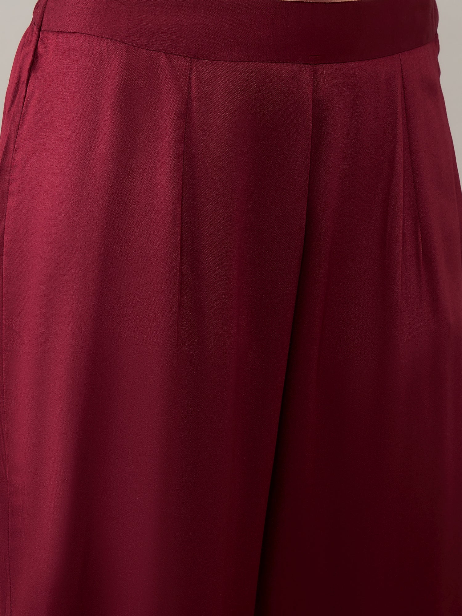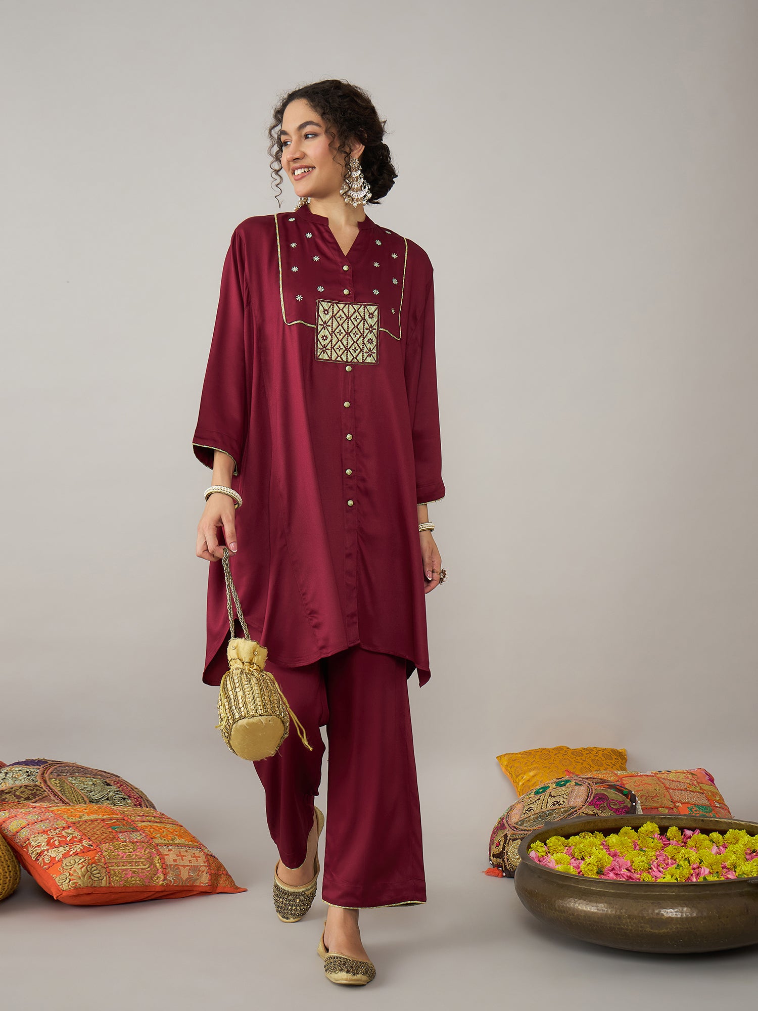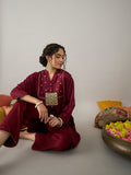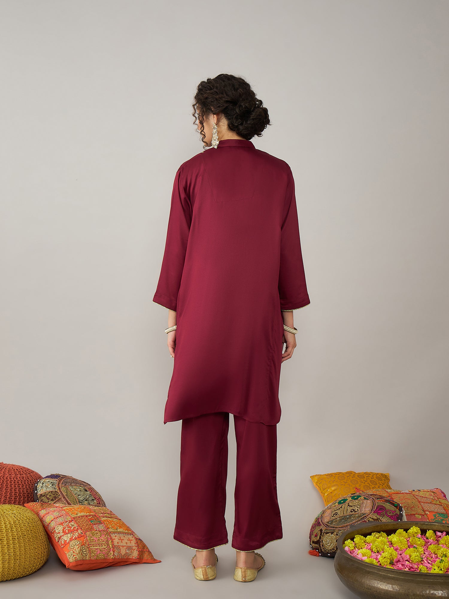 The Rani Kurta Set exudes timeless elegance, featuring a flattering Ban-V neckline and a front button-down placket for a classic touch. The three-quarter length sleeves add a refined and versatile style, perfect for both formal and semi-formal occasions. Paired with matching pants in the same rich hue, this set creates a seamless and sophisticated look. Crafted from luxurious cotton satin, the ensemble offers both comfort and grace, making it a perfect choice for those seeking a stylish and polished outfit.