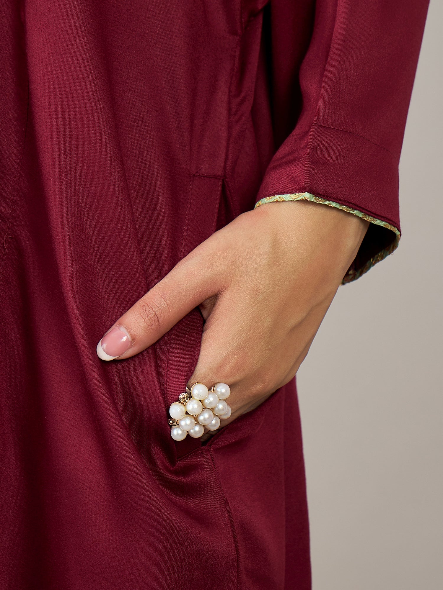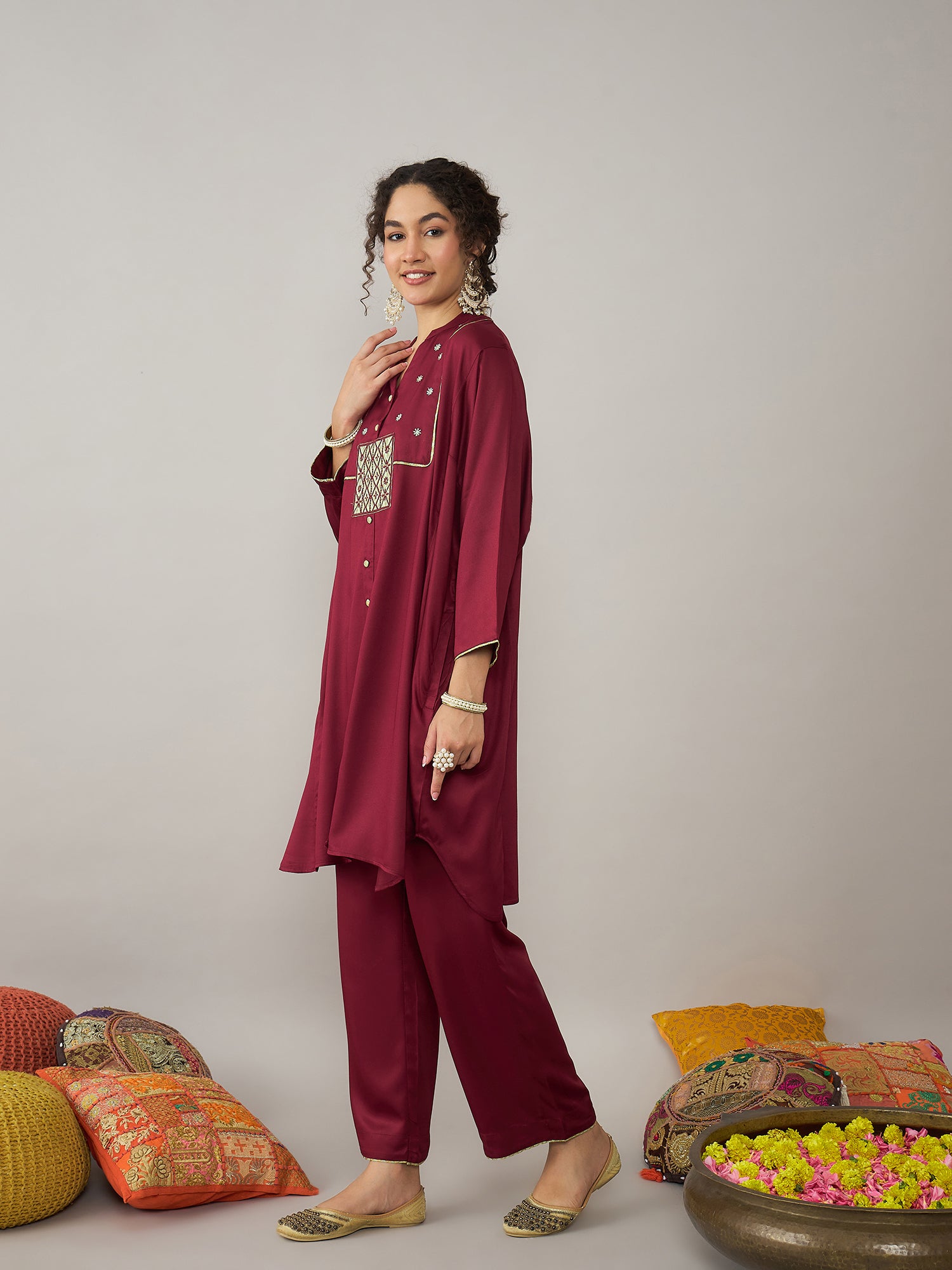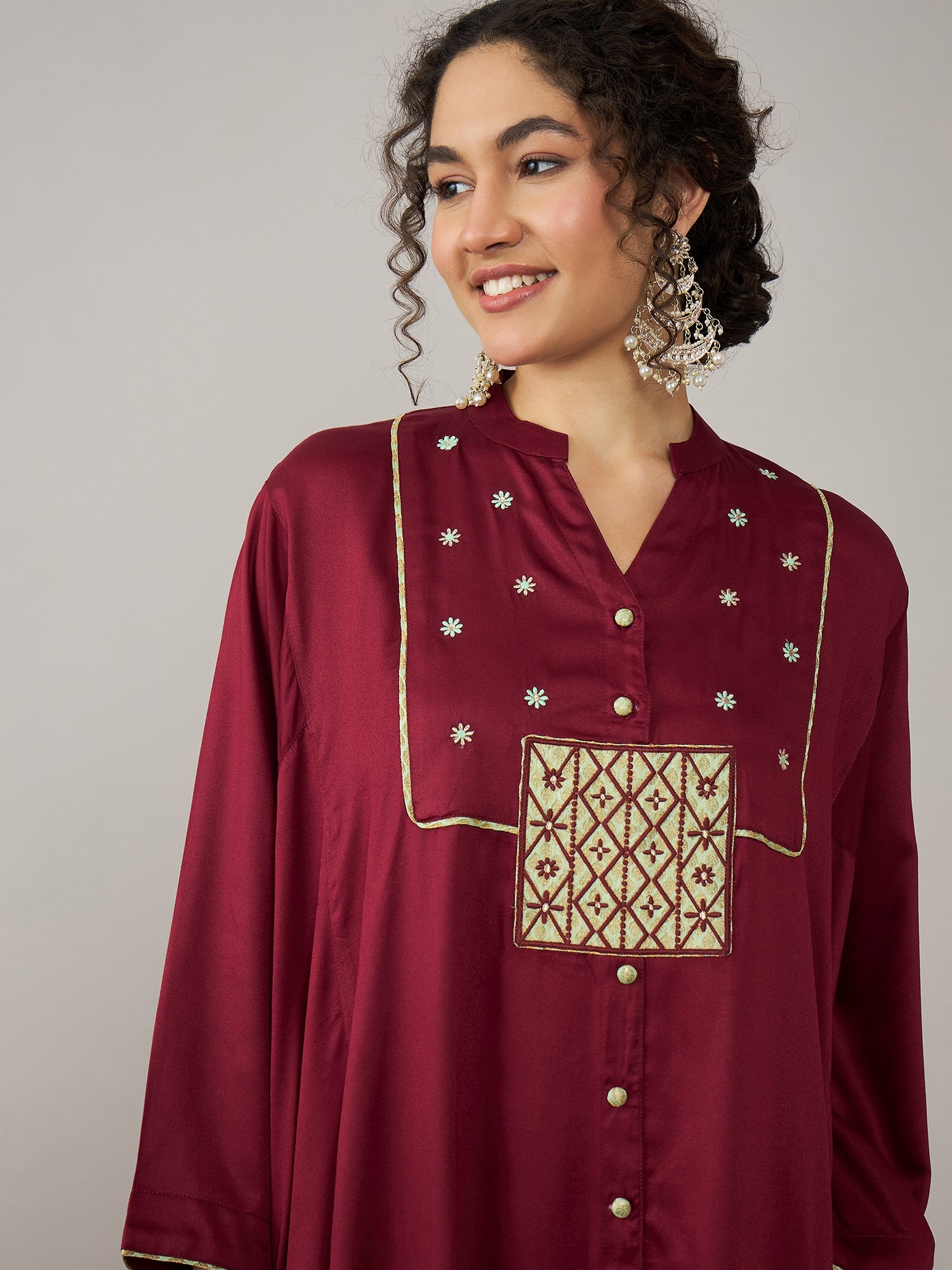 The Rani Kurta Set exudes timeless elegance, featuring a flattering Ban-V neckline and a front button-down placket for a classic touch. The three-quarter length sleeves add a refined and versatile style, perfect for both formal and semi-formal occasions. Paired with matching pants in the same rich hue, this set creates a seamless and sophisticated look. Crafted from luxurious cotton satin, the ensemble offers both comfort and grace, making it a perfect choice for those seeking a stylish and polished outfit.