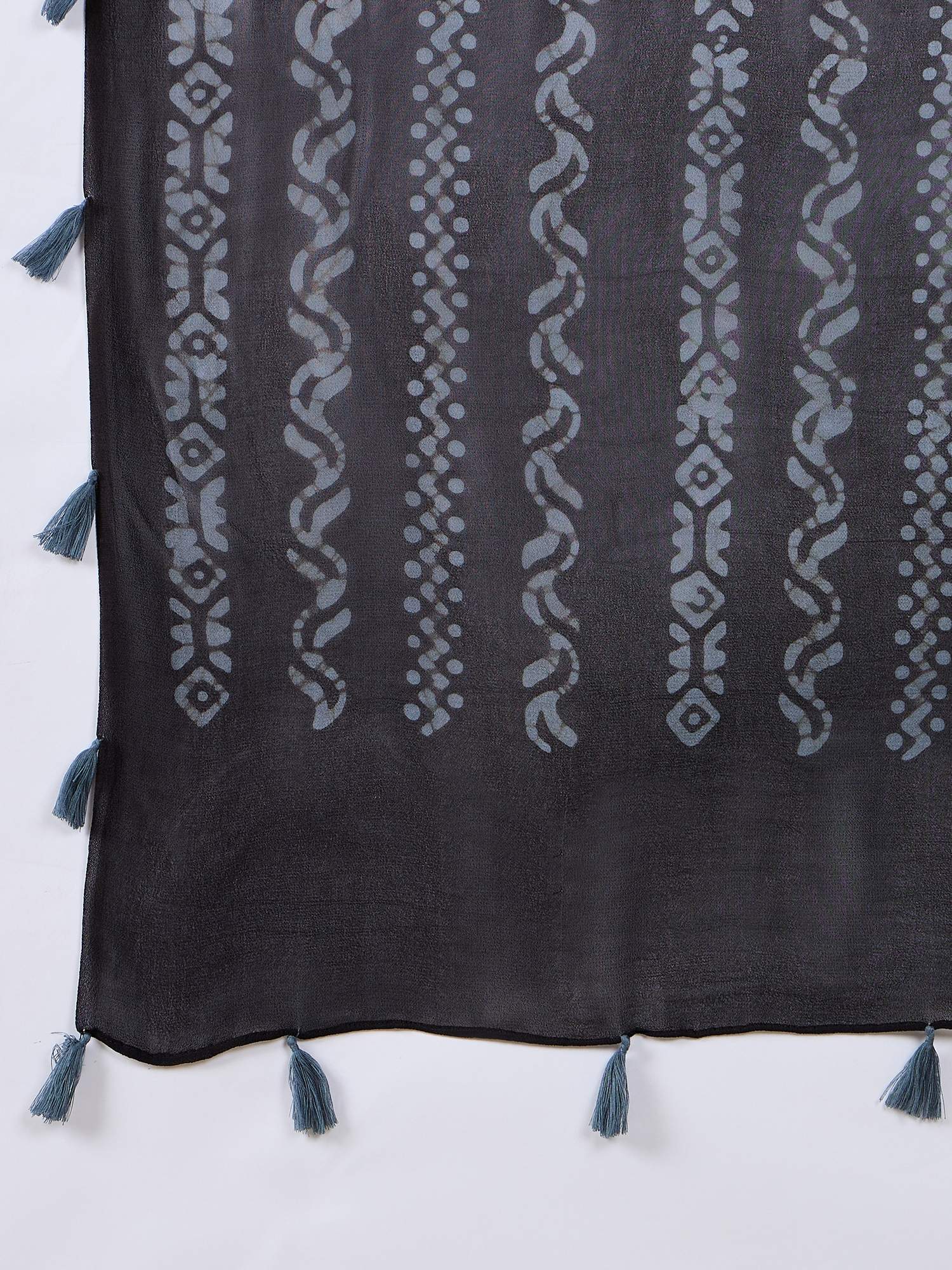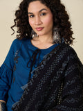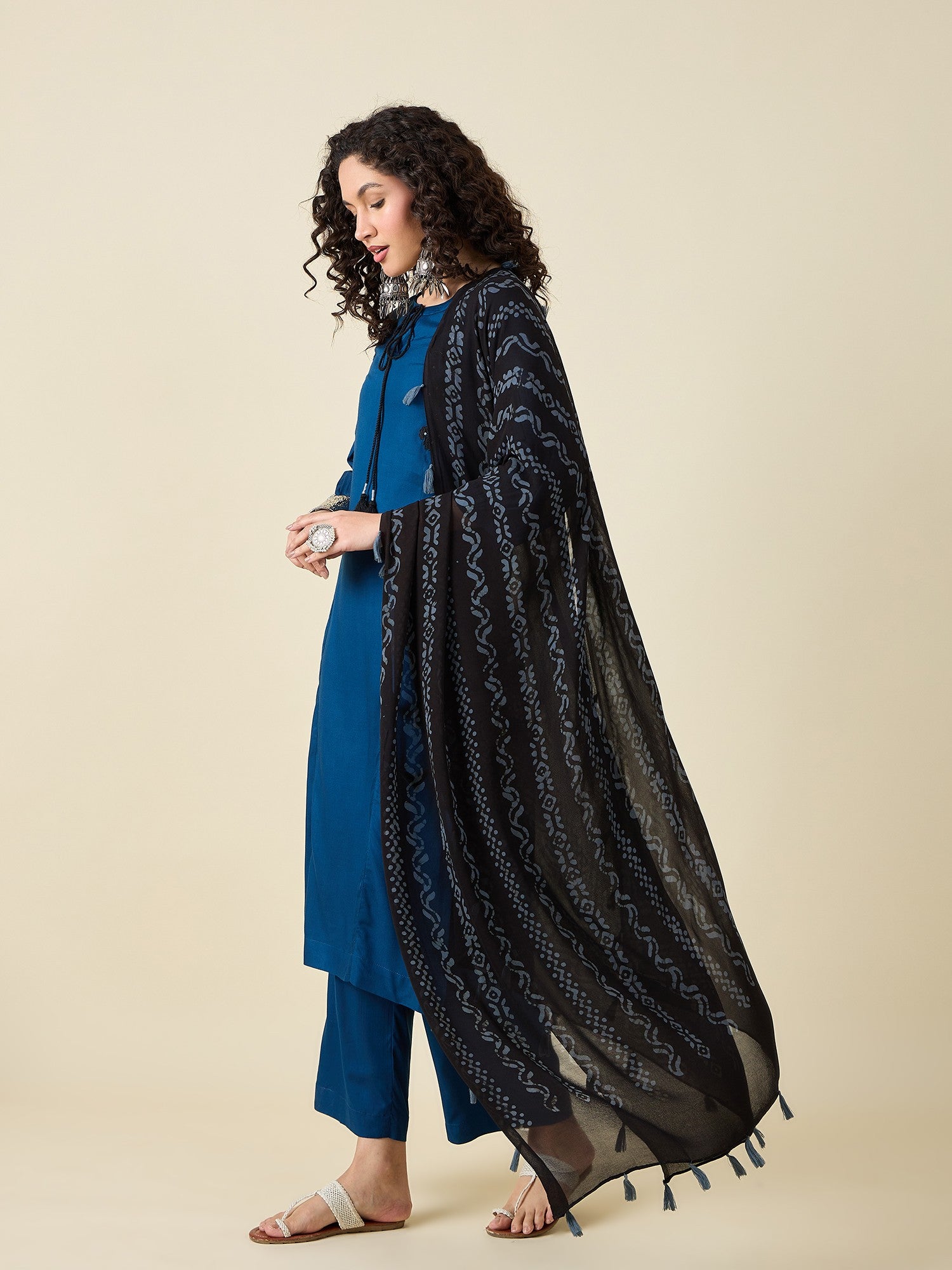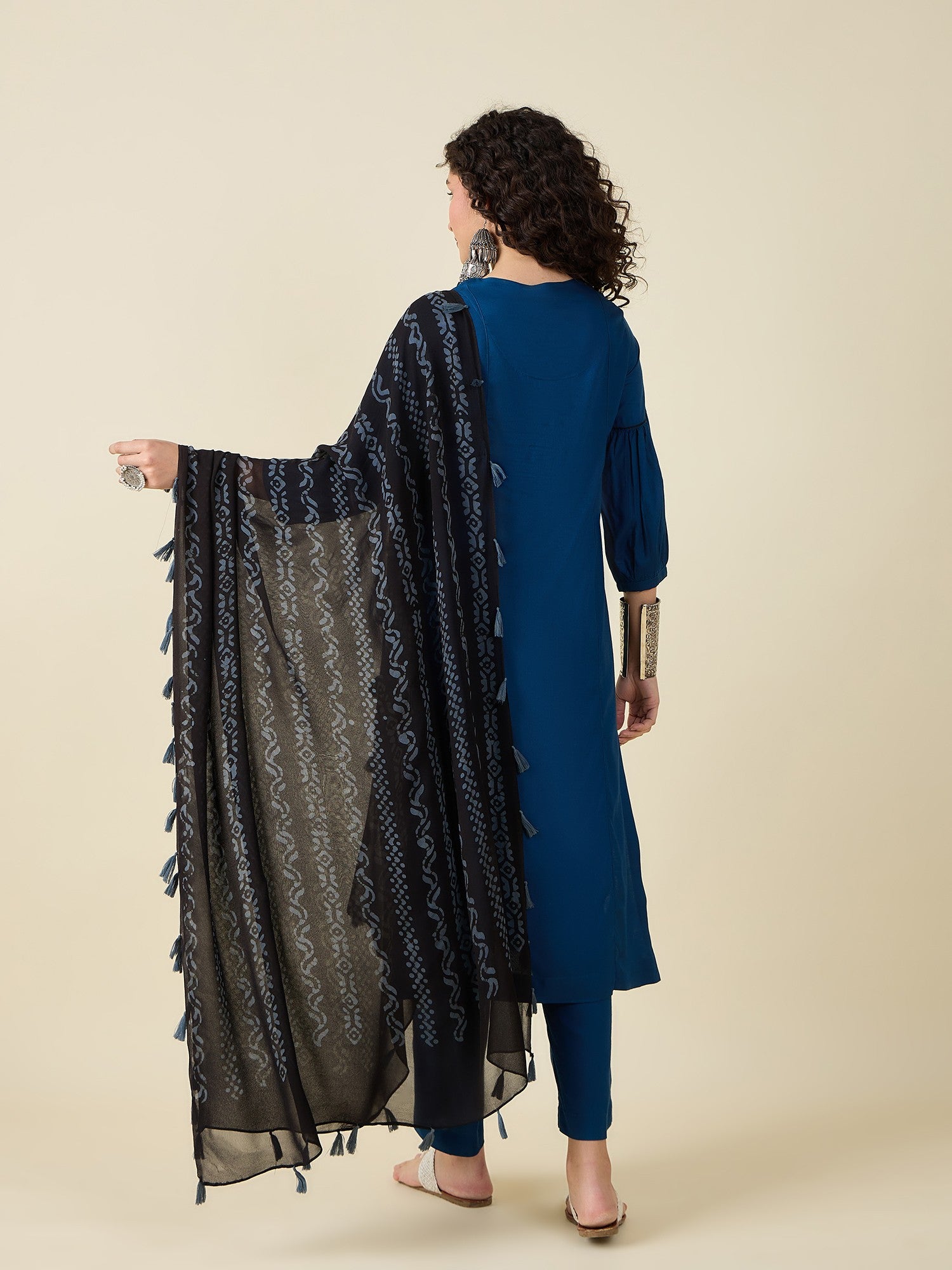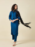 Elevate your ethnic wardrobe with this elegant teal blue kurta set. Crafted from a soft, breathable fabric, the straight-cut kurta features delicate black floral embroidery on the yoke and gathered detailing on the sleeves for a graceful touch. Paired with matching straight-fit trousers, this ensemble offers comfort with style. The highlight is the black printed dupatta adorned with subtle tassels, adding a chic contrast to the look. Perfect for festive gatherings, casual celebrations, or a sophisticated day out.