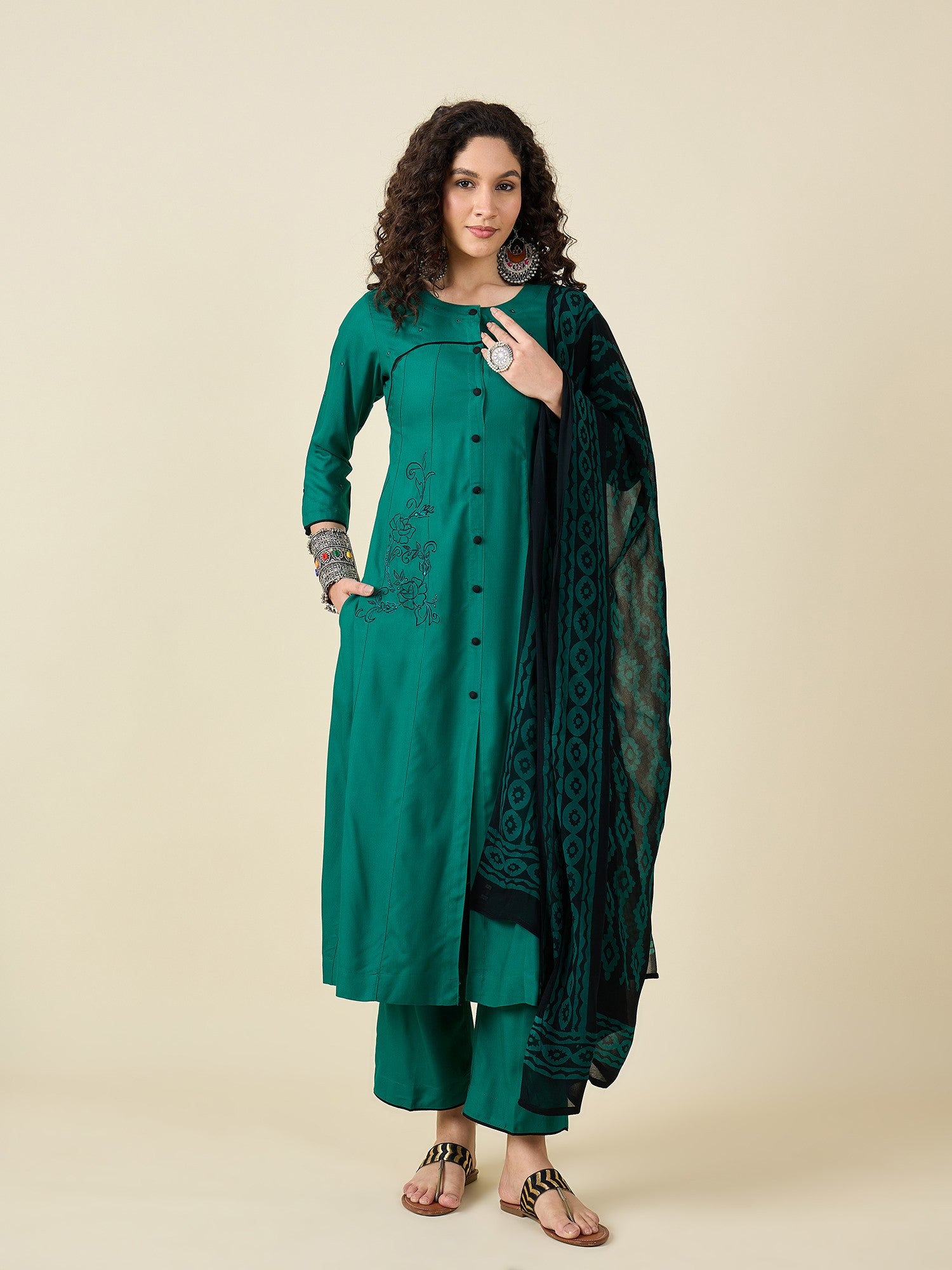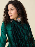 Elevate your ethnic wardrobe with this elegant green kurta set. Crafted from a soft, breathable fabric, the straight-cut kurta features delicate black floral embroidery on the yoke and gathered detailing on the sleeves for a graceful touch. Paired with matching straight-fit trousers, this ensemble offers comfort with style. The highlight is the black printed dupatta adorned with subtle tassels, adding a chic contrast to the look. Perfect for festive gatherings, casual celebrations, or a sophisticated day out.