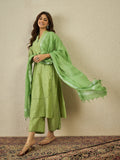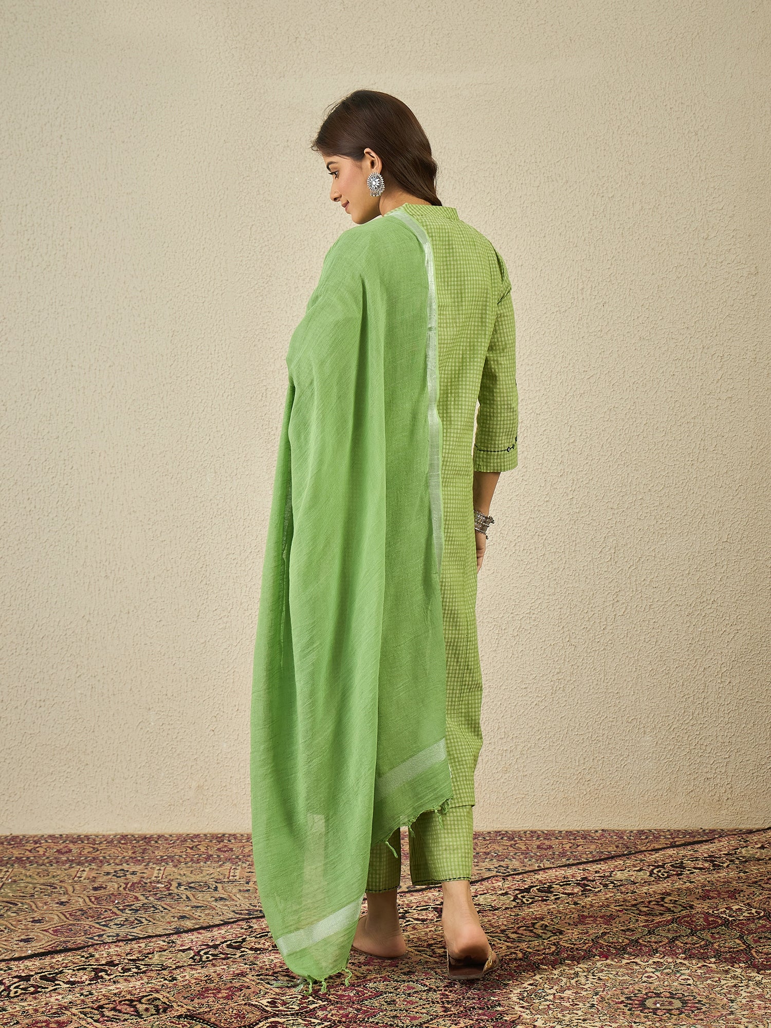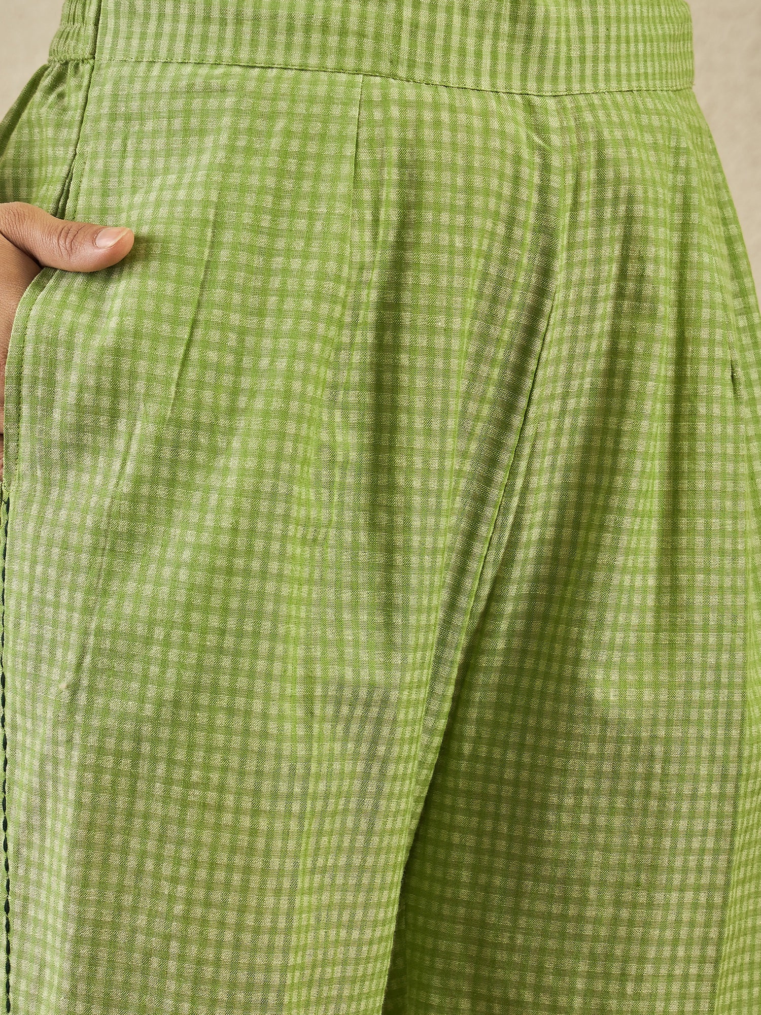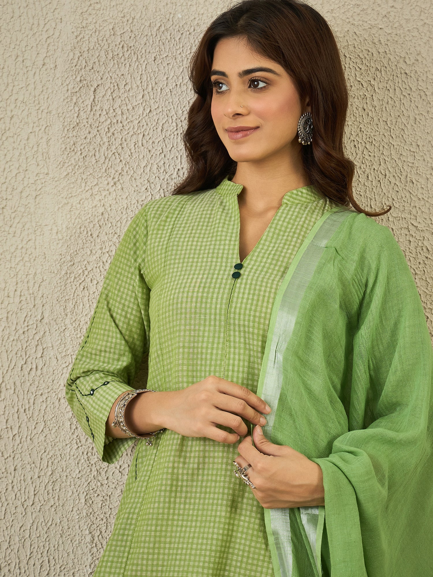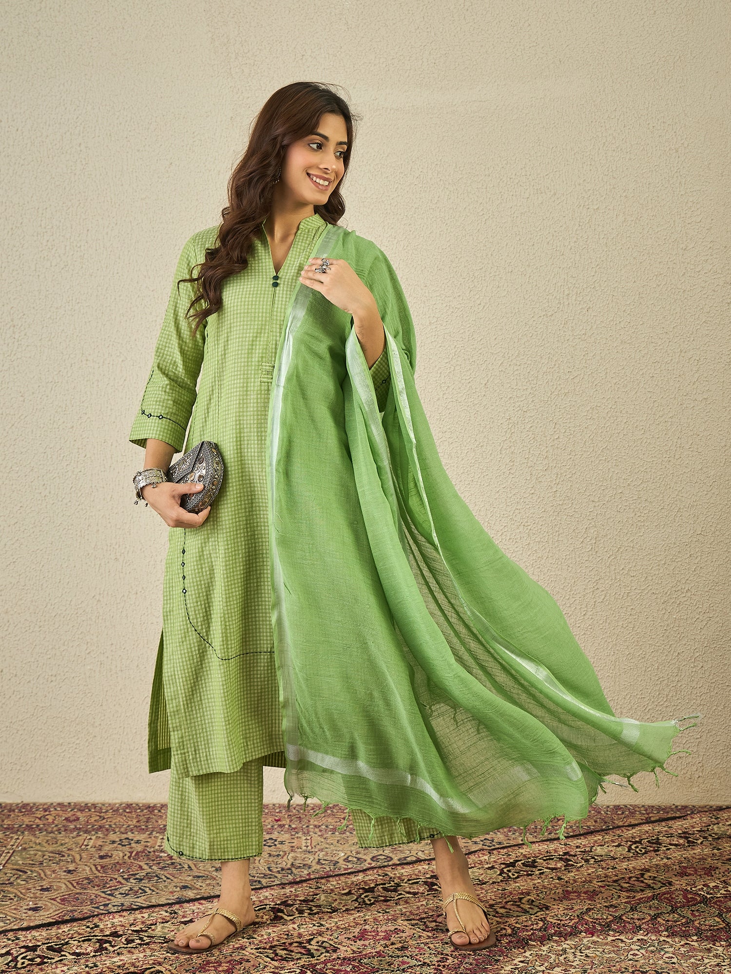 Add a refreshing touch to your everyday ethnic wear with this pea green checked kurta set. Featuring a classic V-neckline and three-quarter sleeves, this kurta showcases subtle threadwork details and statement buttons that add charm to the minimalist design. The matching straight-fit pants offer comfort and ease, making this outfit perfect for casual outings, office wear, or relaxed day gatherings.