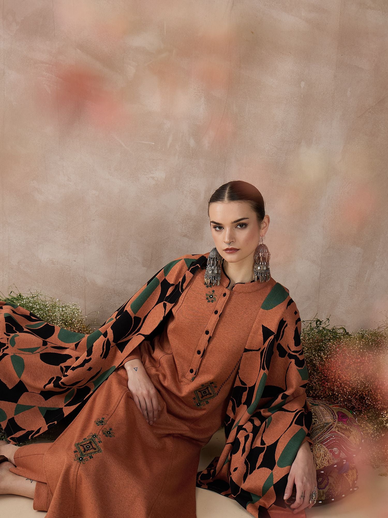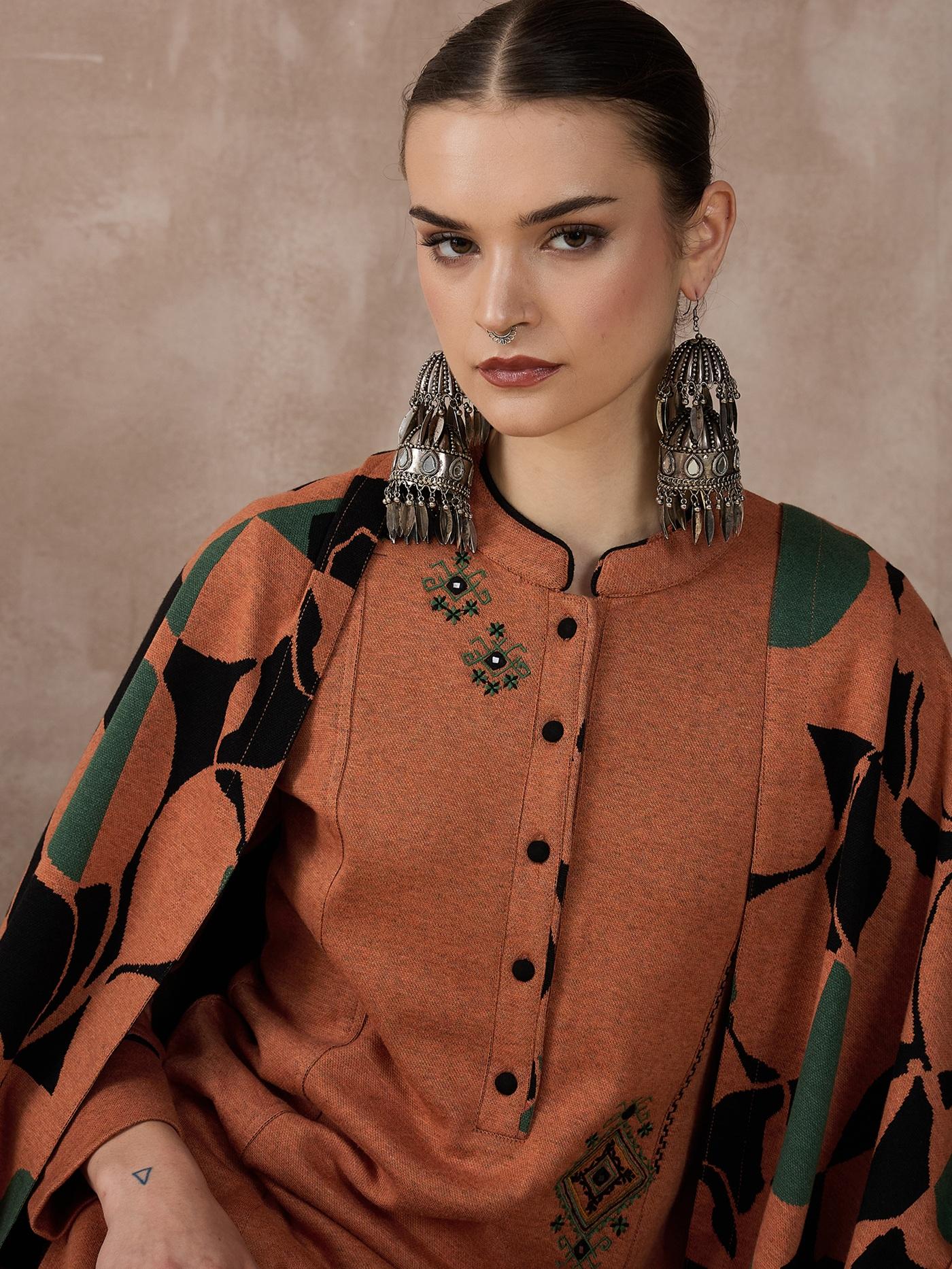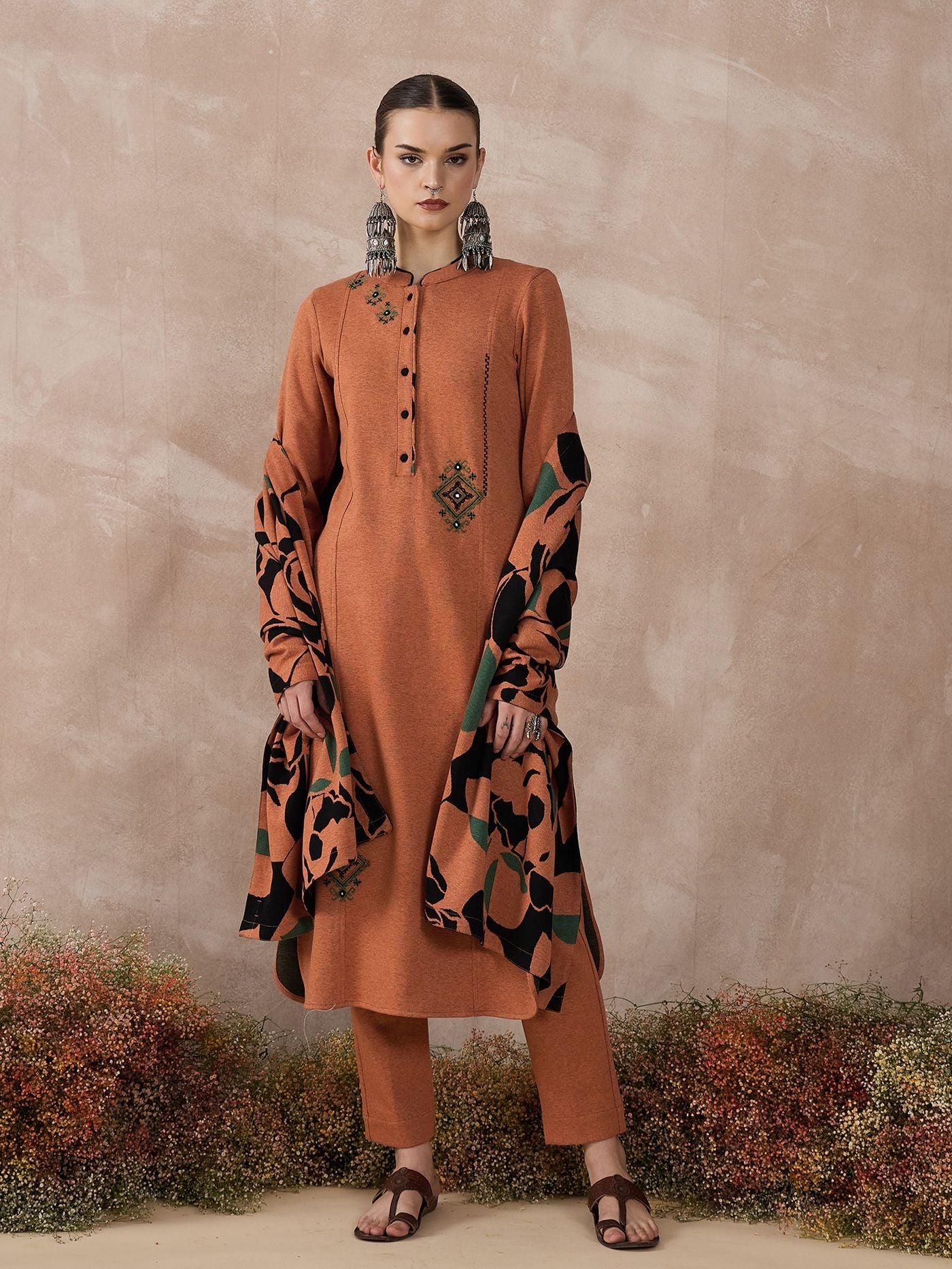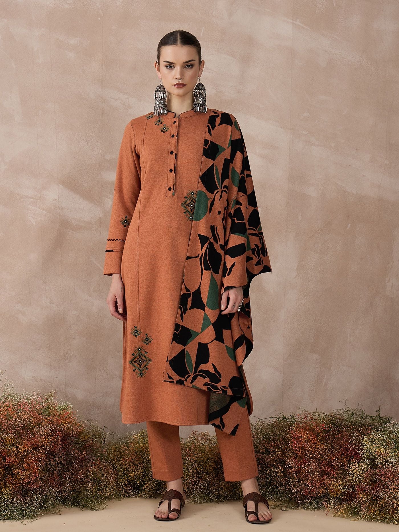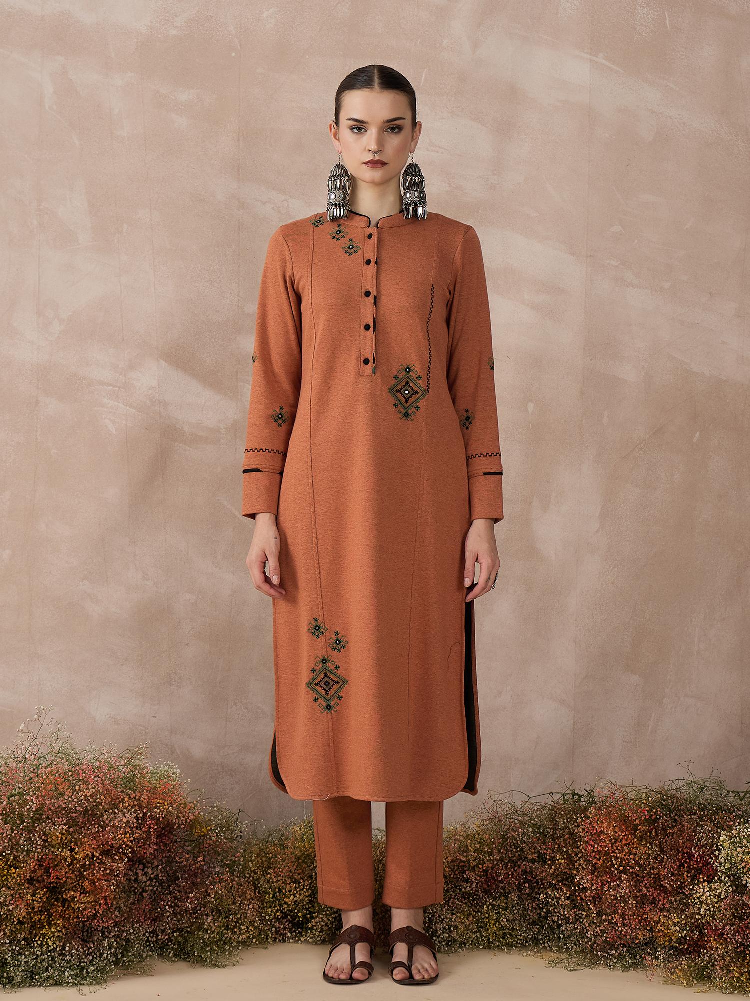 Embrace effortless style and comfort with this chic Kurta Set with Dupatta, crafted from soft viscose velvet. The warm sunset orange shade—a perfect blend of rust and orange tones—adds a subtle yet striking touch, making it ideal for semi-formal gatherings or office wear. Designed for ease and elegance, this ensemble is your go-to choice for a polished, sophisticated look.