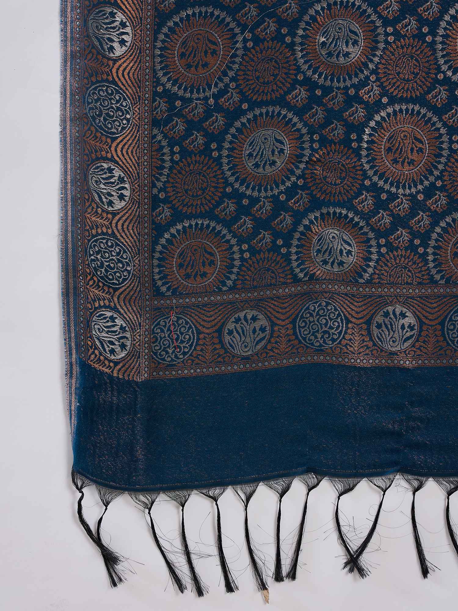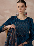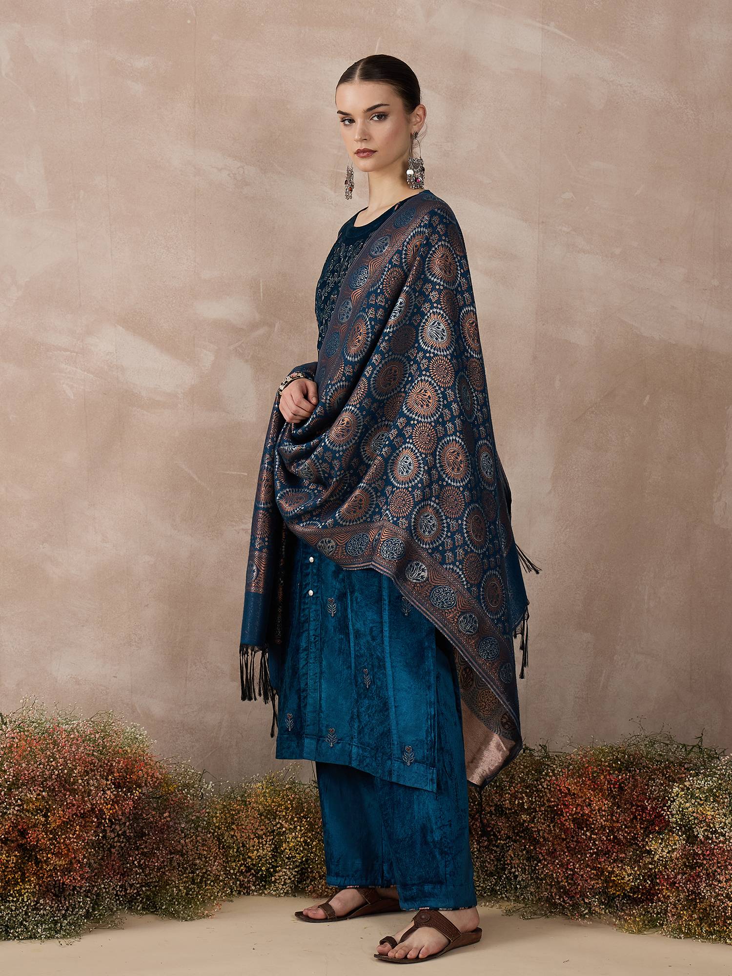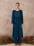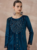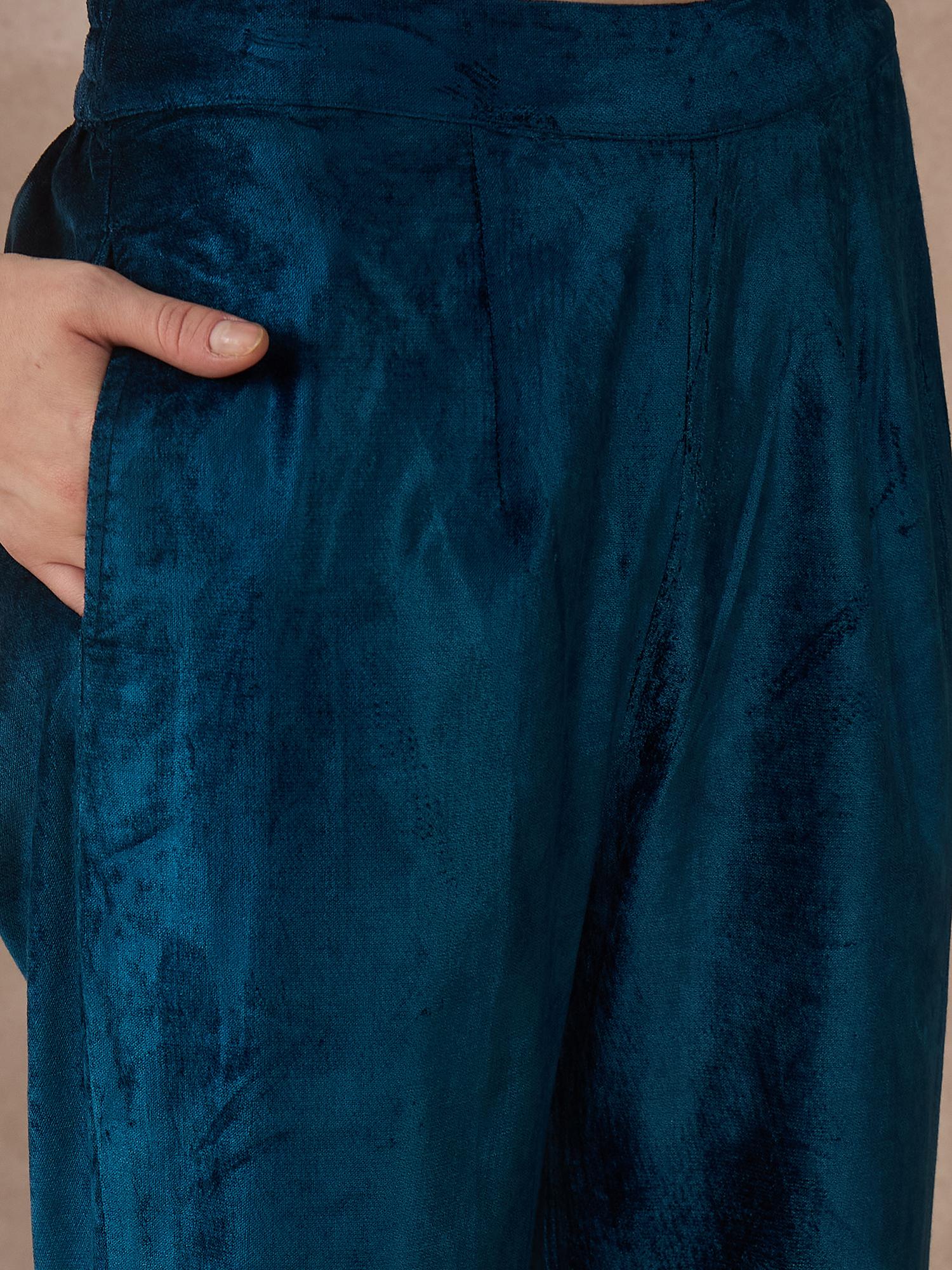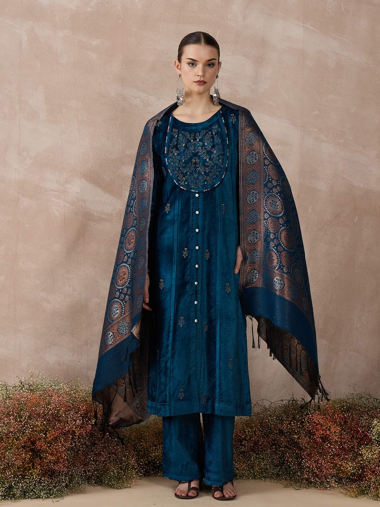 Immerse yourself in timeless elegance with this dark teal viscose velvet A-line kurti set, thoughtfully crafted for festive occasions. The kurta showcases intricate jaal embroidery on the yoke and delicate chitta work on the kalis, designed in a harmonious blend of two zari tones, creating a rich, textured appeal.