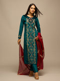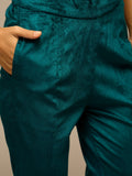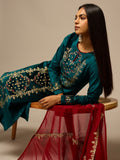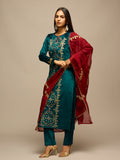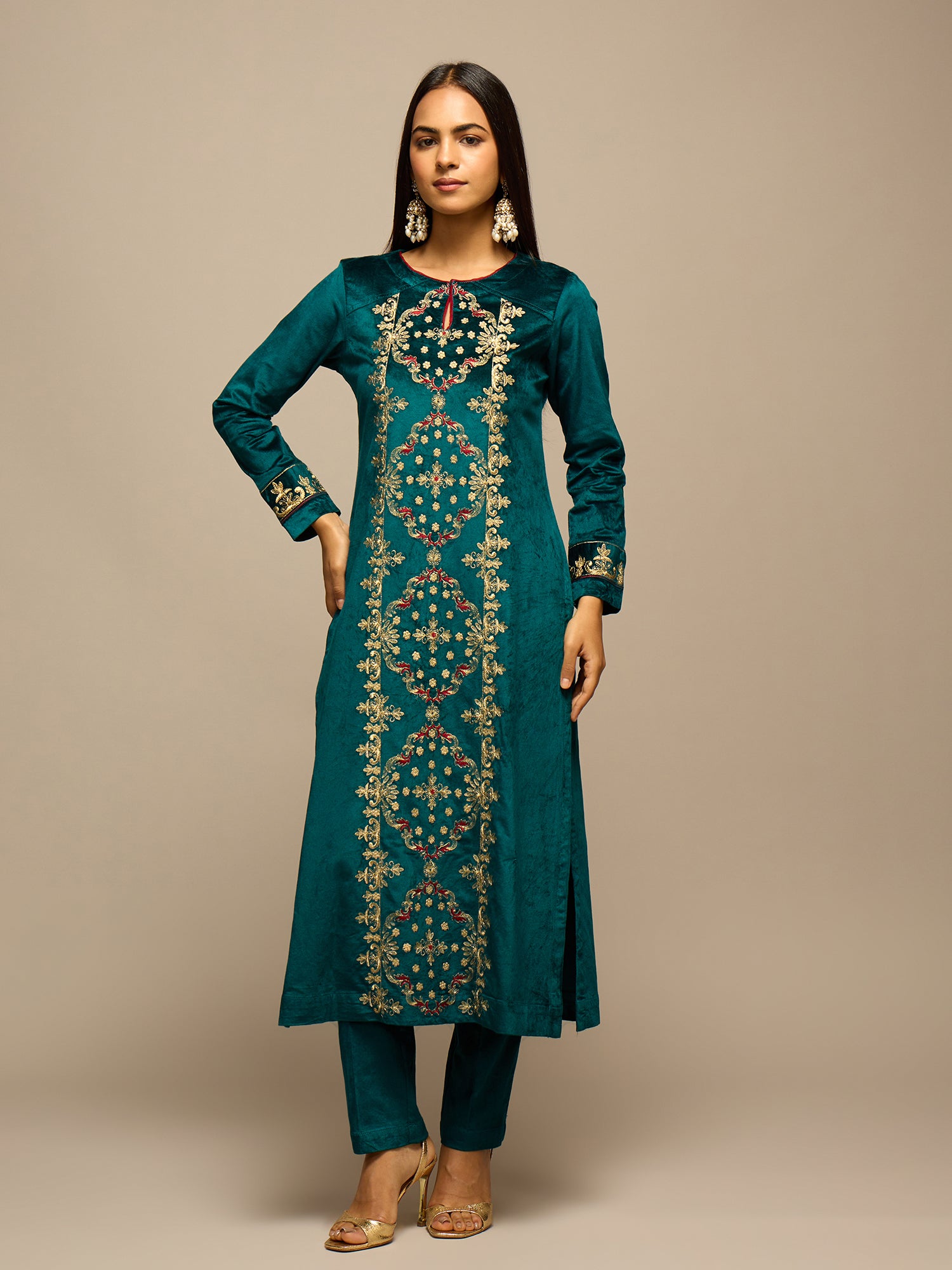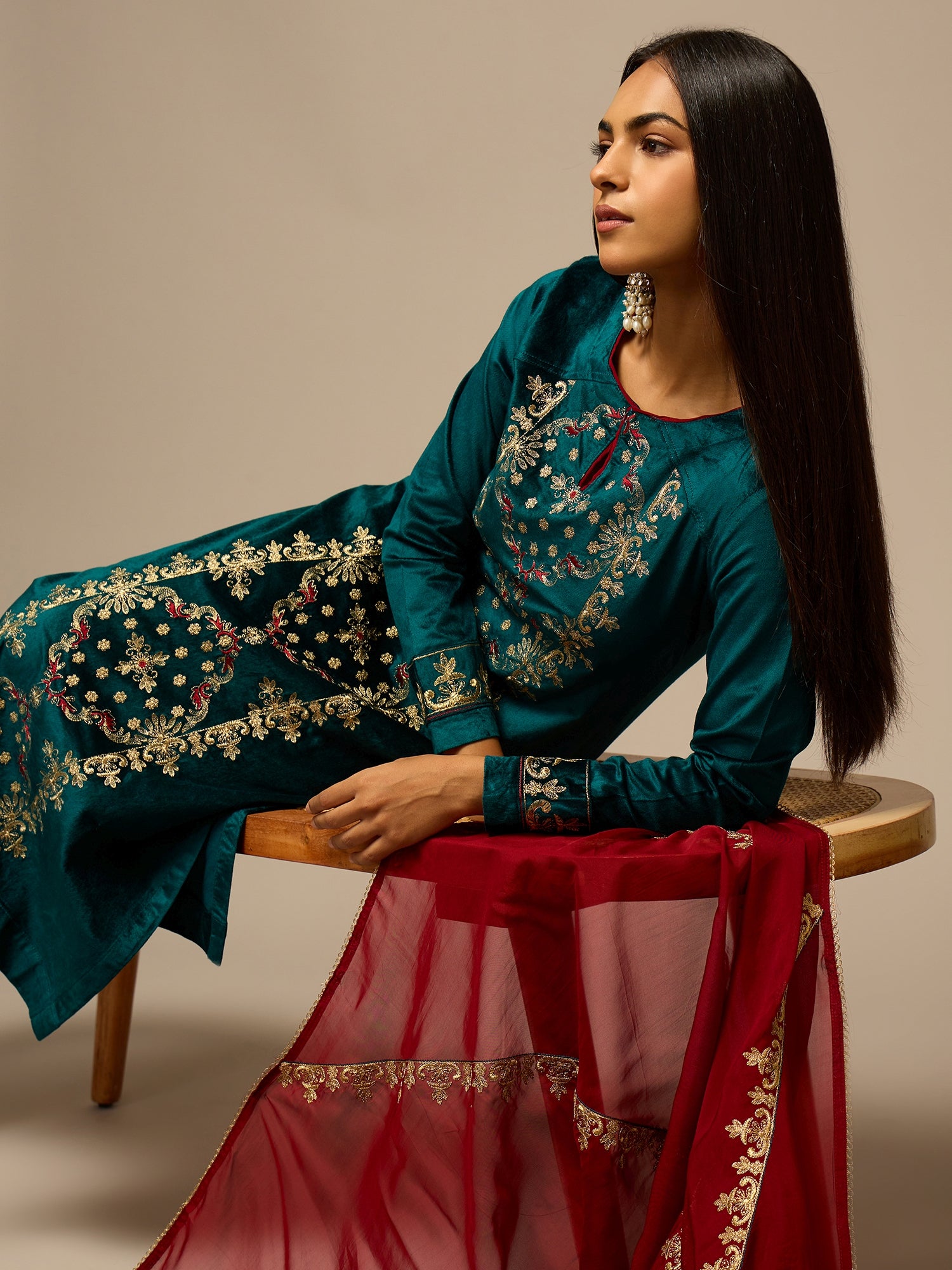 Step into elegance with this exquisite teal velvet kurta set. Featuring a round neck with a delicate keyhole detail, the kurta is beautifully embellished with intricate heavy zari embroidery across the front and sleeves, lending a regal touch. It is paired with straight pants and a contrasting dupatta, creating a refined ensemble perfect for festive celebrations.