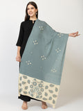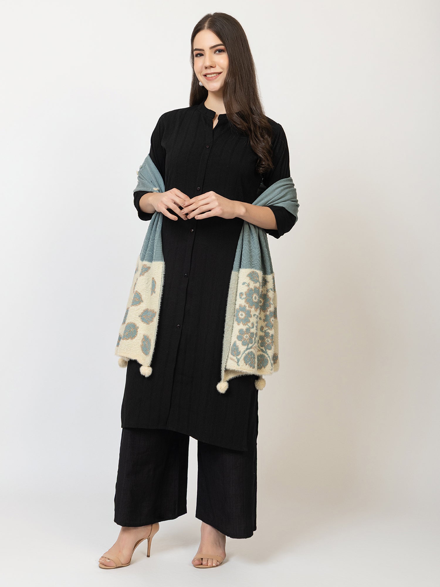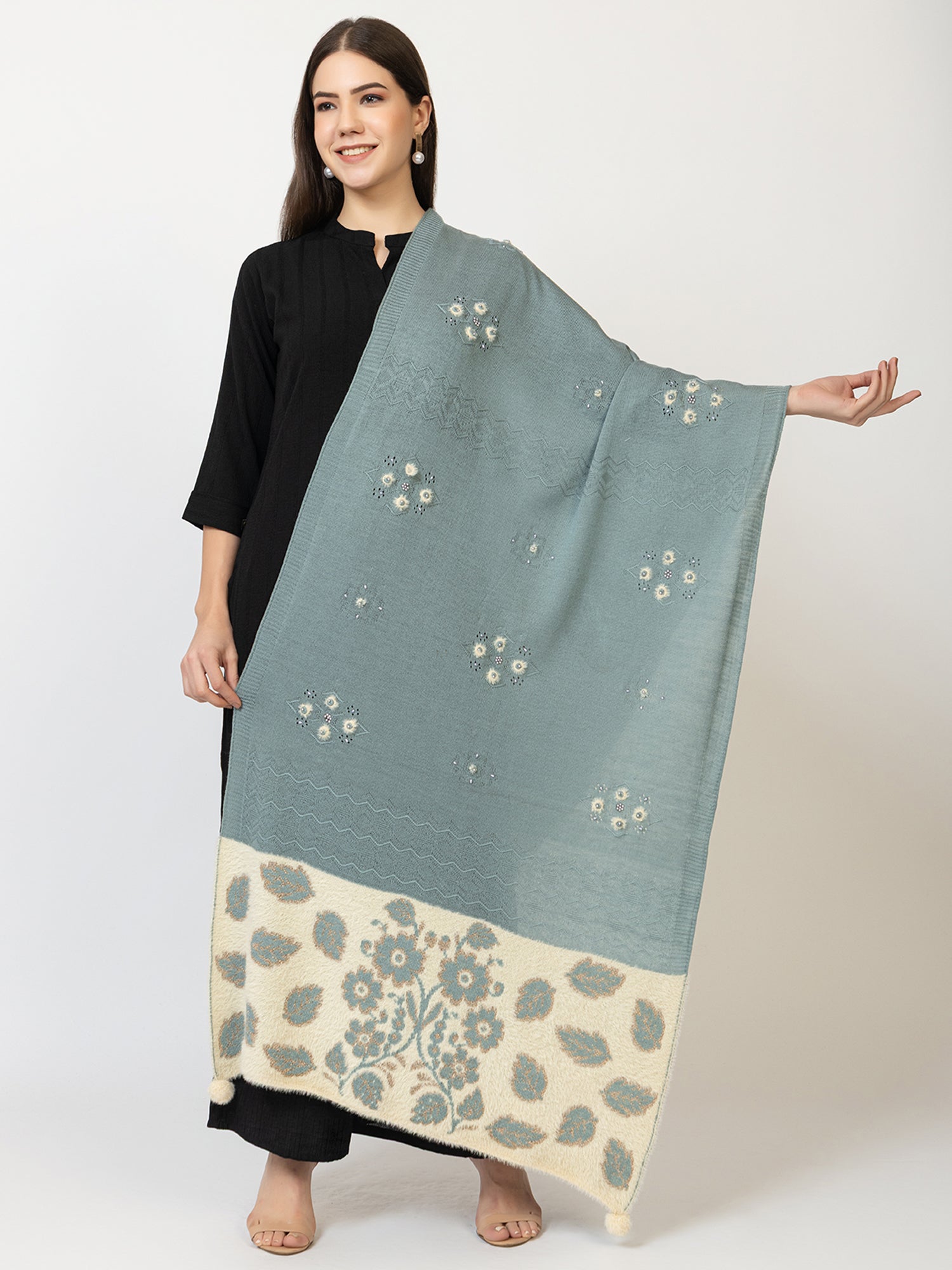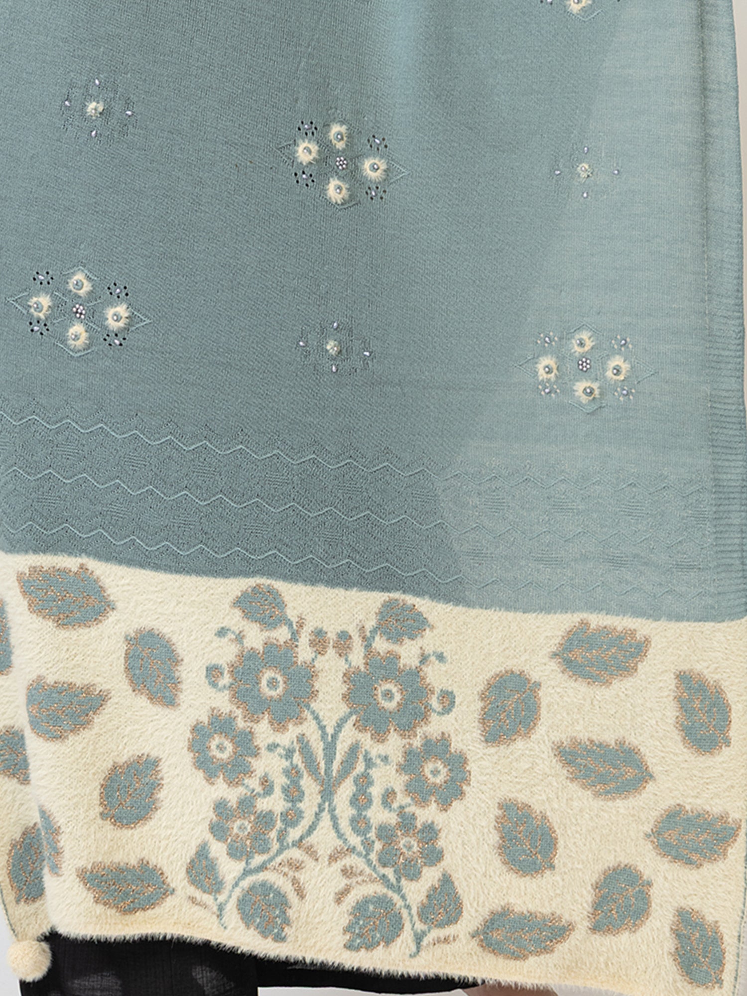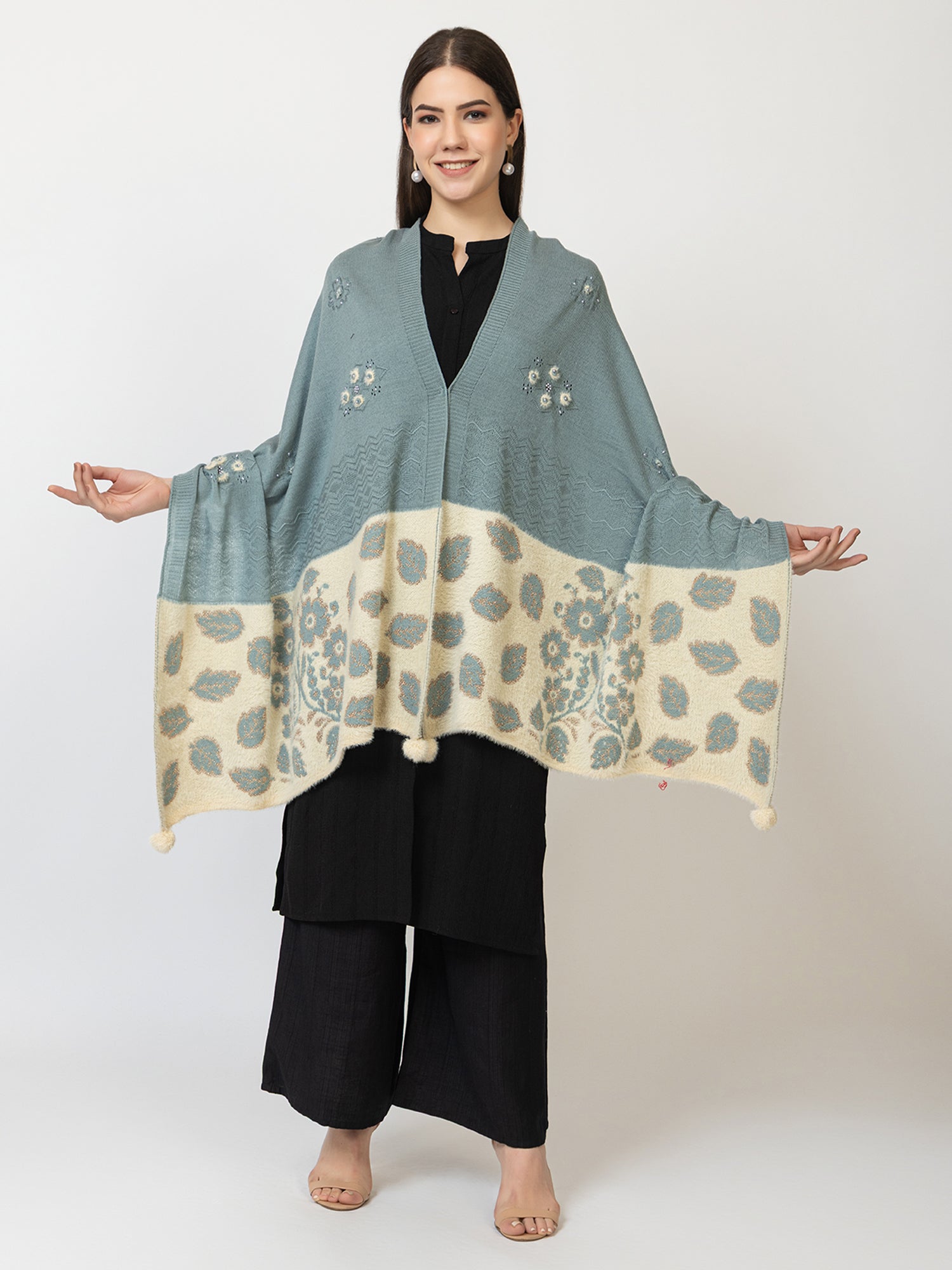 Stay warm in style with The Winter Bloom Woollen Shawl, crafted from soft premium wool for luxurious winter comfort. The upper section features delicate floral embroidery scattered across a calming blue surface, while the lower ivory panel displays elegant leaf and flower motifs with textured detailing. Finished with handcrafted pom-pom tassels, this shawl makes a graceful companion for everyday elegance and celebration dressing.