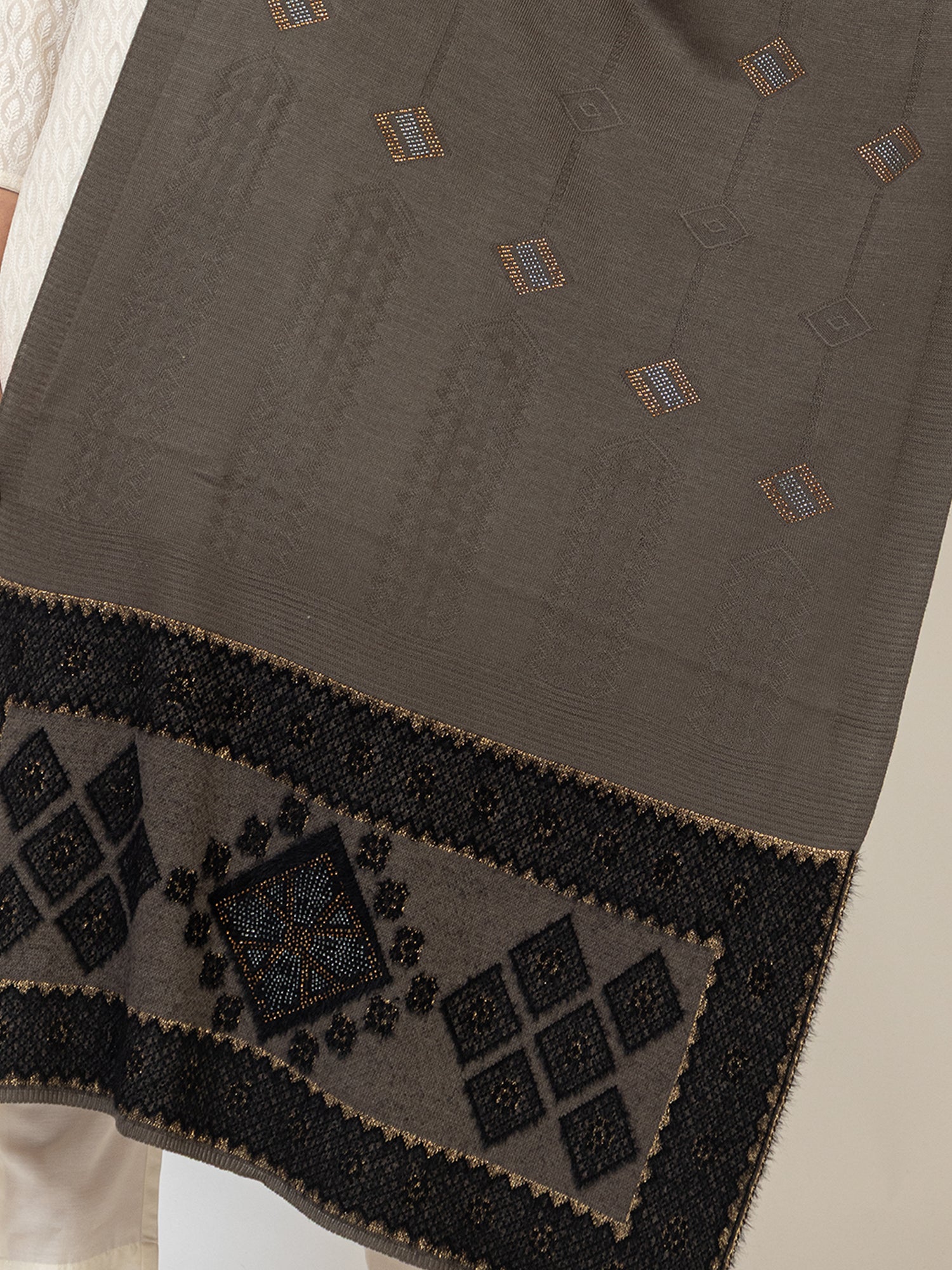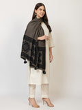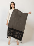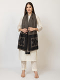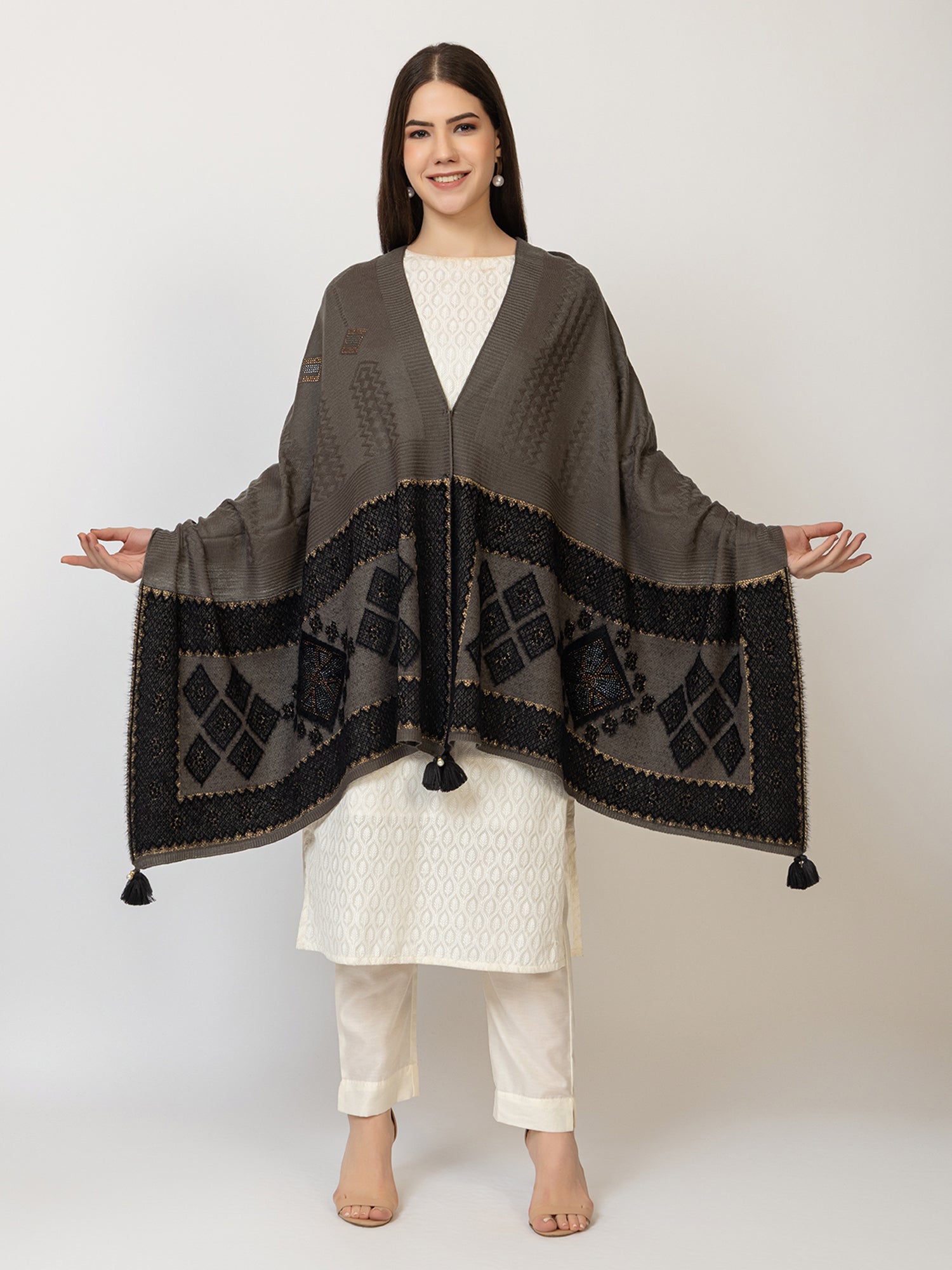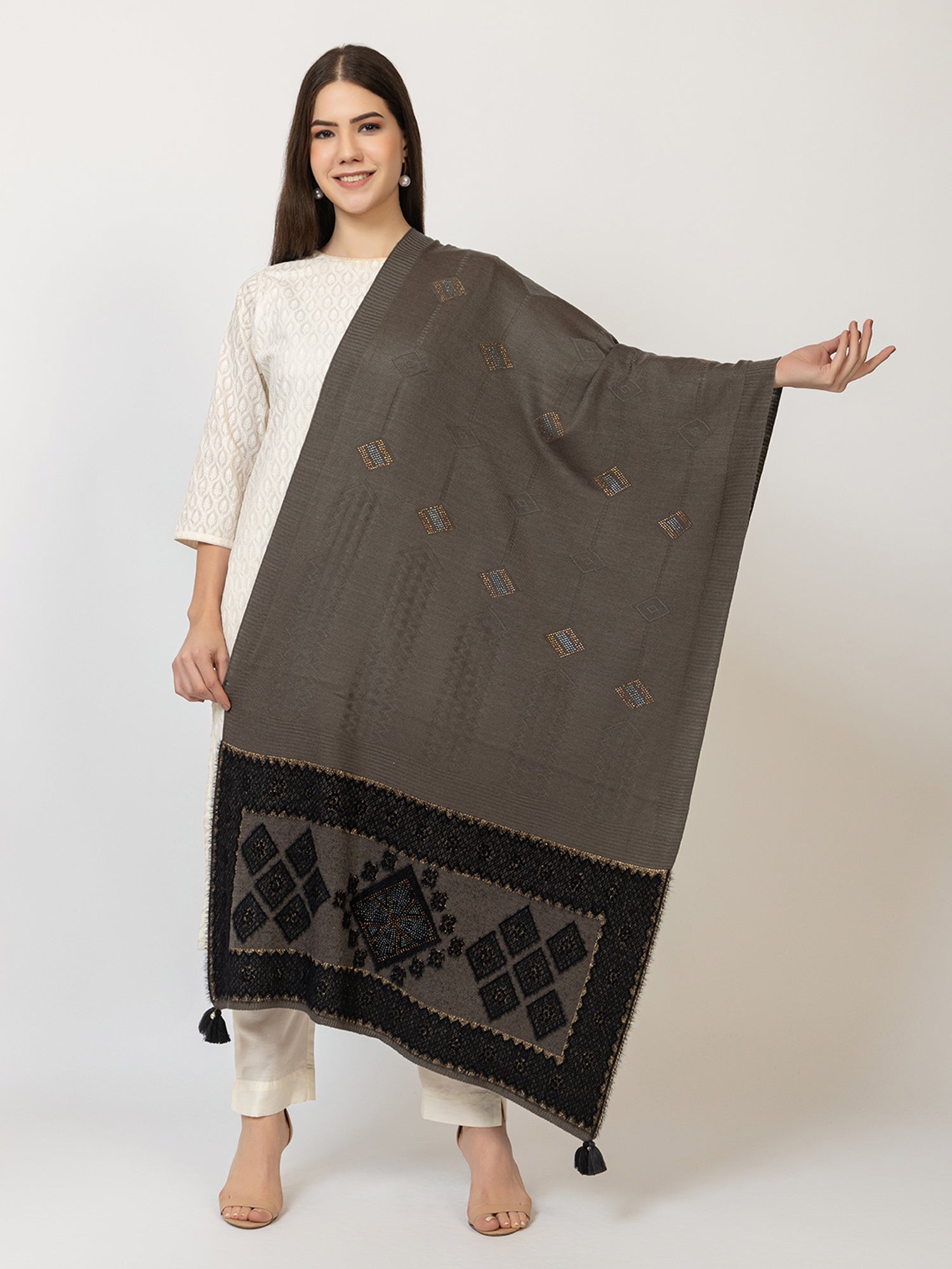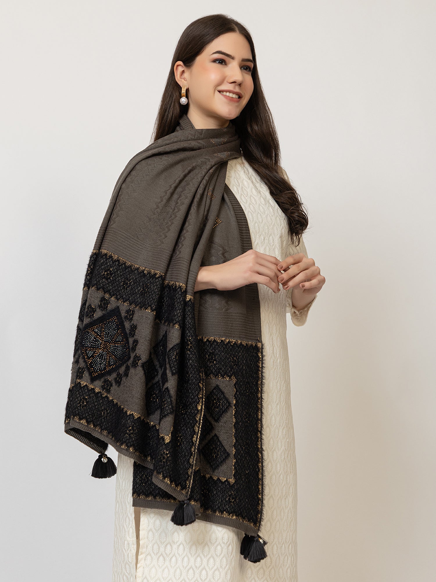 Refined, warm, and effortlessly elegant — The Charcoal Royale Woollen Shawl is crafted from premium soft wool and adorned with intricate hand-inspired detailing. The upper charcoal panel features textured woven patterns, while the lower section showcases rich black geometric embroidery with subtle gold accents. Finished with handcrafted tassels, this shawl brings a luxurious artisanal touch to winter layering, festive ensembles, and everyday sophistication.