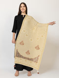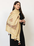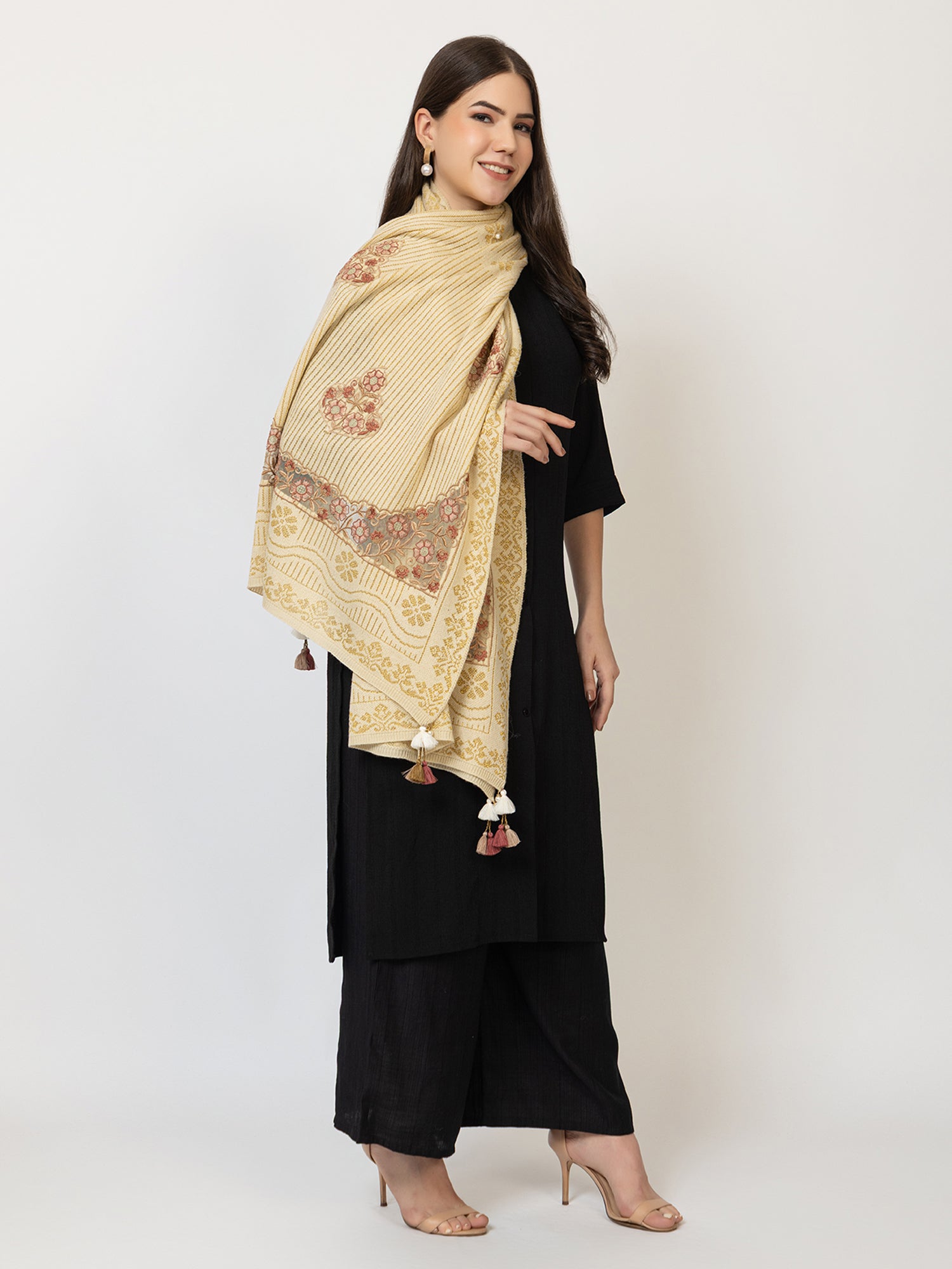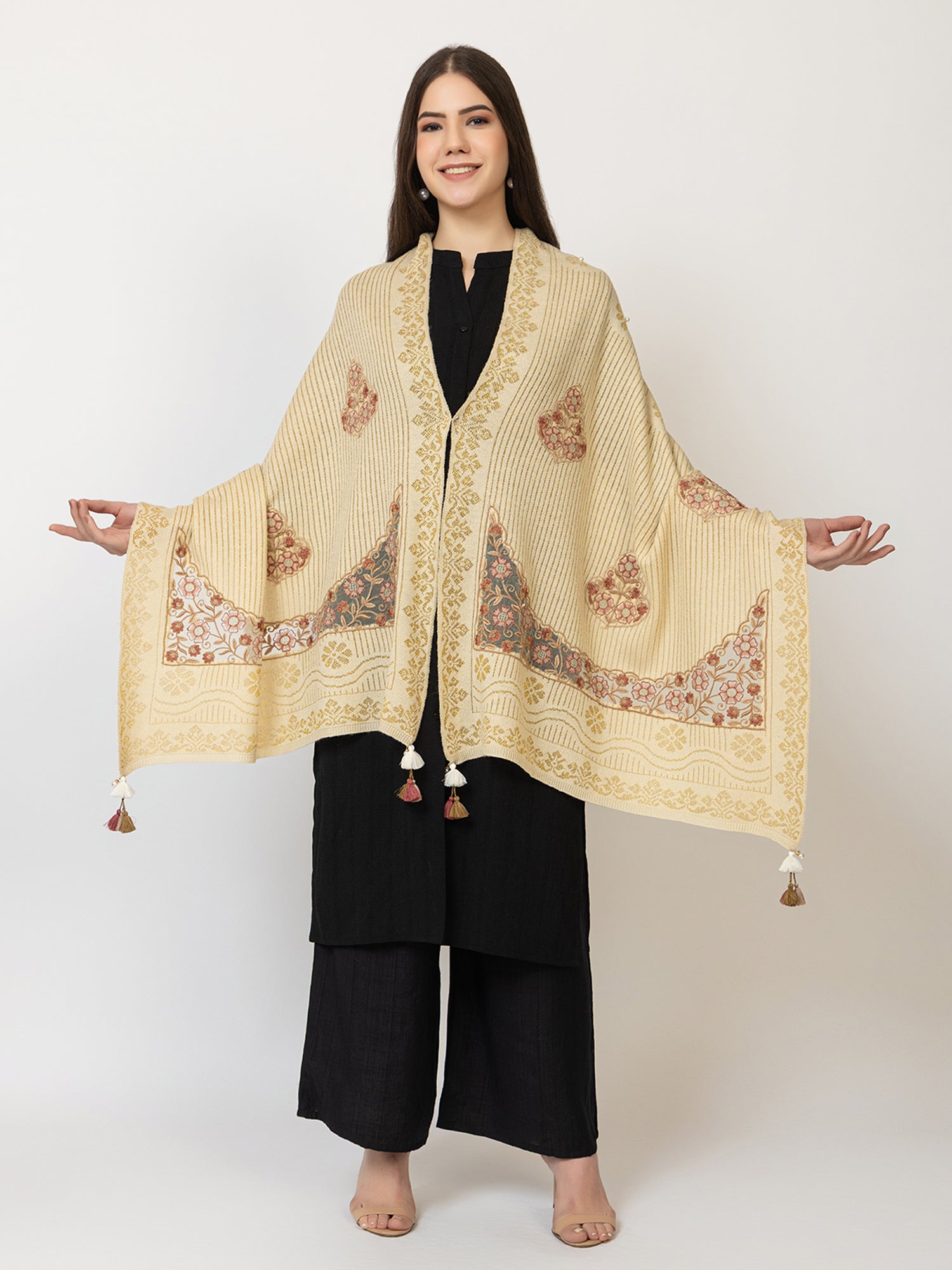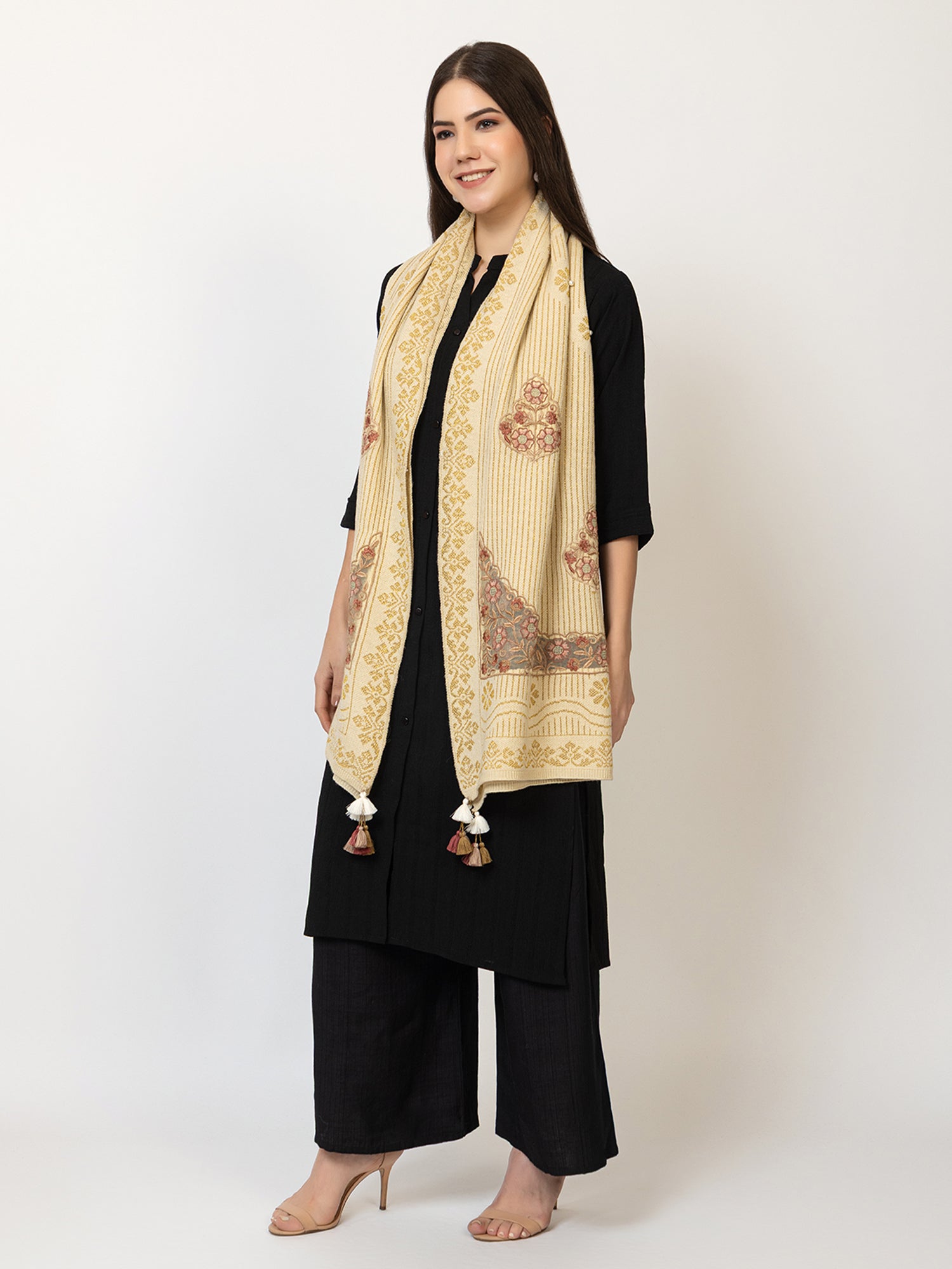 Embrace timeless sophistication with The Ivory Heritage Woollen Shawl, crafted from soft, premium wool for unmatched winter comfort. The shawl features an elegant ivory base with delicate vertical textures, adorned with intricate paisley-inspired floral motifs in warm earthy tones. The beautifully detailed border and multicolour tassels add a luxurious artisanal touch, making this shawl a perfect pick for festive celebrations, gifting, or elevating your everyday winter wardrobe.