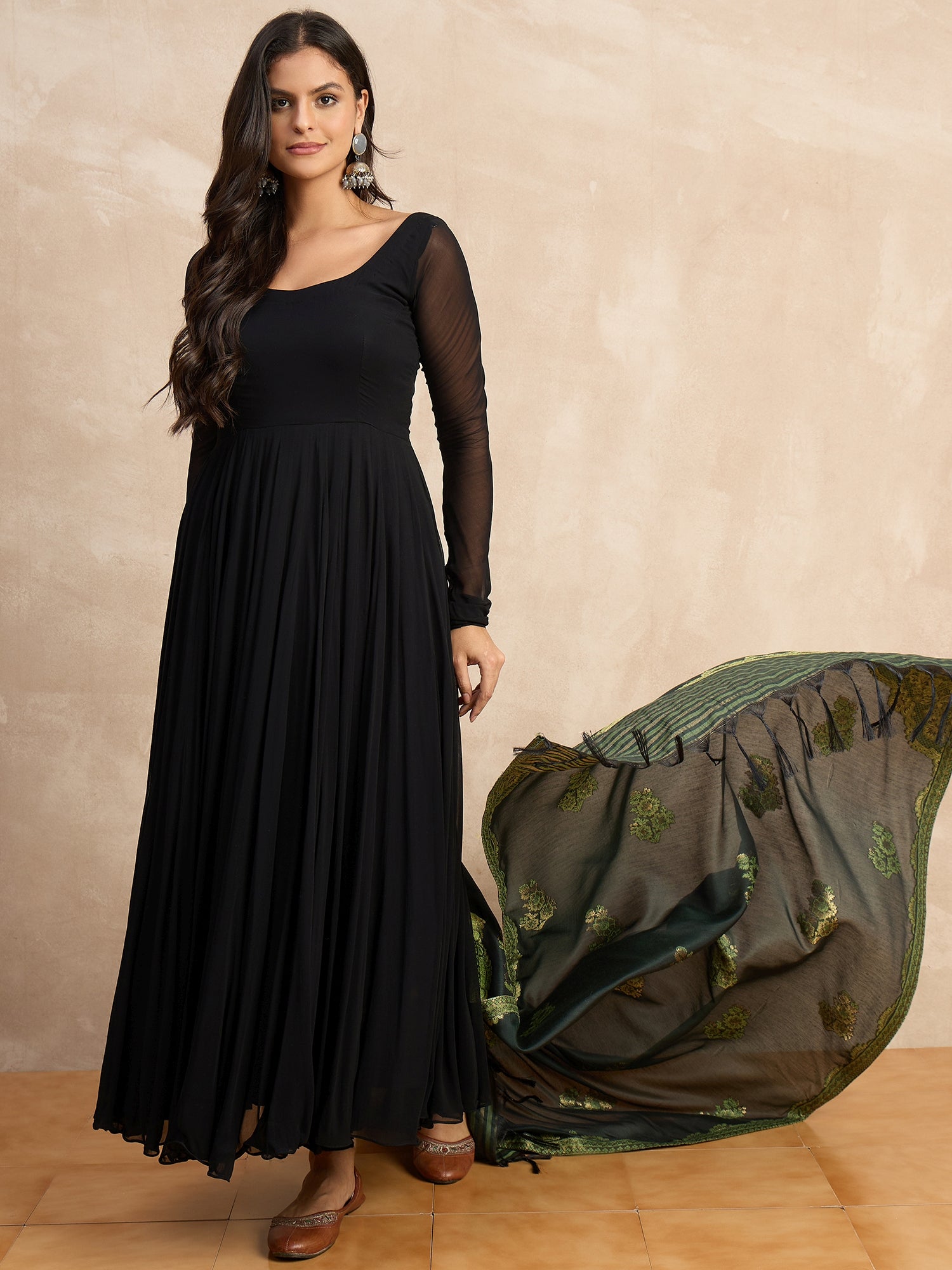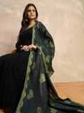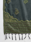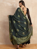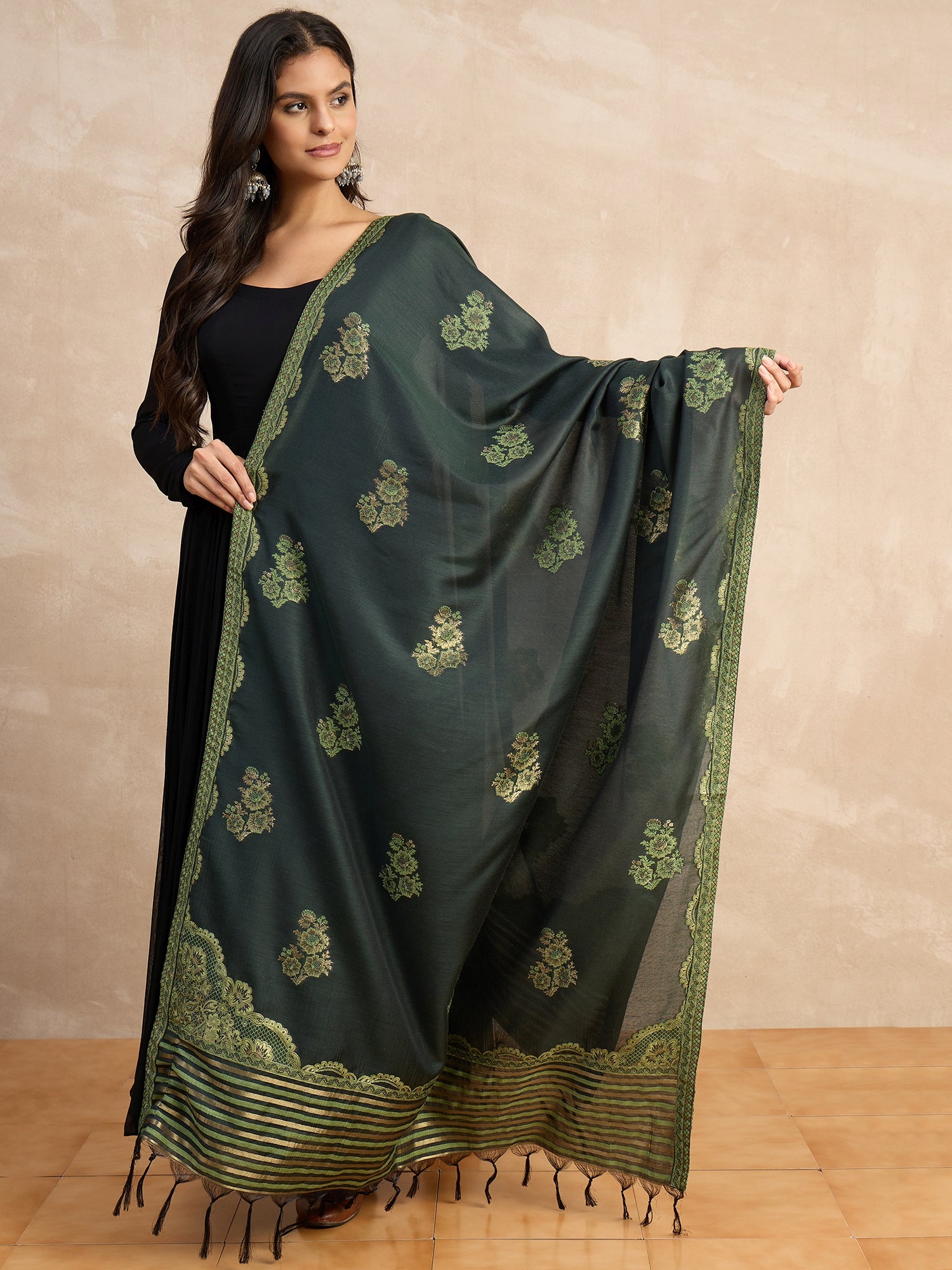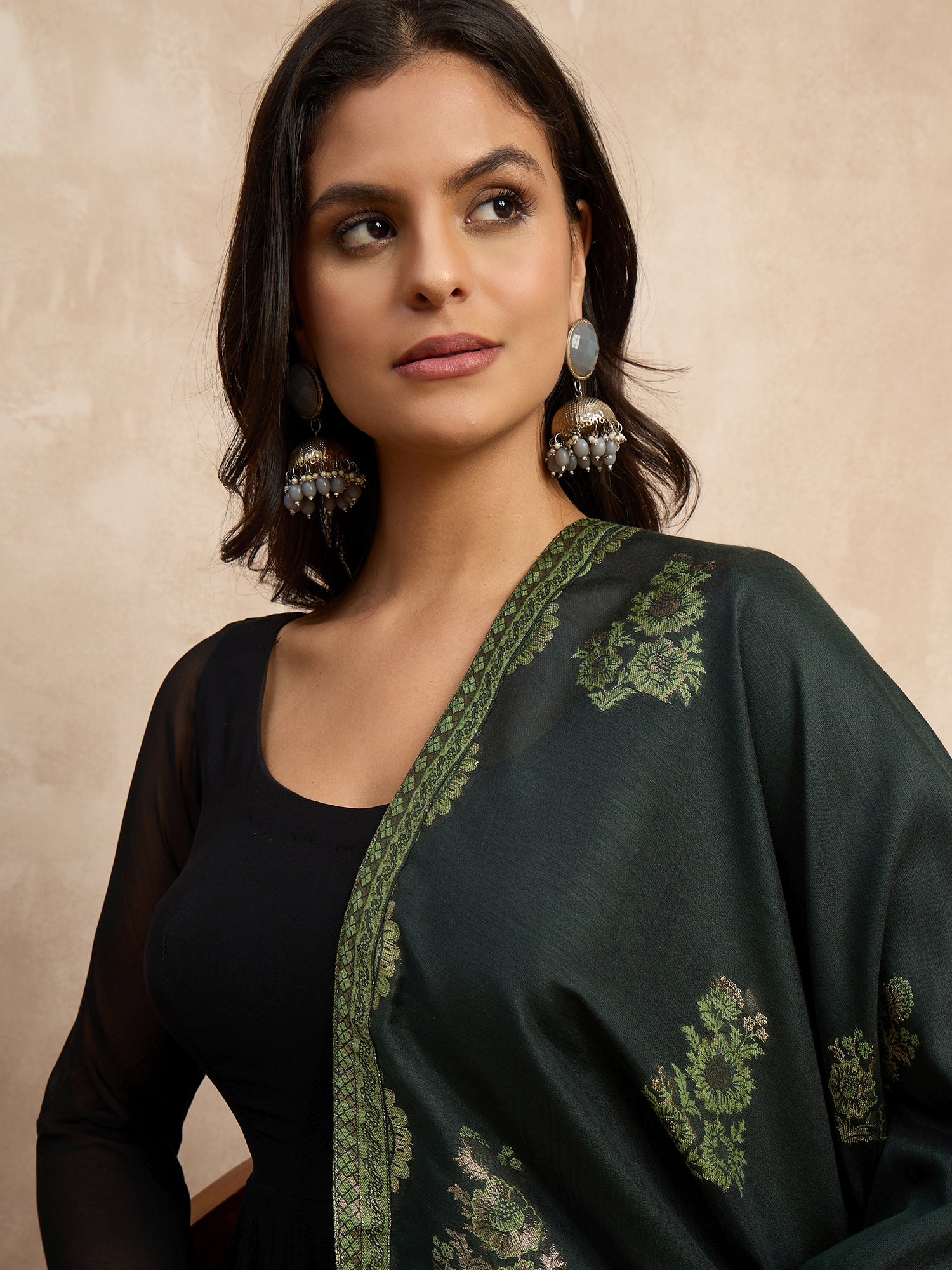 Add an aura of sophistication to your ethnic ensemble with this elegant dark green embroidered organza dupatta. Delicately adorned with intricate floral threadwork in gold and green, it strikes a perfect balance between subtlety and luxury. The lightweight organza fabric flows beautifully, while the scalloped border and striped edge lend it a refined finishing touch.