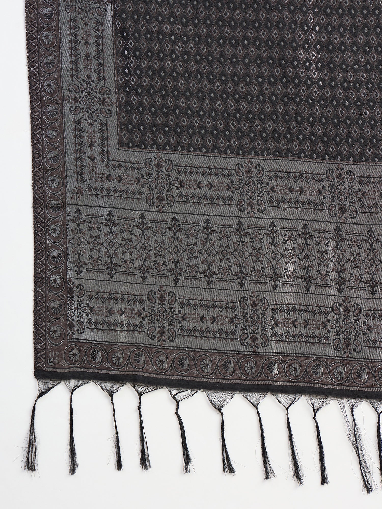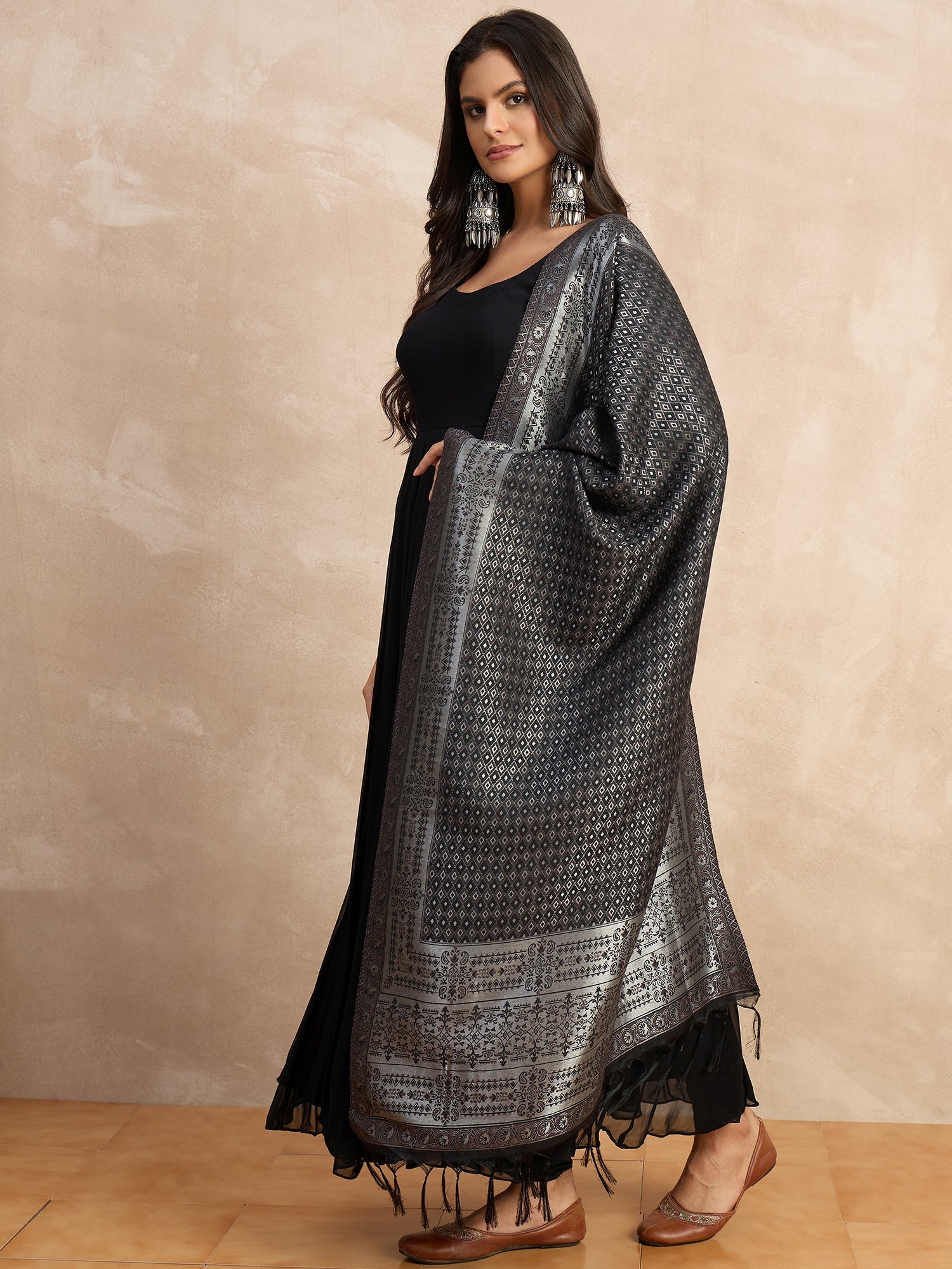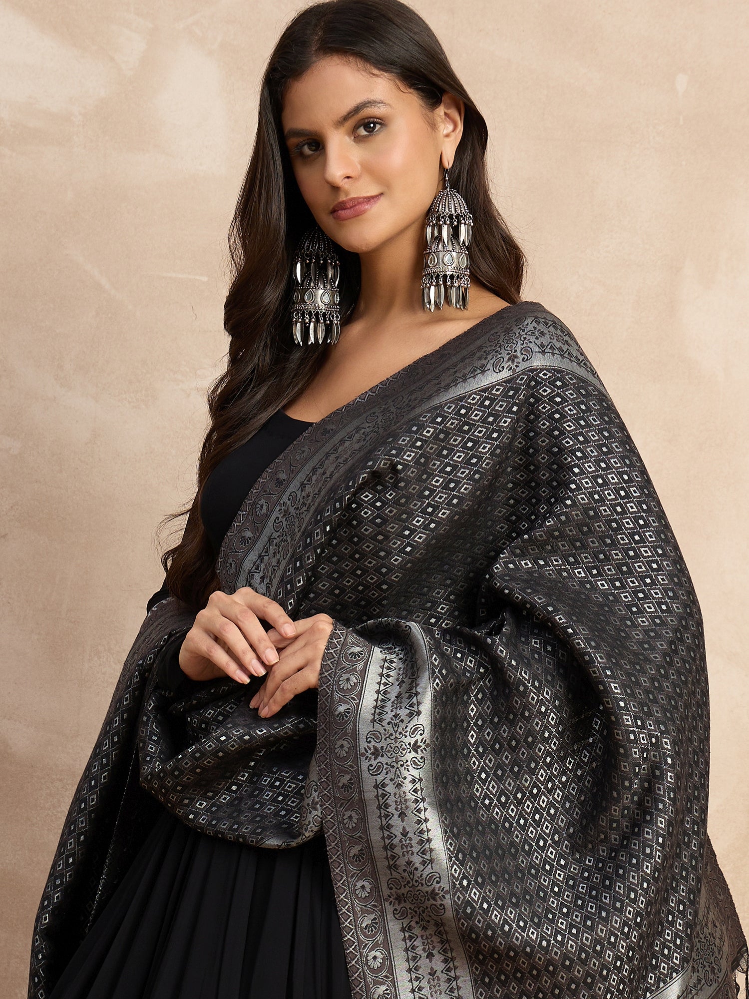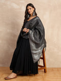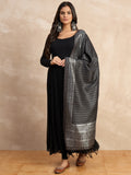 Elevate your ethnic wardrobe with this exquisite black Banarasi silk dupatta, woven with intricate silver zari detailing that exudes timeless grace. The luxurious silk fabric drapes beautifully, while the delicate border and tasselled edges add a touch of traditional charm. Perfect for pairing with festive ensembles or adding a regal finish to simple outfits.