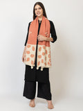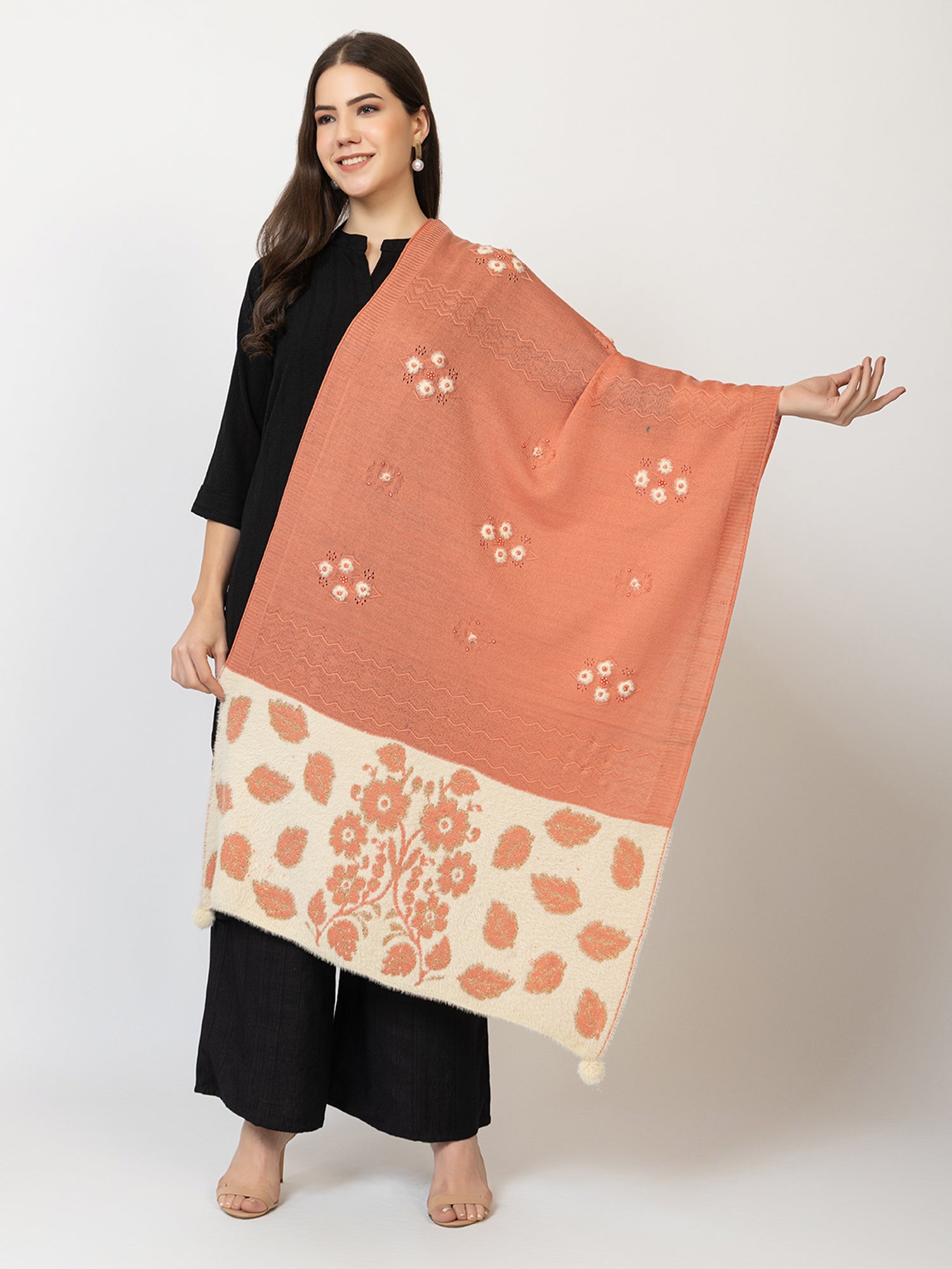 Soft, feminine, and winter-perfect — The Peach Bloom Woollen Shawl is designed to bring warmth and elegance together. Crafted from ultra-soft premium wool, the shawl features delicate embroidered florals on a soothing peach upper panel, paired with an ivory base embellished with leaf and flower motifs. Cute pom-pom tassels complete the look, making it a stylish accessory for festive wear, travel, or everyday winter dressing.