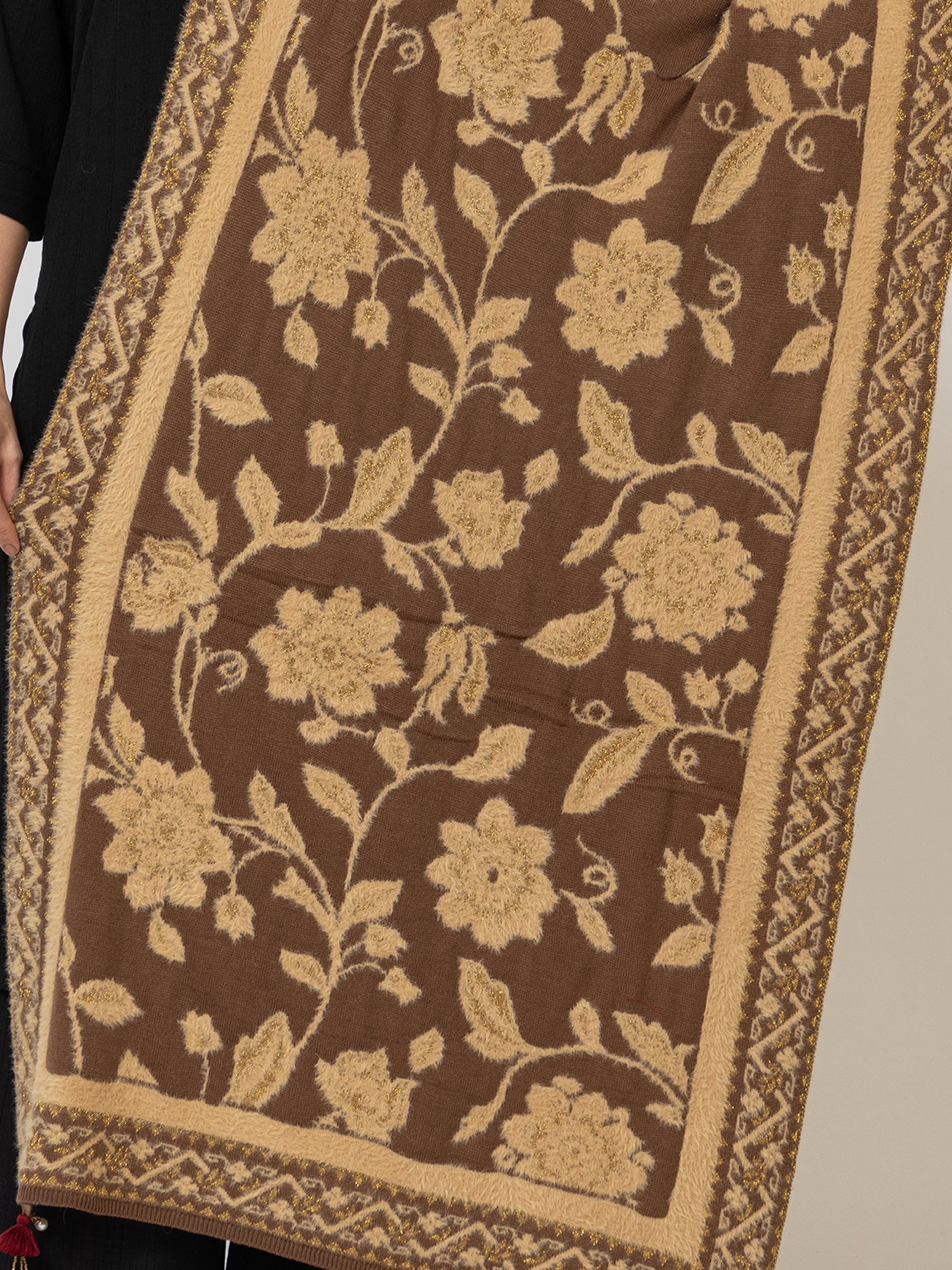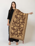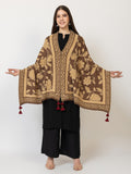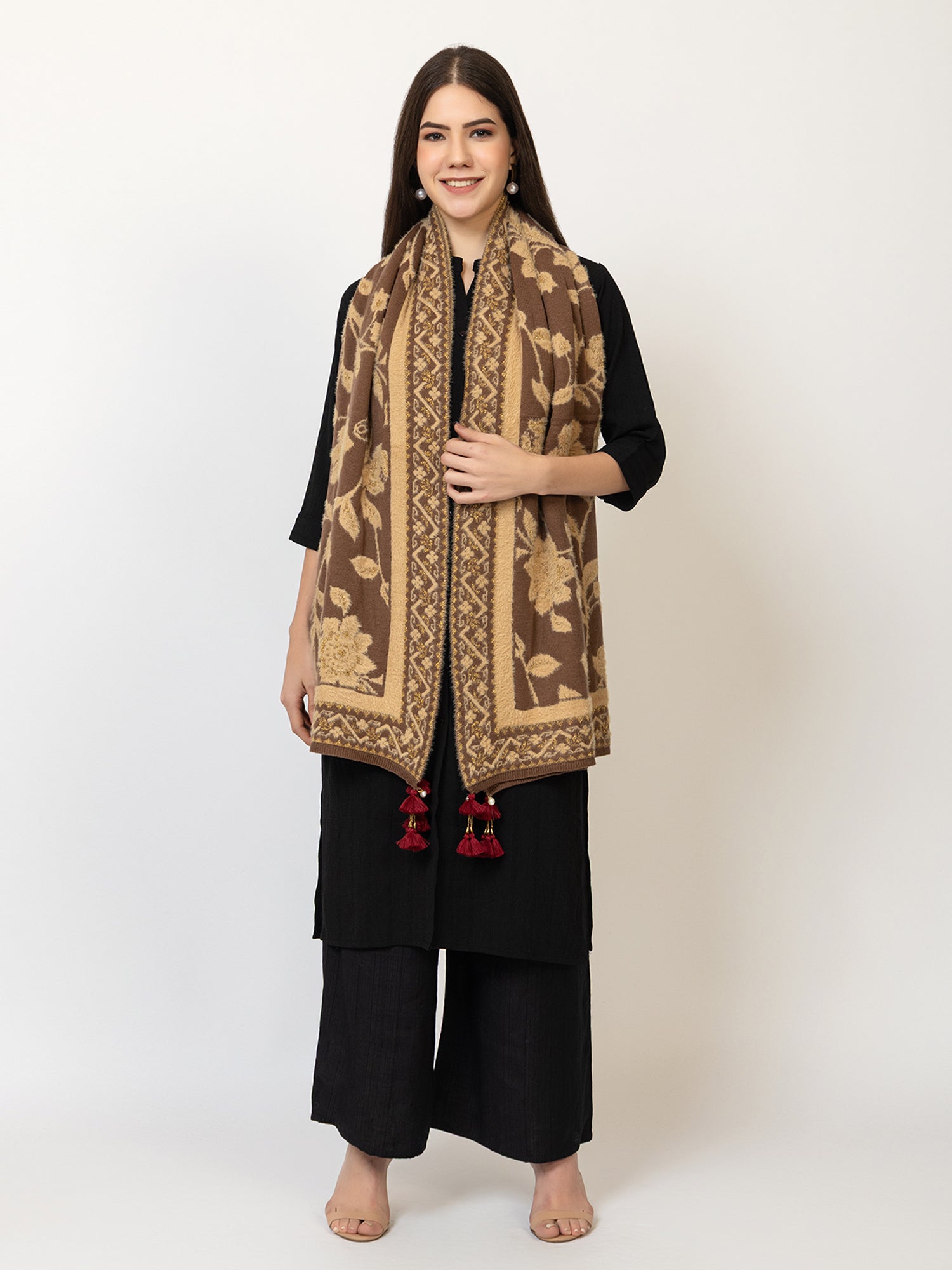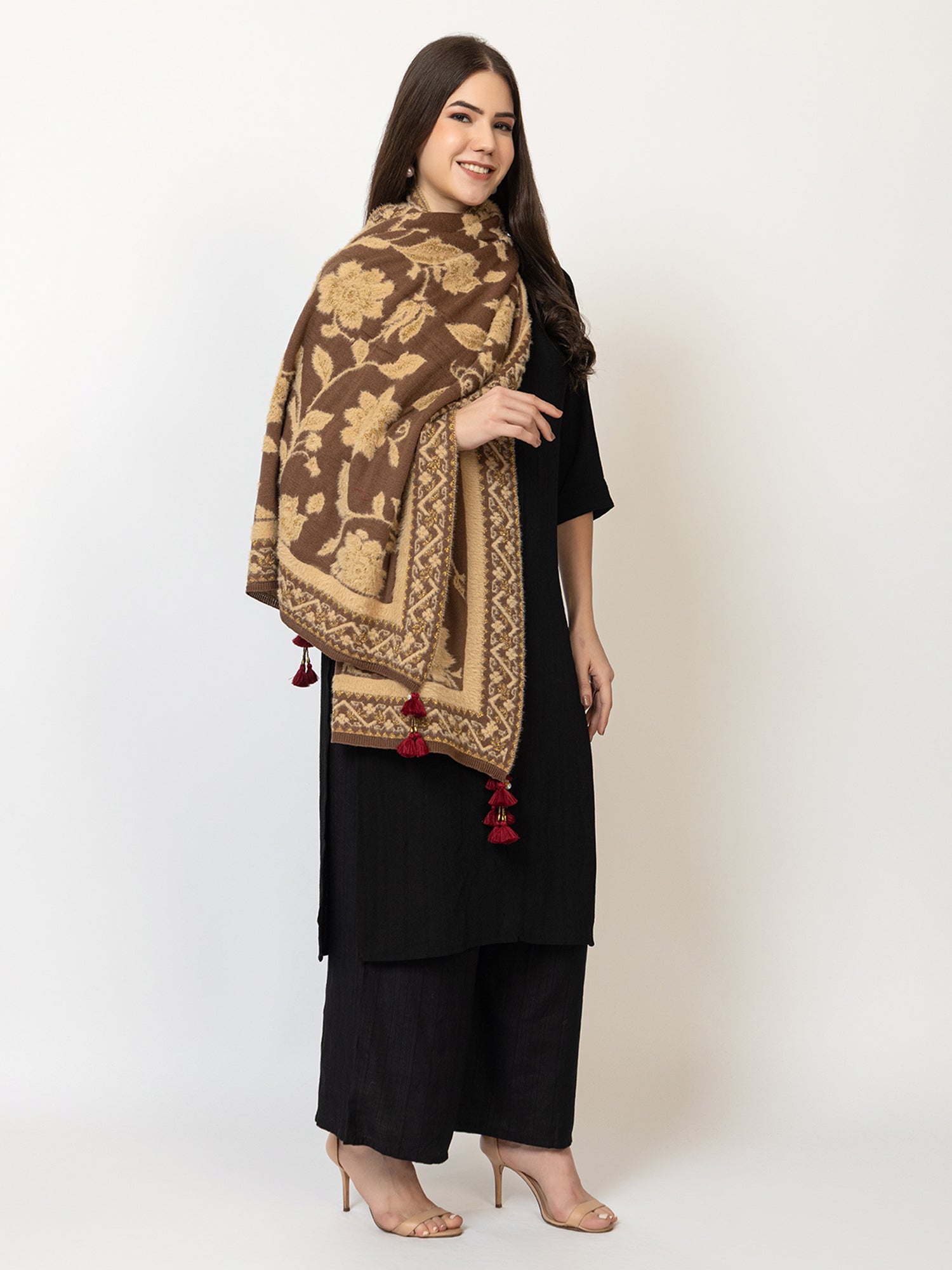 Step into timeless elegance with The Royal Marigold Woollen Shawl, a luxurious winter essential crafted from soft premium wool. Featuring grand floral motifs in warm golden tones set against a rich cocoa-brown backdrop, this shawl exudes classic Kashmiri-inspired charm. The intricate borders and deep red tassels add a regal finishing touch, making it the perfect accessory for festive occasions, weddings, winter outings, and gifting.