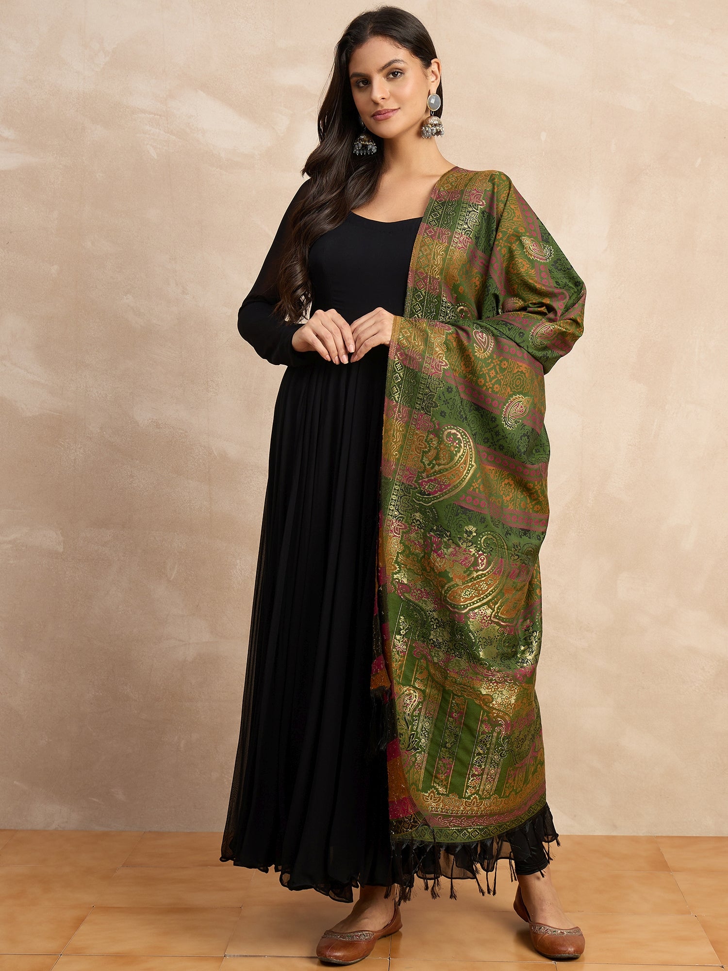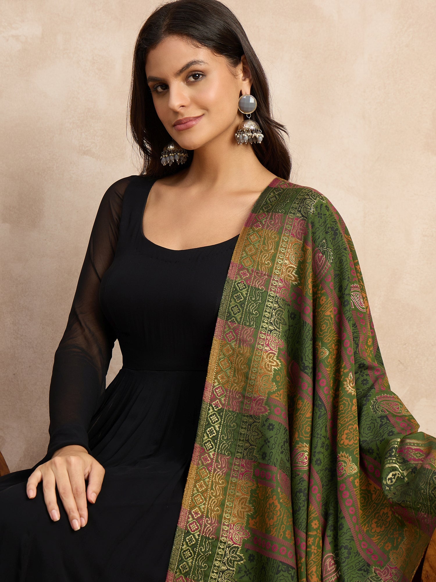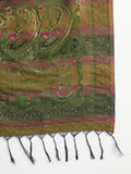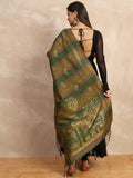 A timeless ode to Indian artistry, this emerald green Banarasi silk dupatta features exquisite gold and magenta zari motifs intricately woven across a lustrous base. The ornate paisley and floral patterns capture the richness of Banaras craftsmanship, while the subtle sheen adds festive grandeur. Perfect for elevating both classic and contemporary ensembles, it’s a versatile piece that brings royal charm to any occasion.