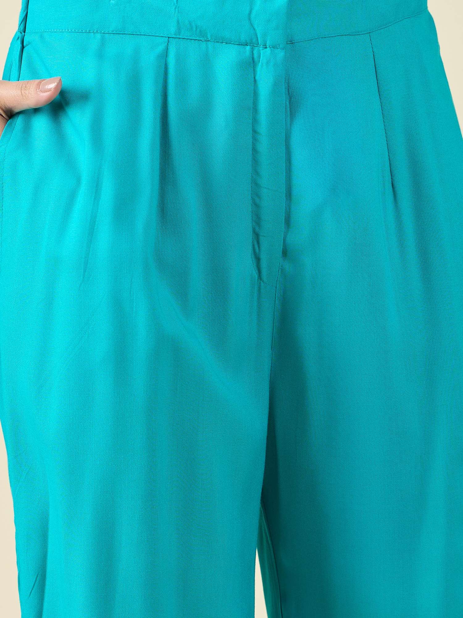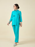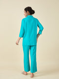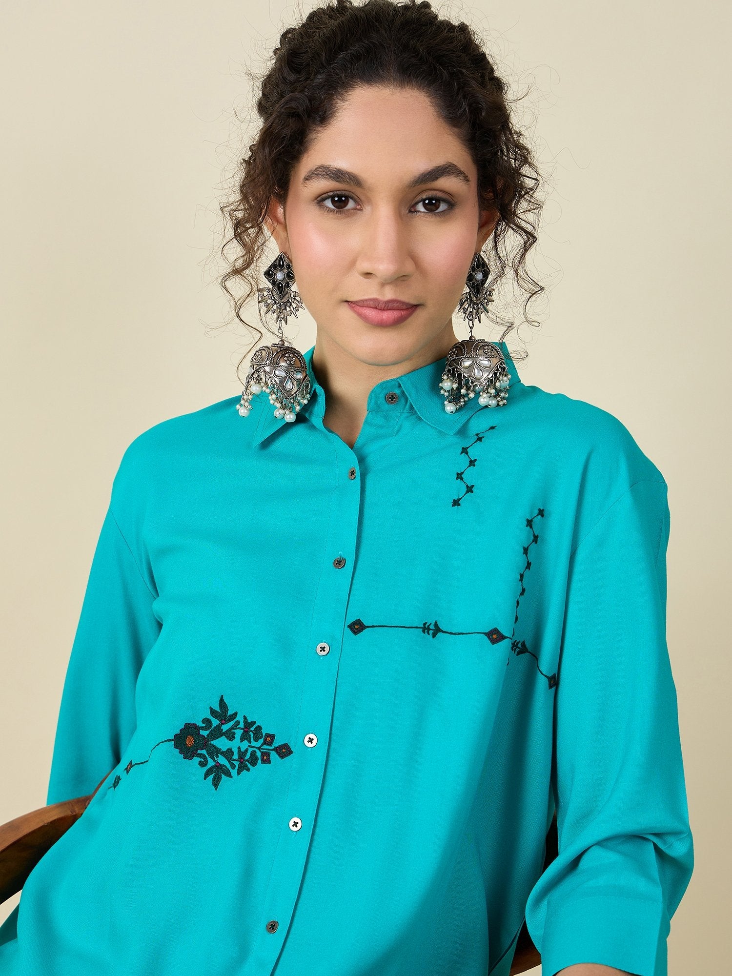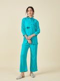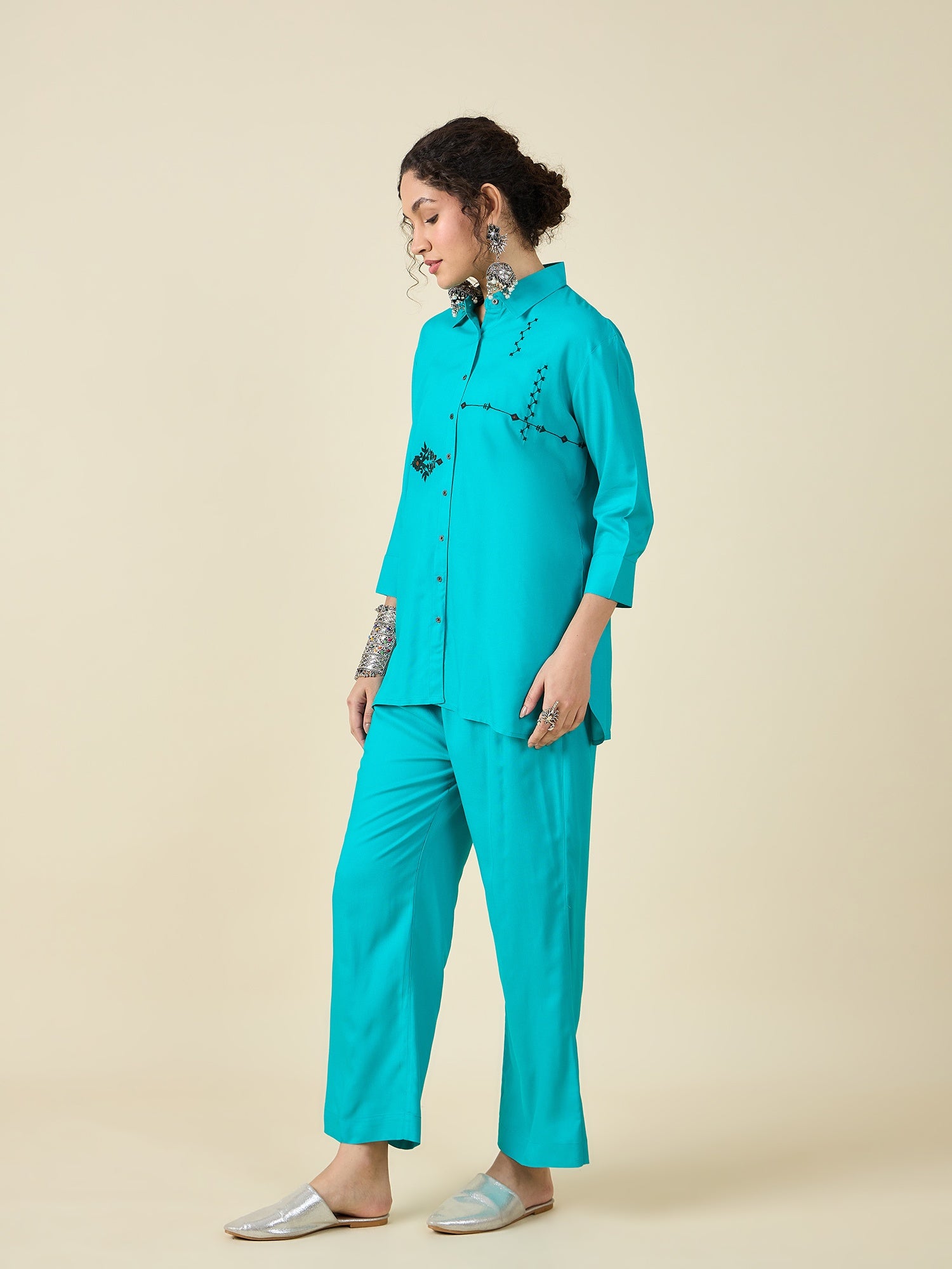 Add a splash of color to your everyday wardrobe with this bold turquoise co-ord set from STADO. Featuring delicate black embroidery that draws attention to the shoulder and side panel, this relaxed-fit button-down shirt exudes effortless charm. The coordinating straight-fit pants complete the breezy, contemporary silhouette — perfect for brunches, travel, or artistic outings.