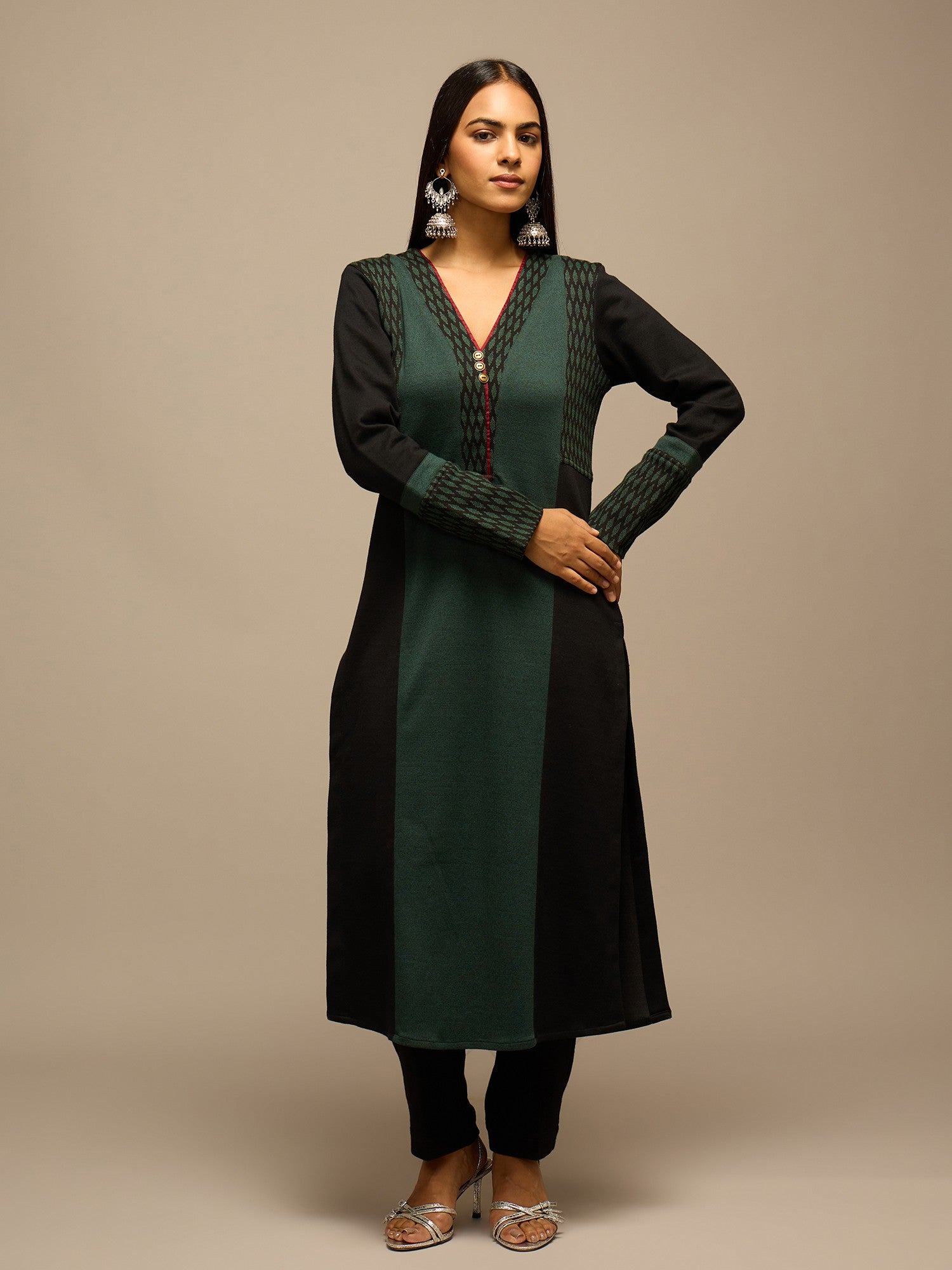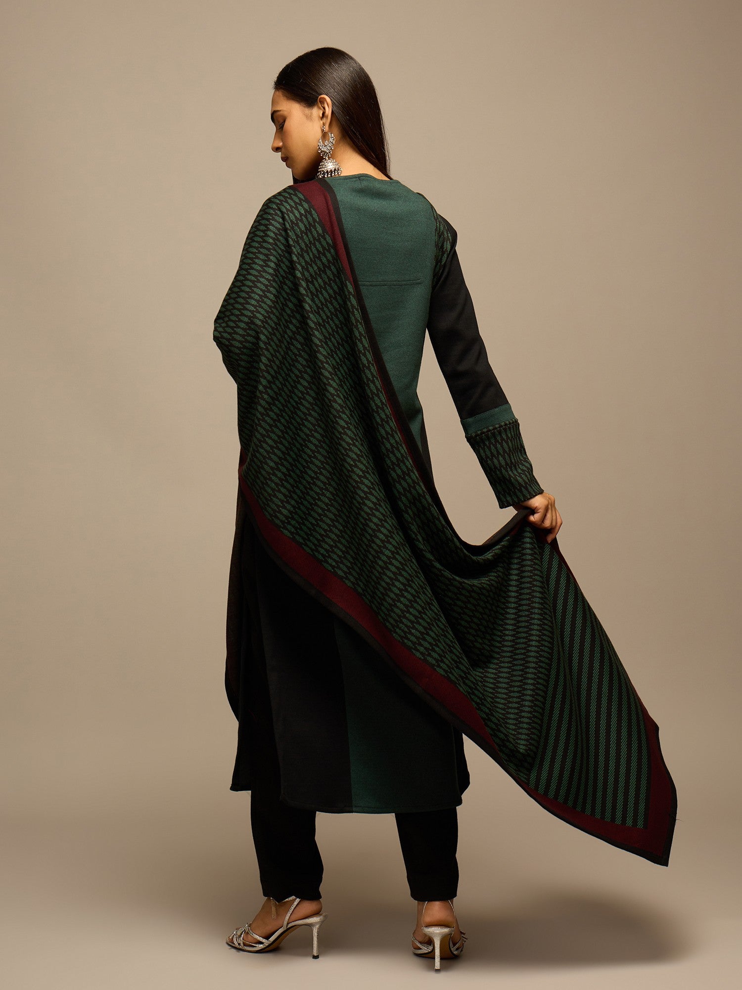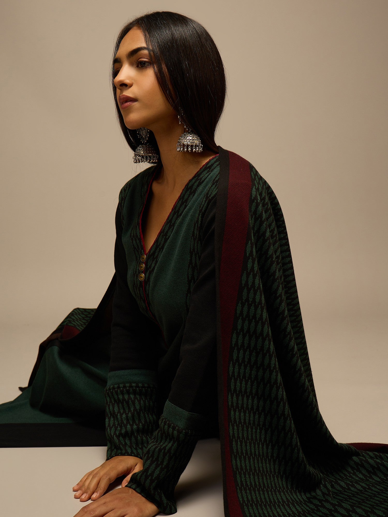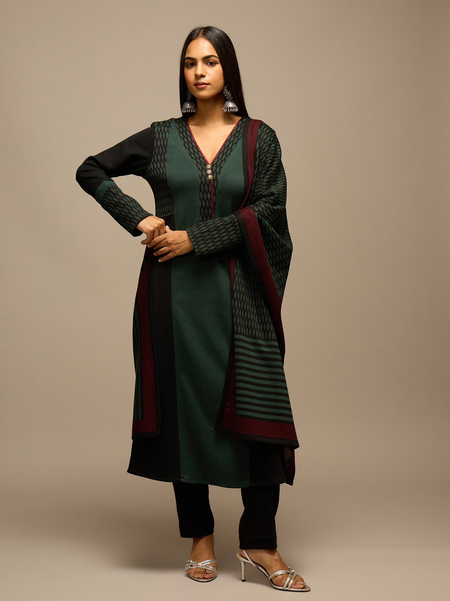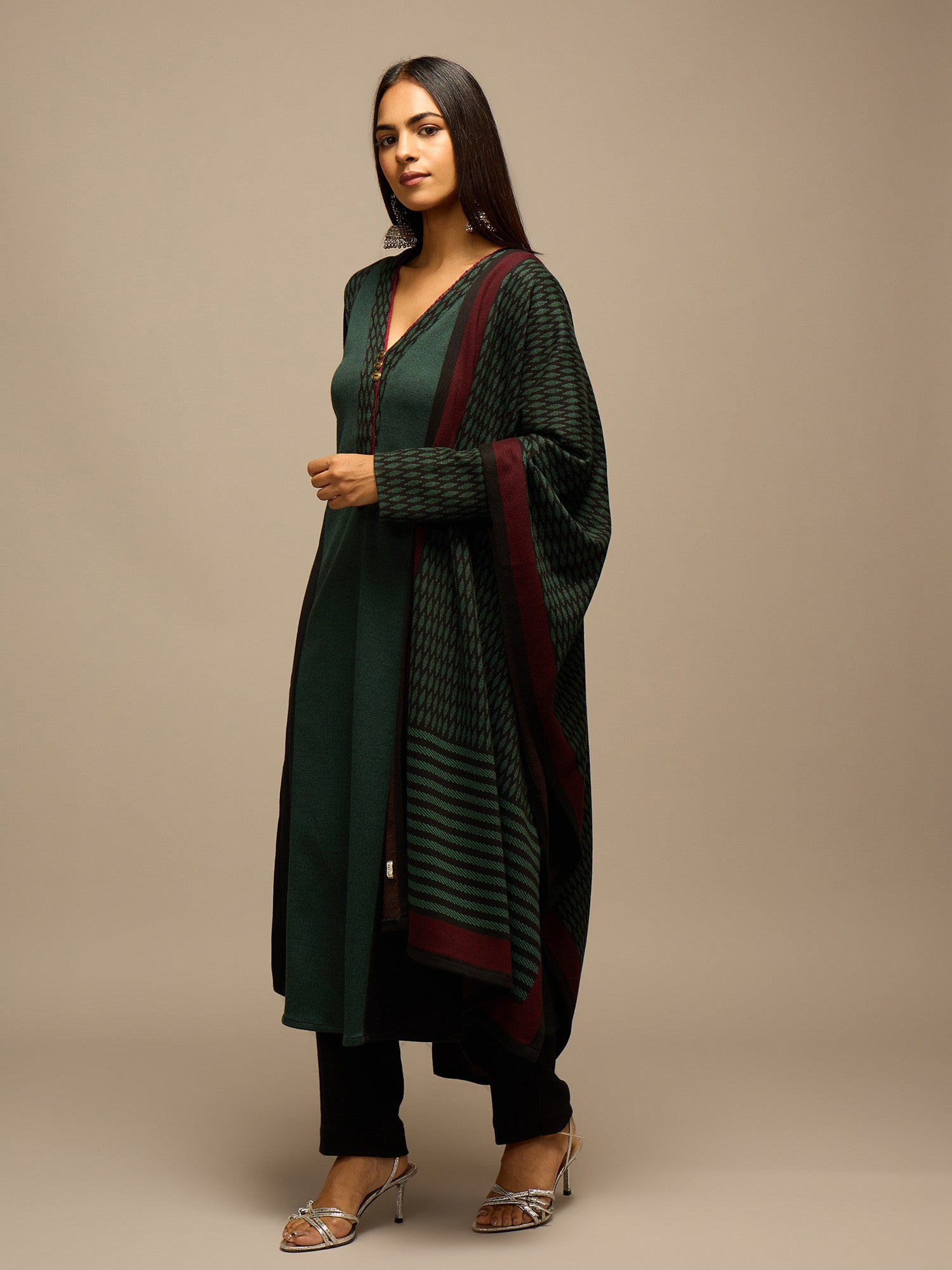 Elevate your semi-formal wardrobe with this stunning verdant green kurta set. Crafted in soft knitted cotton, the kurta features a ban collar with a V-neck, exuding subtle sophistication. Its bold embroidery and striking prints on the front make a chic statement, perfectly complemented by regular-fit pants and a coordinating printed stole. Designed to offer both comfort and contemporary style, this ensemble is ideal for evening gatherings or refined daytime occasions, keeping you cozy, confident, and effortlessly elegant.